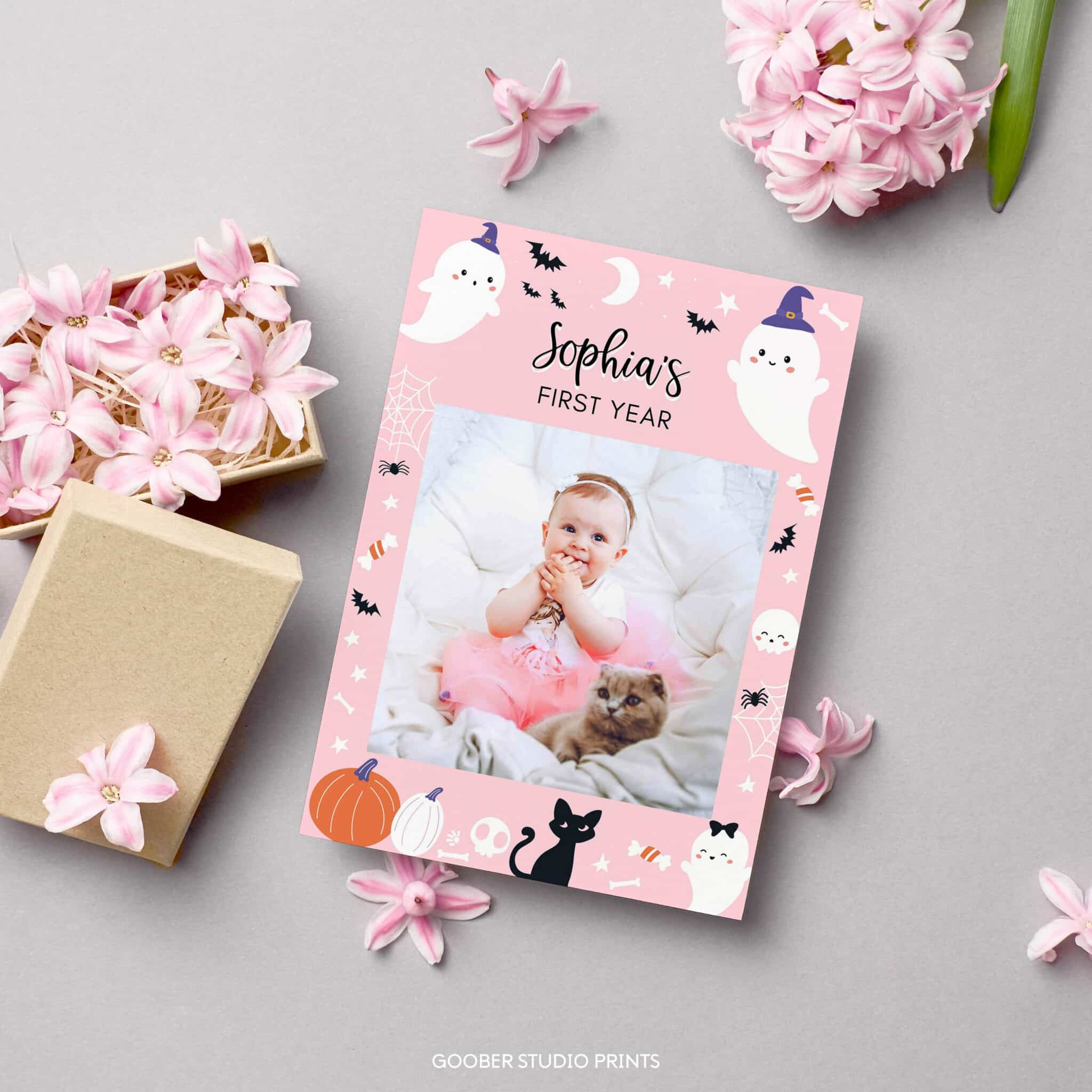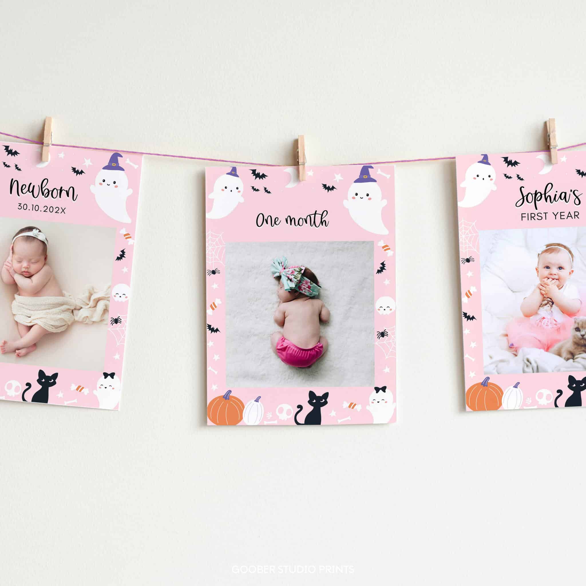 Celebrate your baby girl’s first year with our spooky one halloween birthday party ghost photo banner! Featuring adorable ghosts, pumpkins, and festive Halloween colors, this banner includes space for 12 monthly photos along with your child’s name and age. Easy to customize and print at home on standard 5×7 inch paper, it’s perfect for displaying at a girl birthday celebration or keeping as a special memento from your spooky one halloween birthday party.