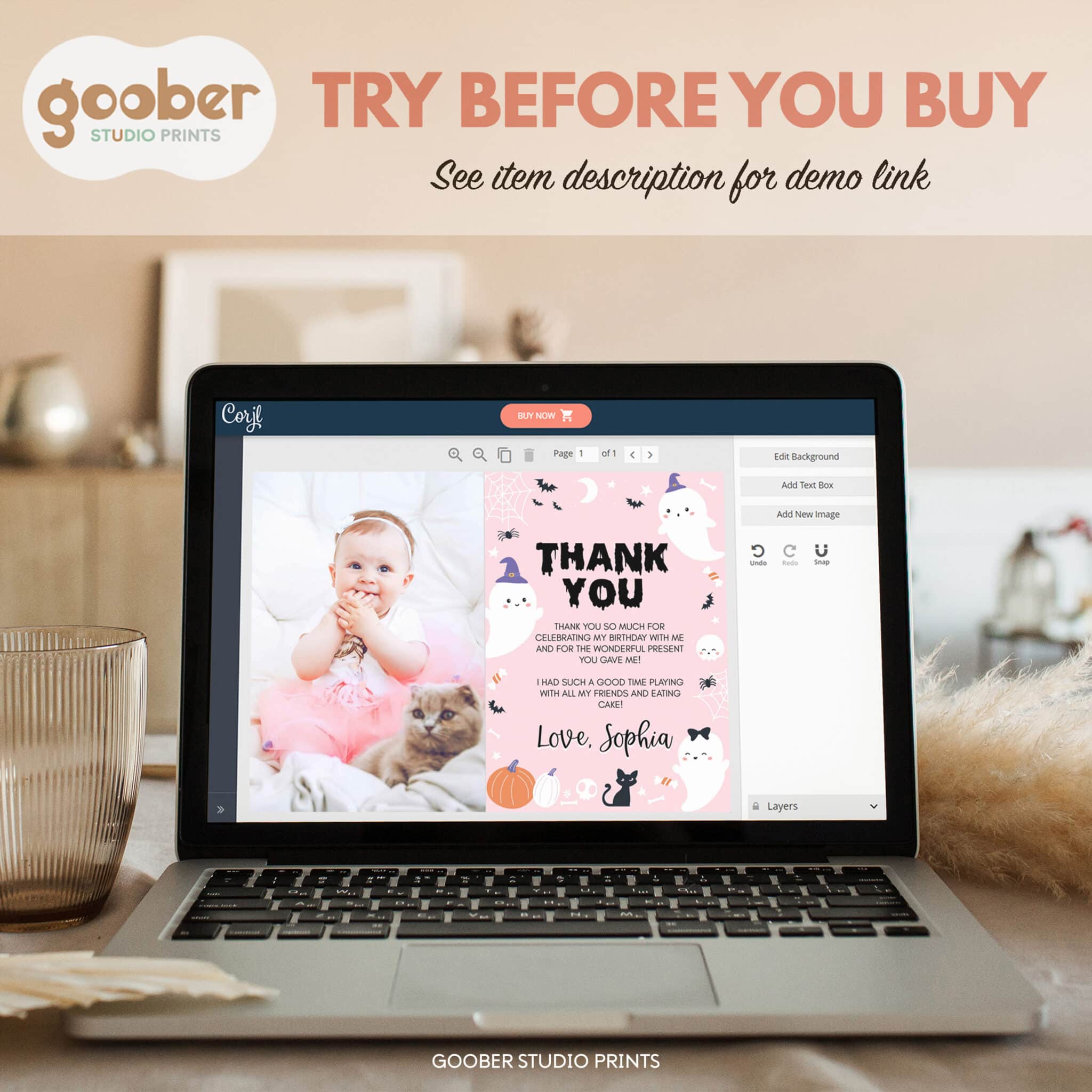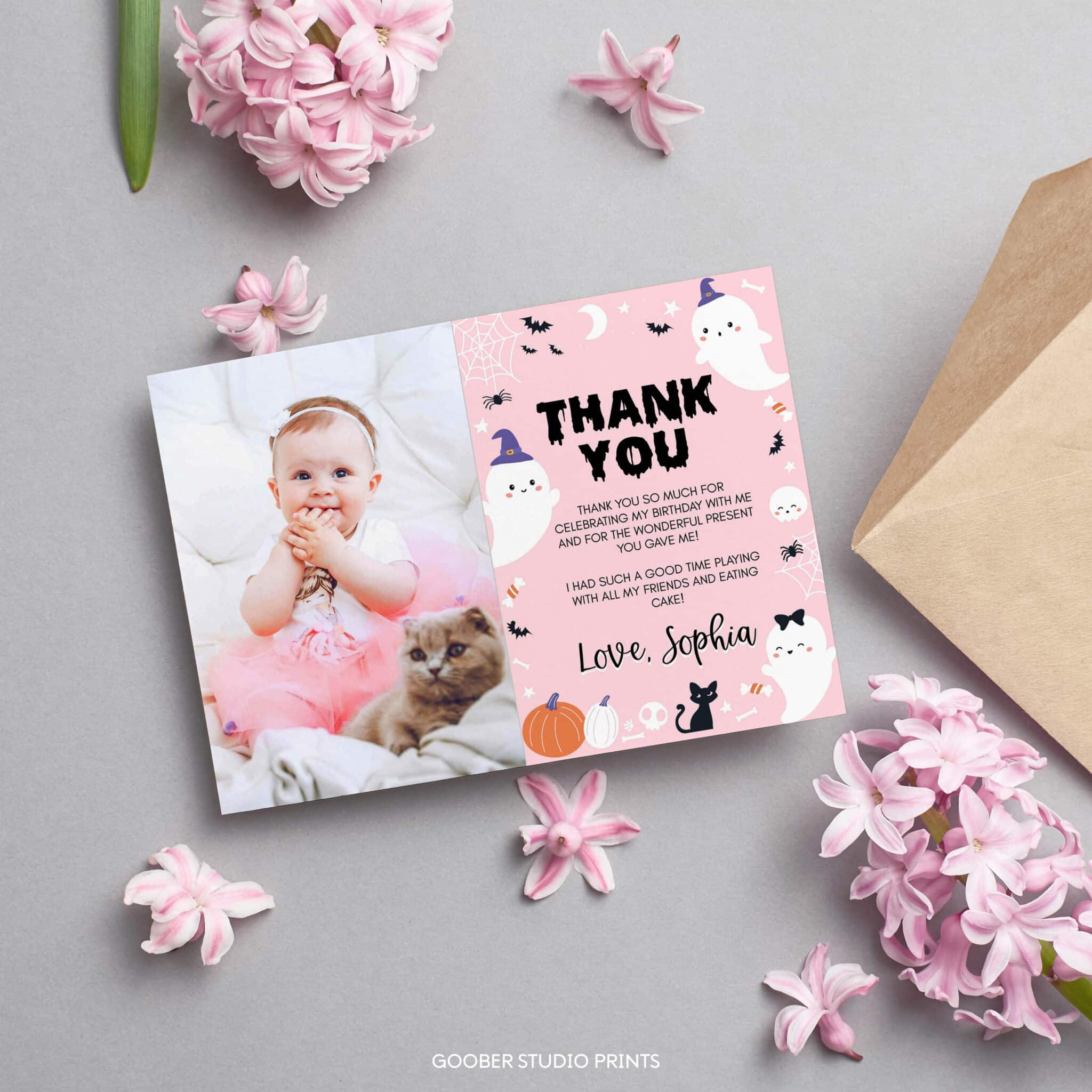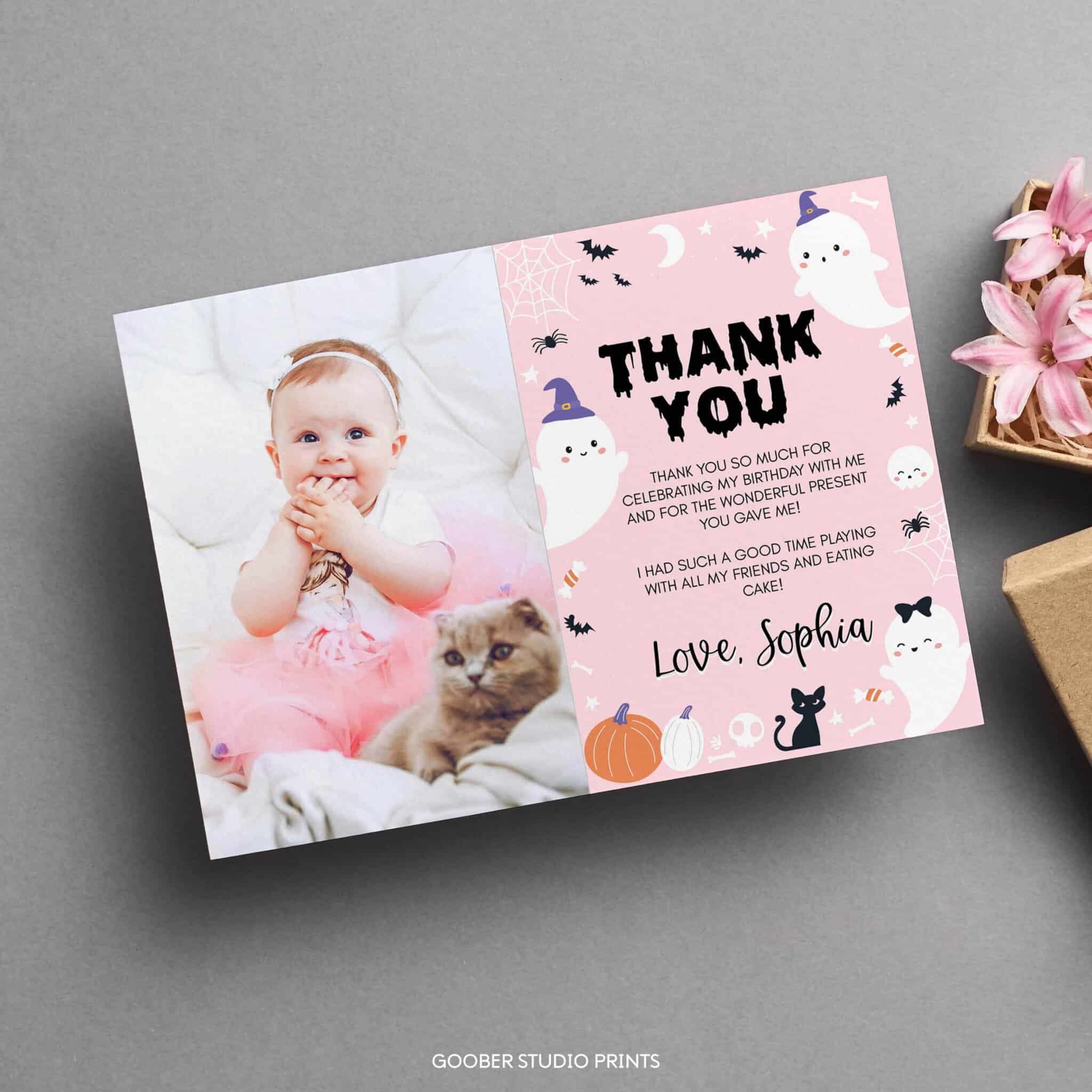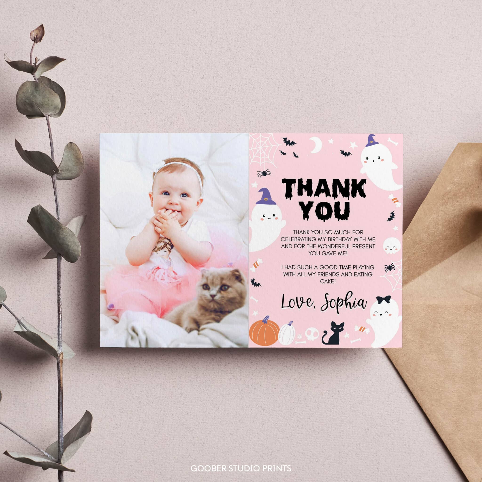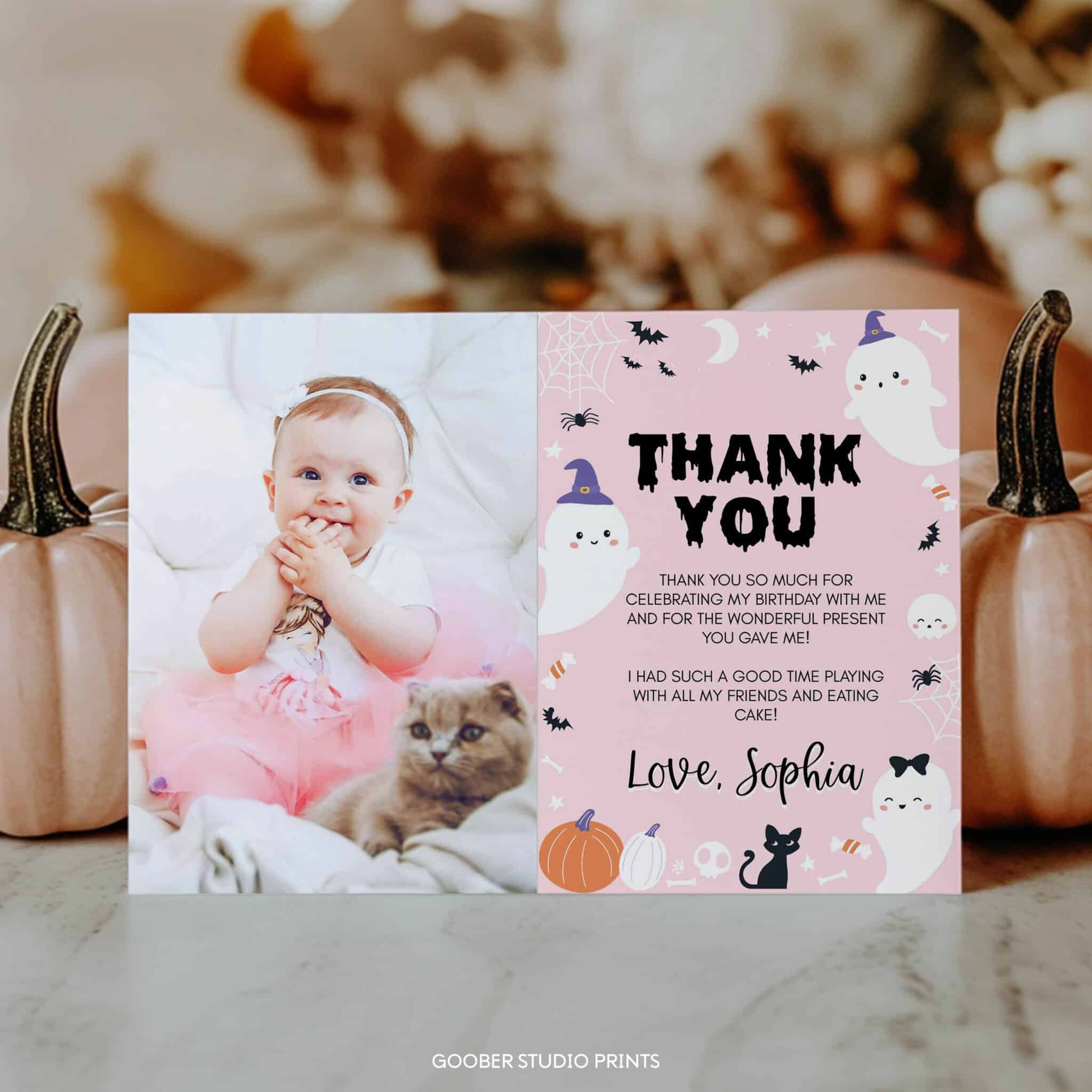 Show your appreciation with our spooky one halloween birthday party ghost thank you cards! Featuring cute ghosts, pumpkins, and festive Halloween details, these cards offer space for a personalized message to thank guests for joining your girl birthday celebration. Easy to print at home on standard cardstock, they’re the perfect finishing touch for your spooky one halloween birthday party.