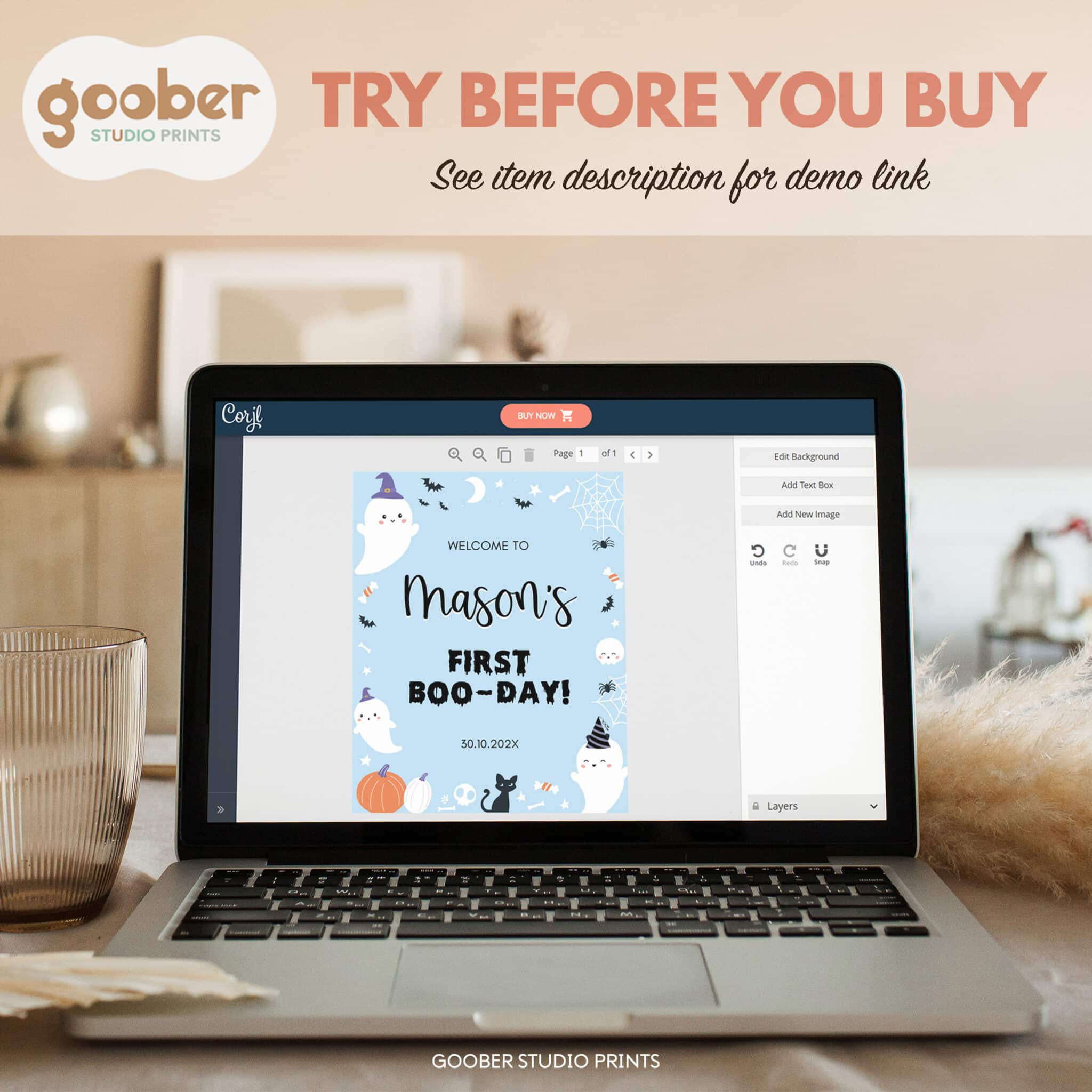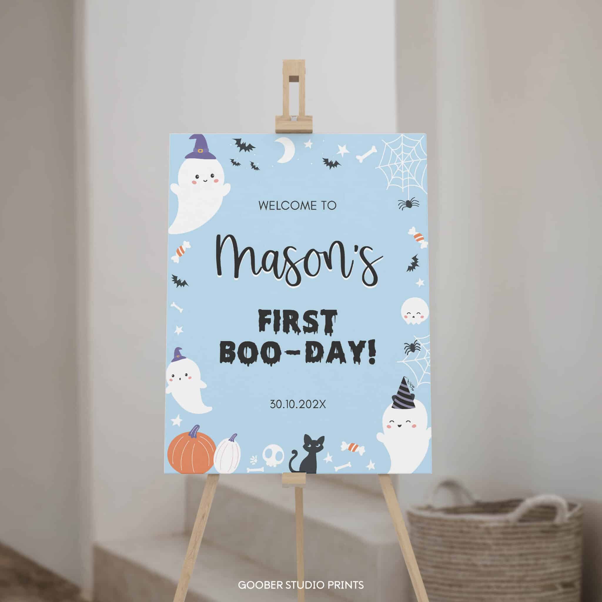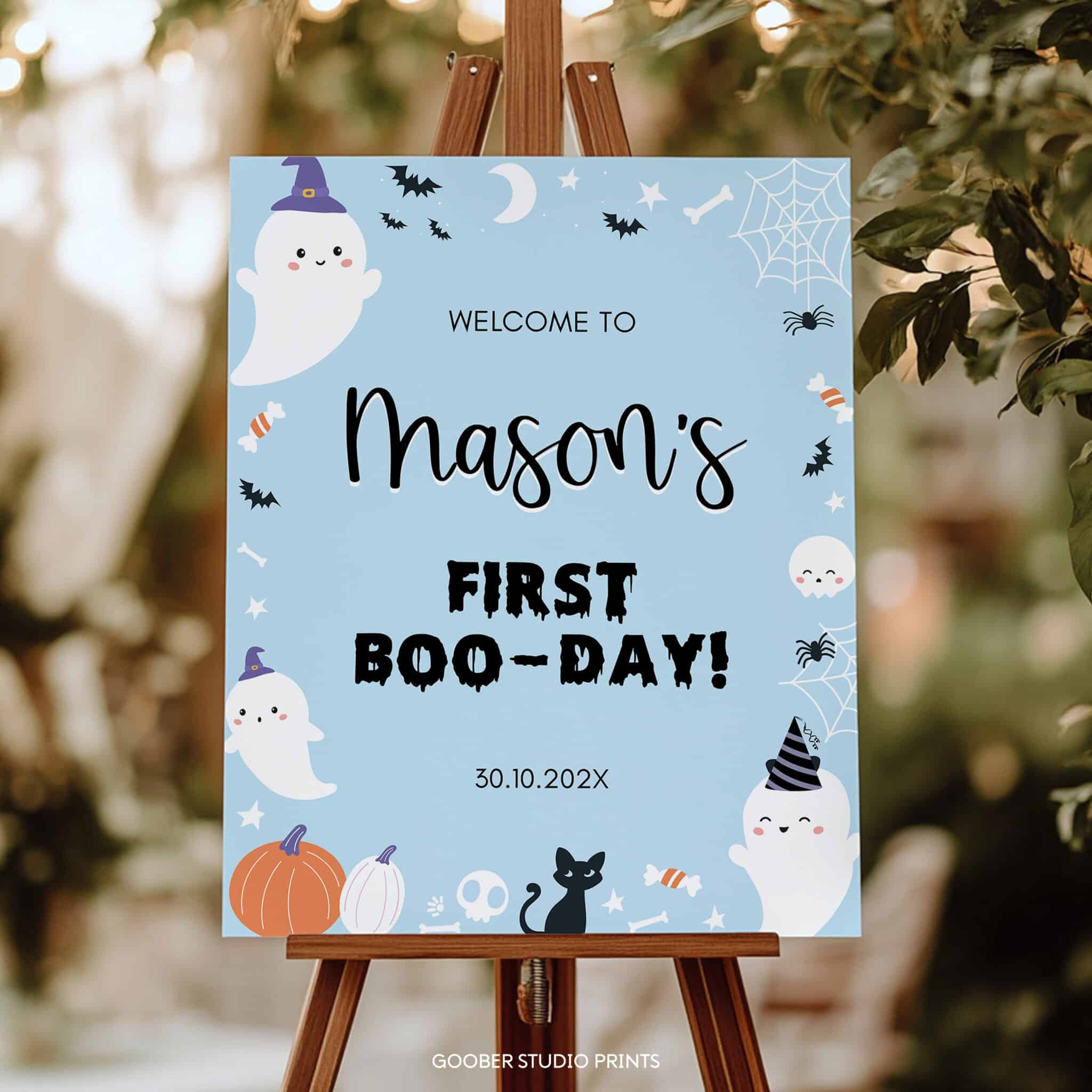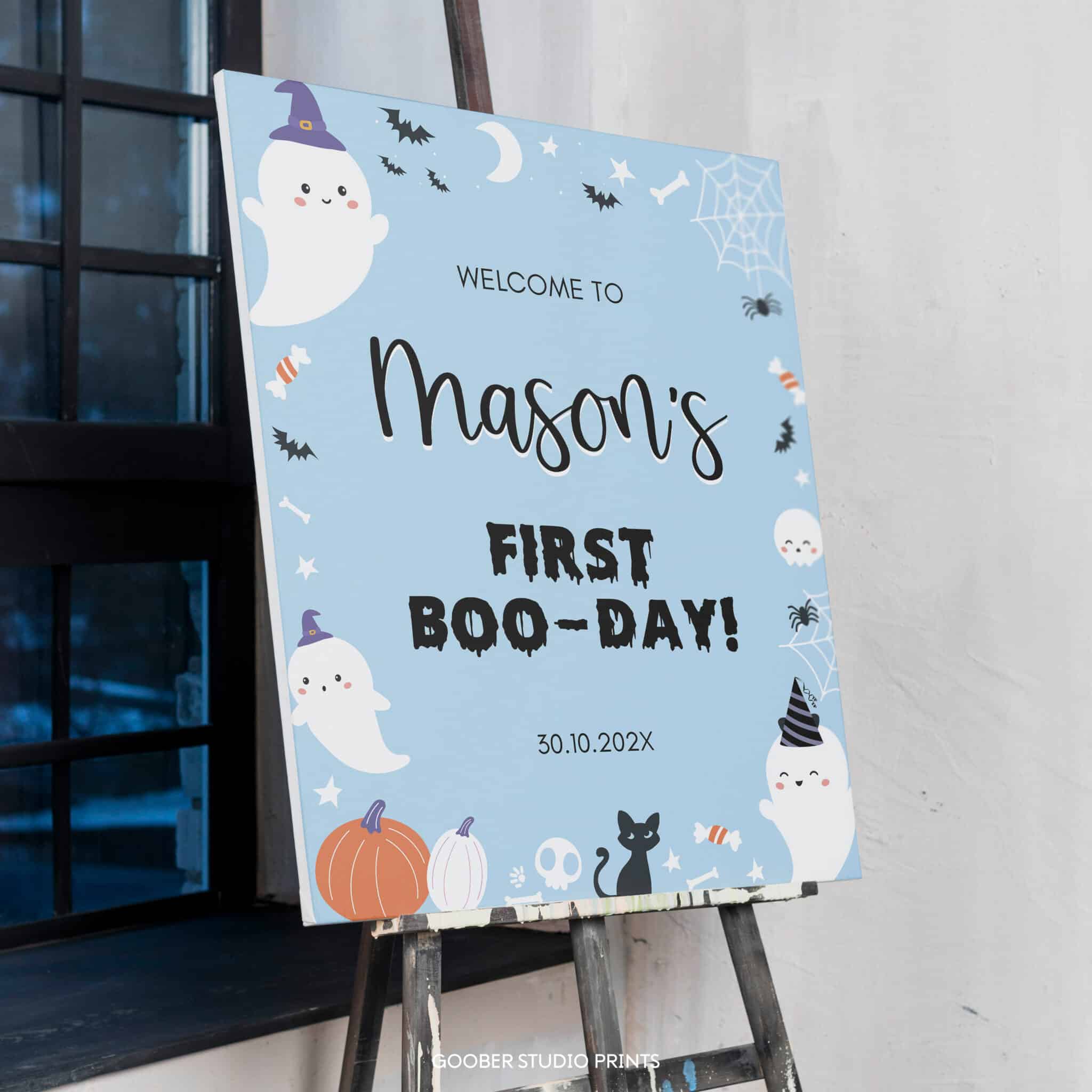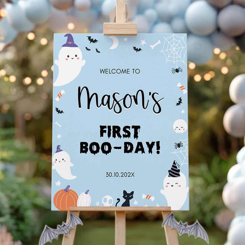 Set the tone for your halloween birthday party with our spooky one ghost welcome sign! Featuring playful ghosts, pumpkins, and festive Halloween accents, it’s perfect for a boy birthday celebration. Personalize with your child’s name and age, then print and display at the entrance, dessert table, or photo area. A spooky-cute way to complete your spooky one halloween birthday party decor!