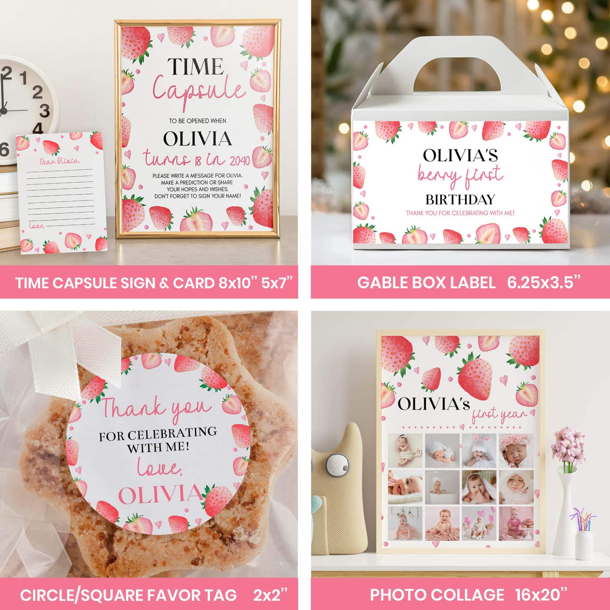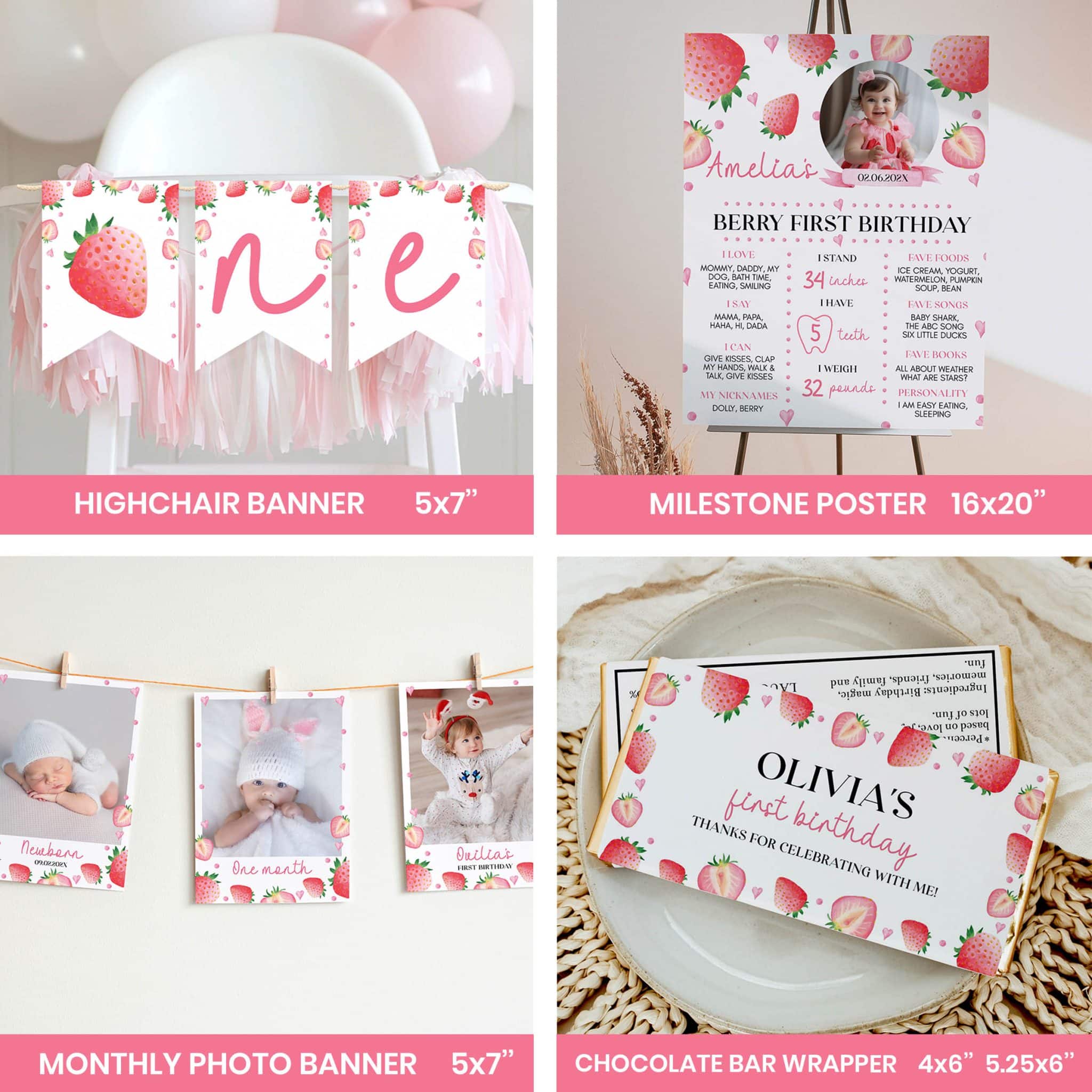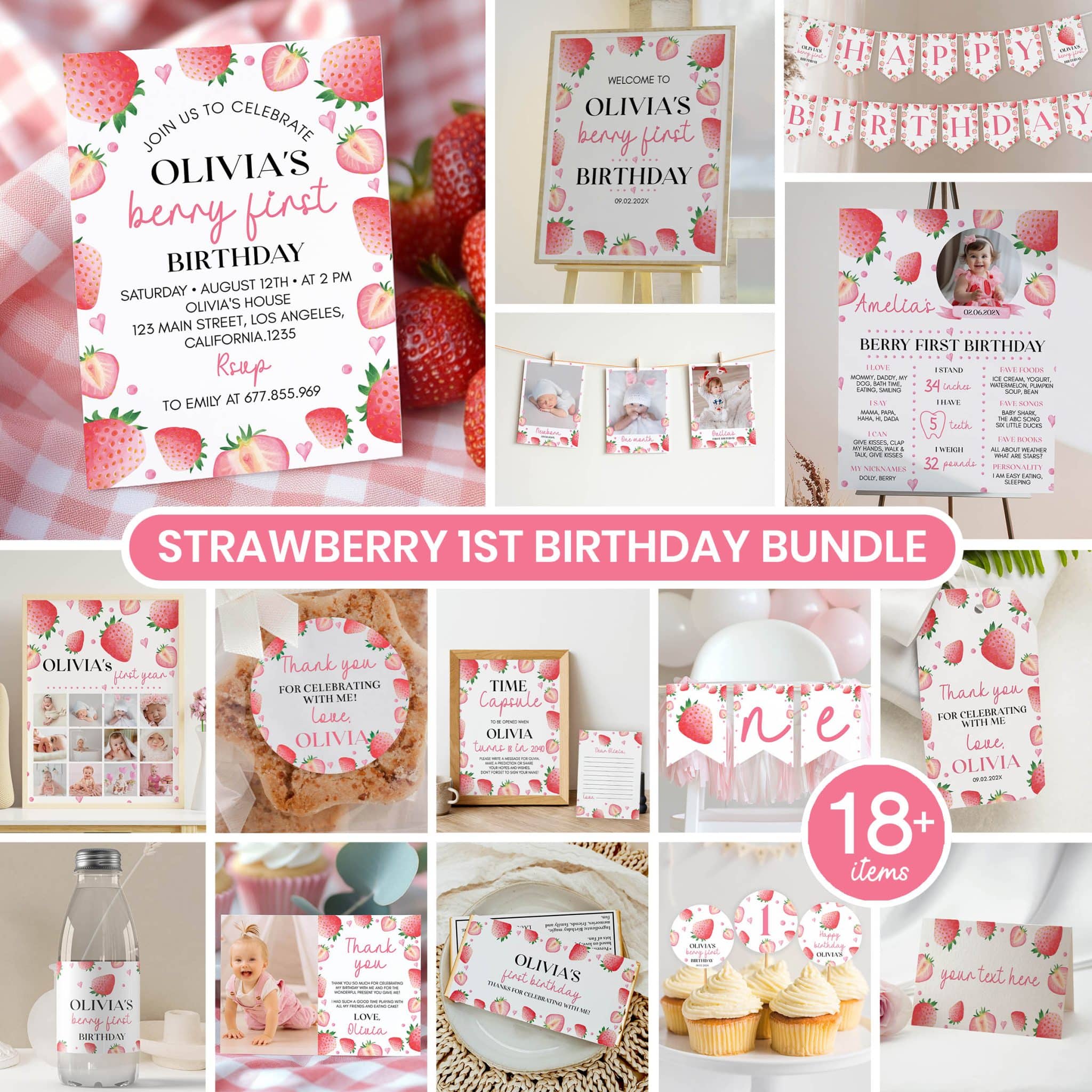 Celebrate in style with our berry sweet strawberry-themed birthday bundle! Perfect for your little girl’s special day, this all-in-one set features adorable strawberry and fruit illustrations to match your party décor. It includes invitations, banners, cupcake toppers, favor tags, and more—customizable with her name, date, and details for a berry first birthday to remember!