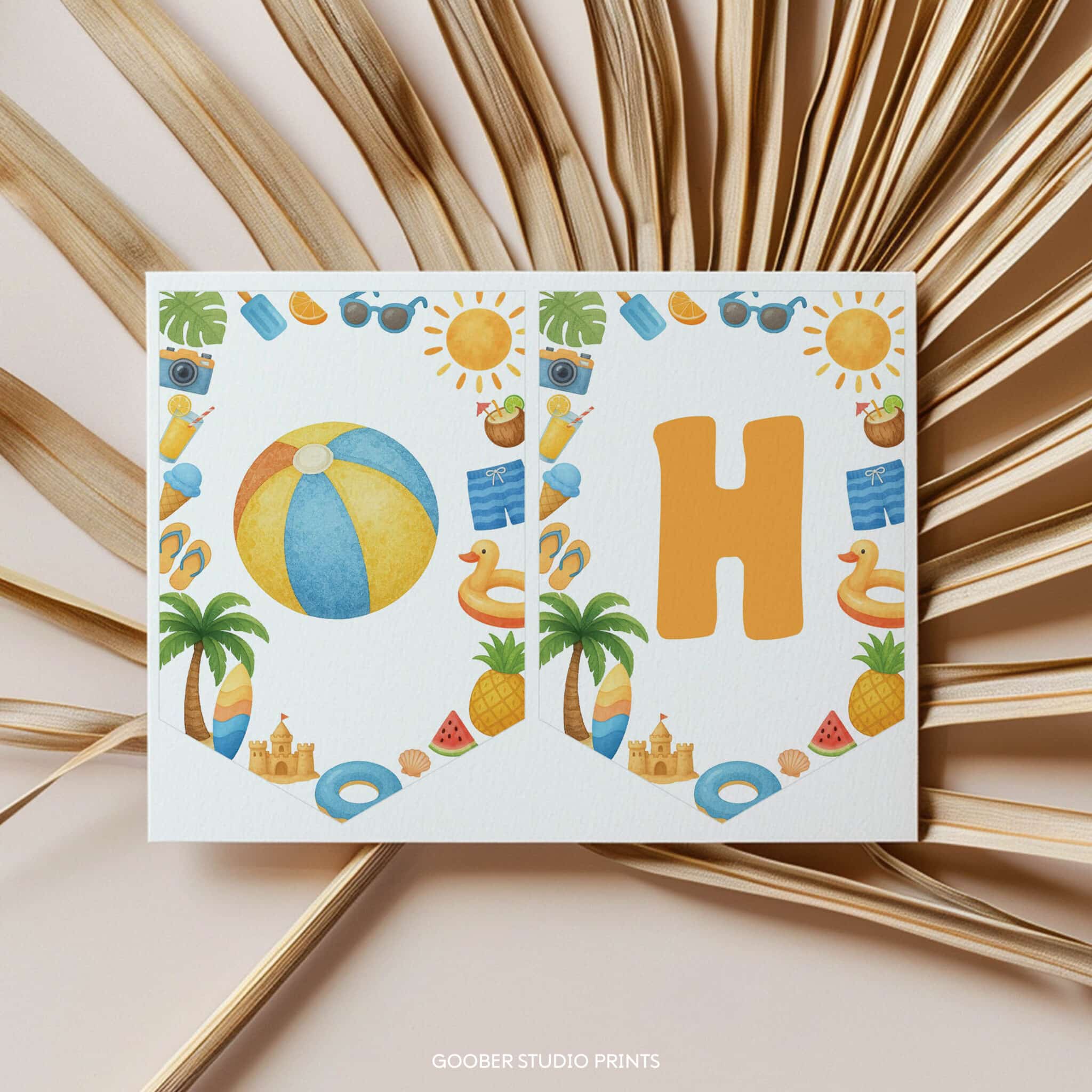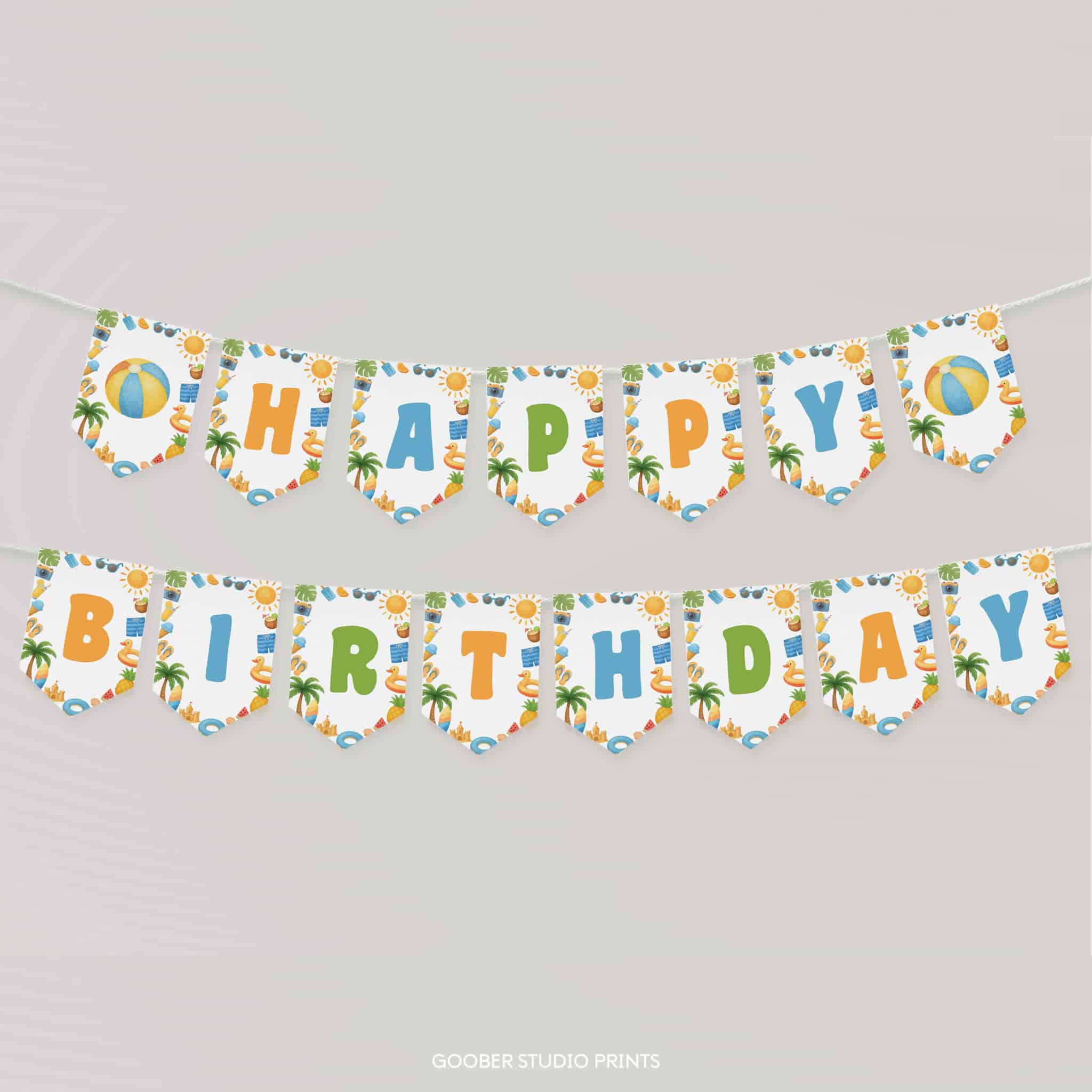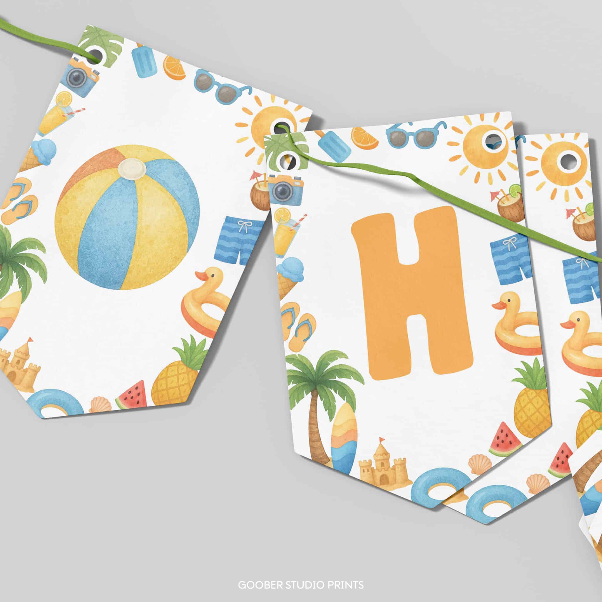 Bring the sunshine to your celebration with our one in the sun happy birthday banner—perfect for your summer birthday party! Ideal for a beach birthday or a splashy pool party, this vibrant banner features cheerful sun, and tropical elements in a playful, sunny design. It spells out ‘Happy Birthday’ in bright, beachy style and can be personalized with your child’s name and age. Simply print at home and hang it to create a warm, festive one in the sun atmosphere. A must-have decoration for your little one’s sunny celebration!