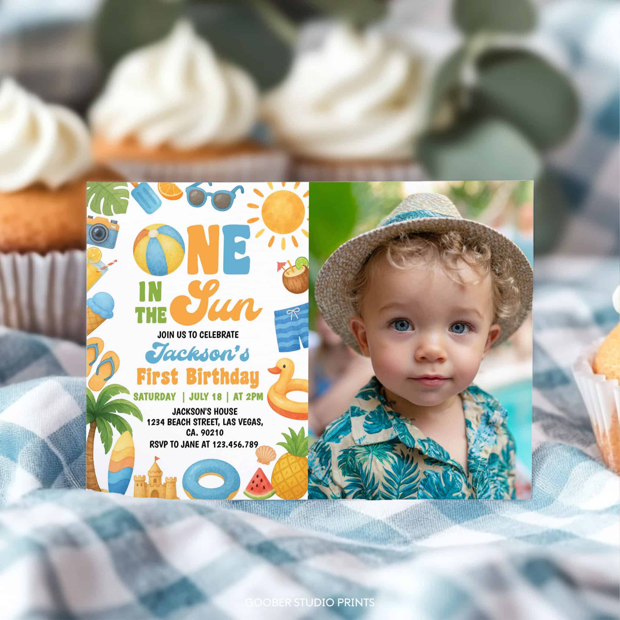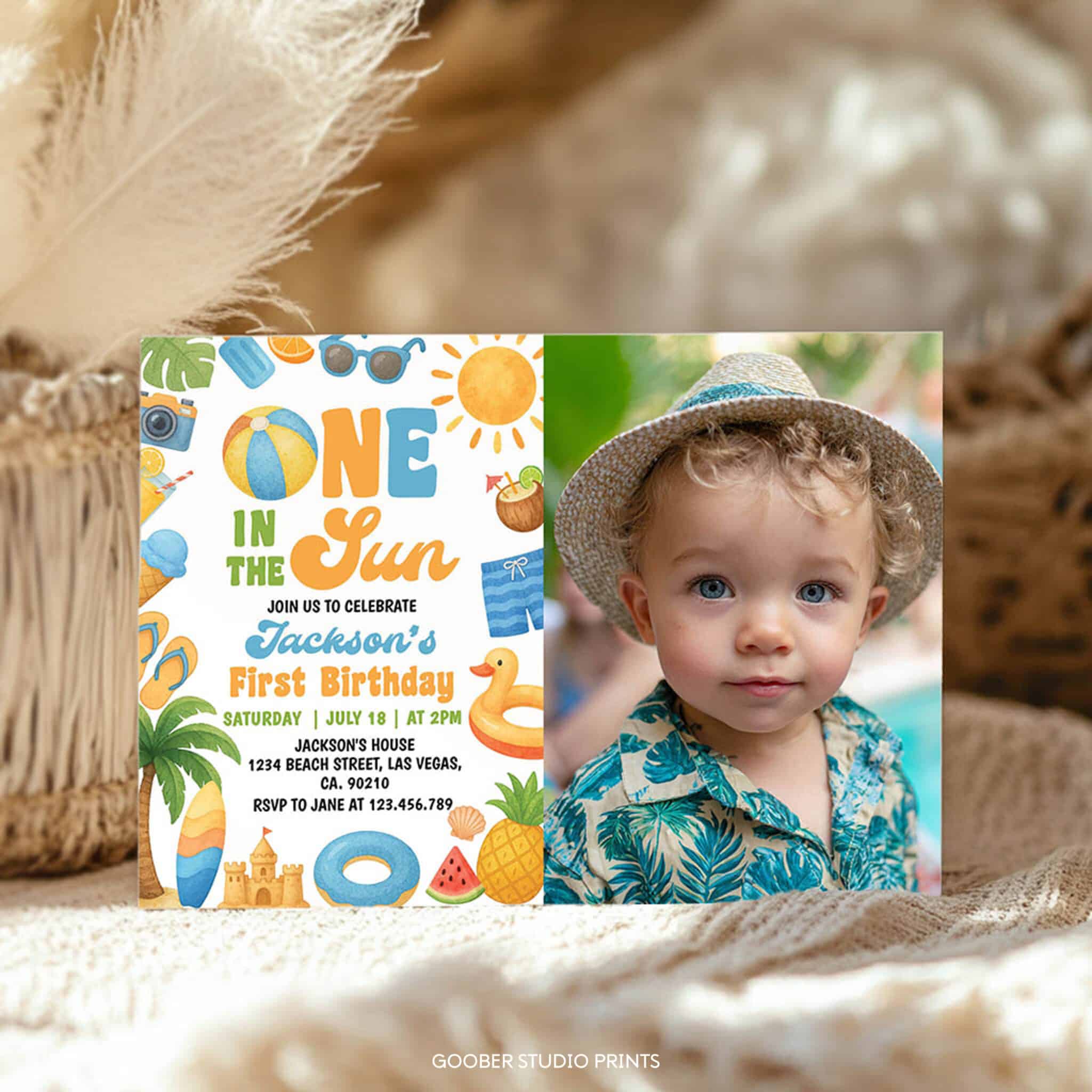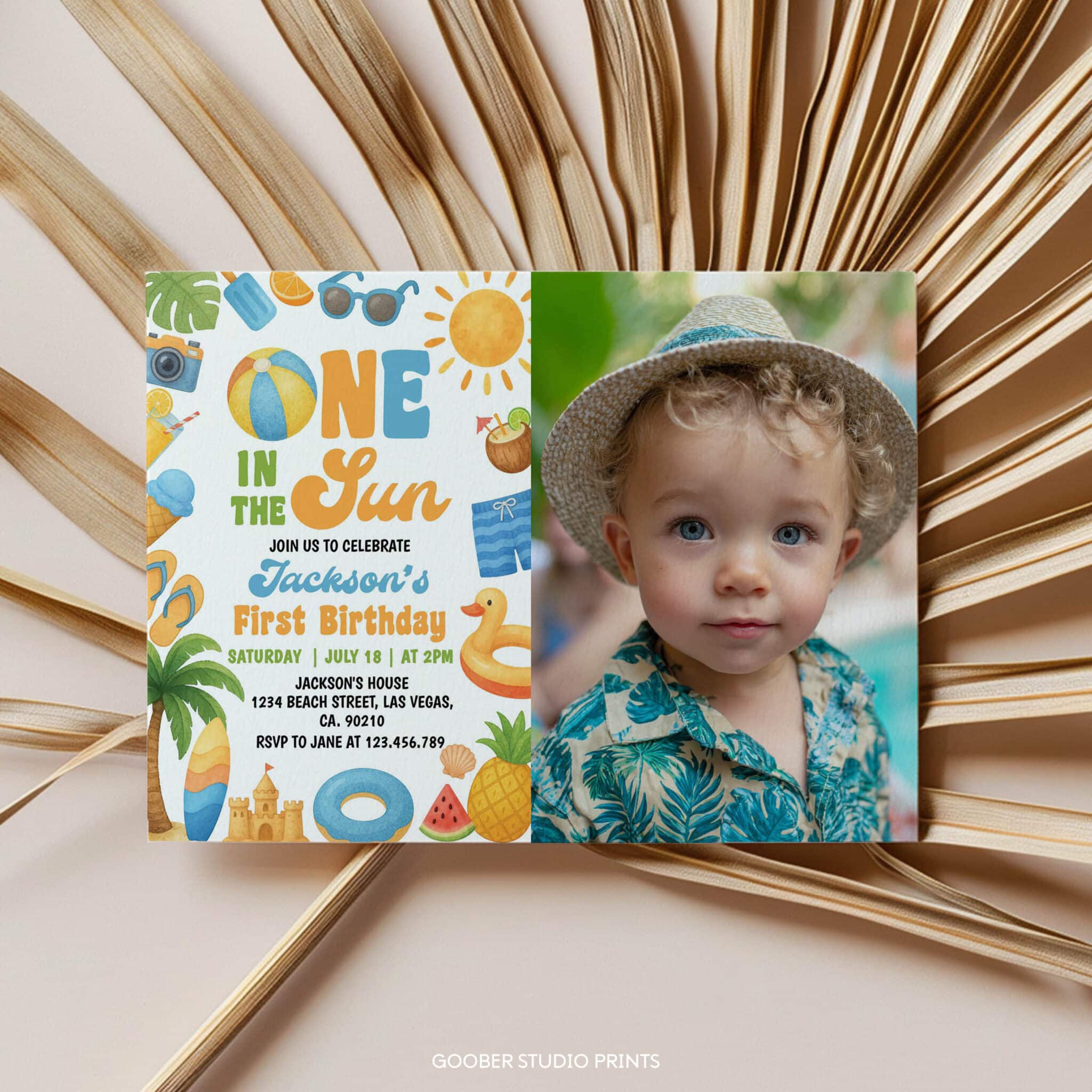 Celebrate your baby’s first birthday with our one in the sun photo invitation—perfect for a sunny summer birthday party! Featuring cheerful tropical designs and beachy elements, this fun and playful invite is ideal for a one in the sun themed beach birthday or pool party. Fully customizable with your event details and easy to print at home, it’s a bright and budget-friendly way to kick off your little one’s special day in the sun!
