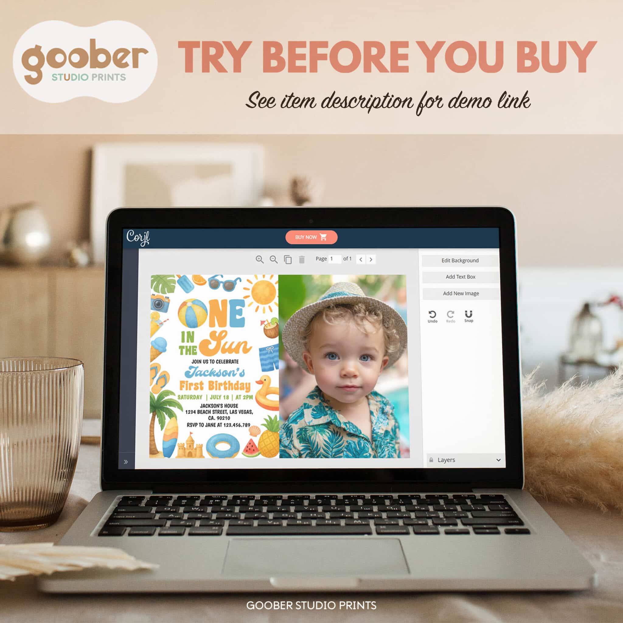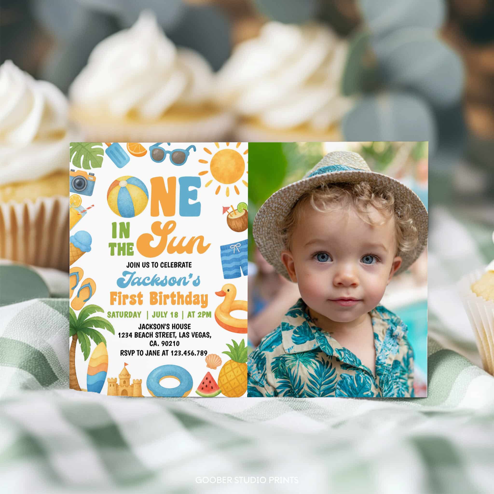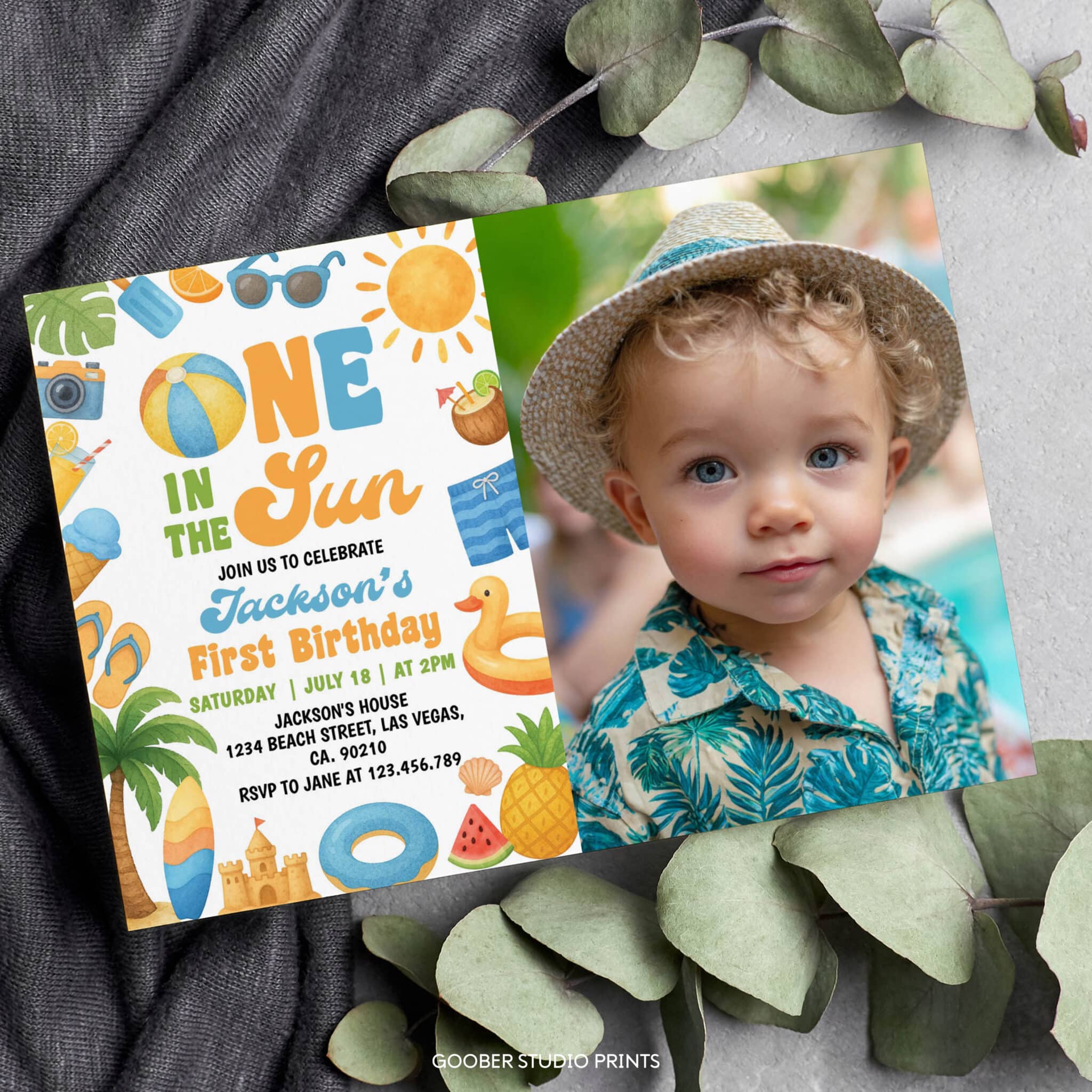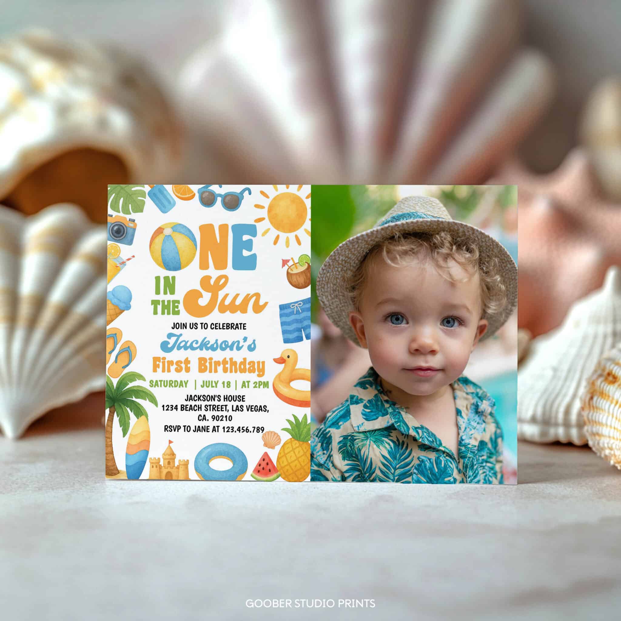 Celebrate your baby’s first birthday with our one in the sun photo invitation—perfect for a sunny summer birthday party! Featuring cheerful tropical designs and beachy elements, this fun and playful invite is ideal for a one in the sun themed beach birthday or pool party. Fully customizable with your event details and easy to print at home, it’s a bright and budget-friendly way to kick off your little one’s special day in the sun!