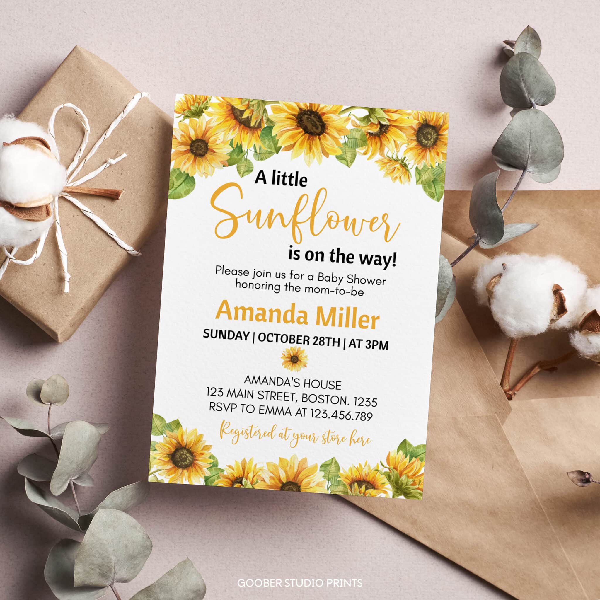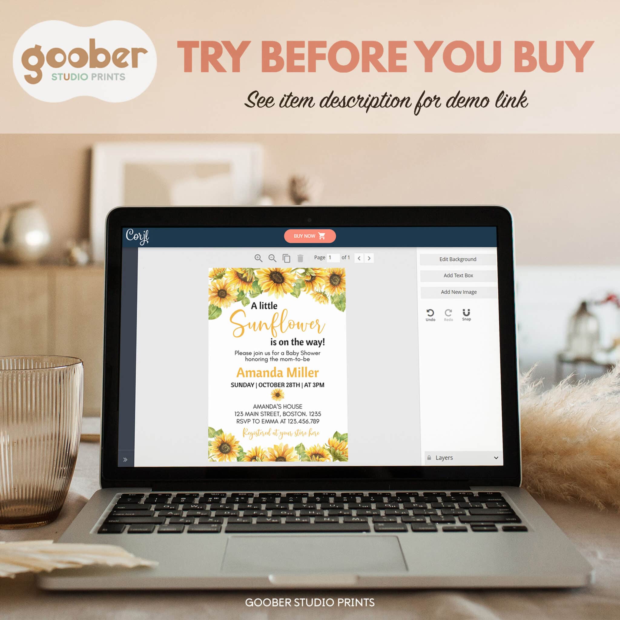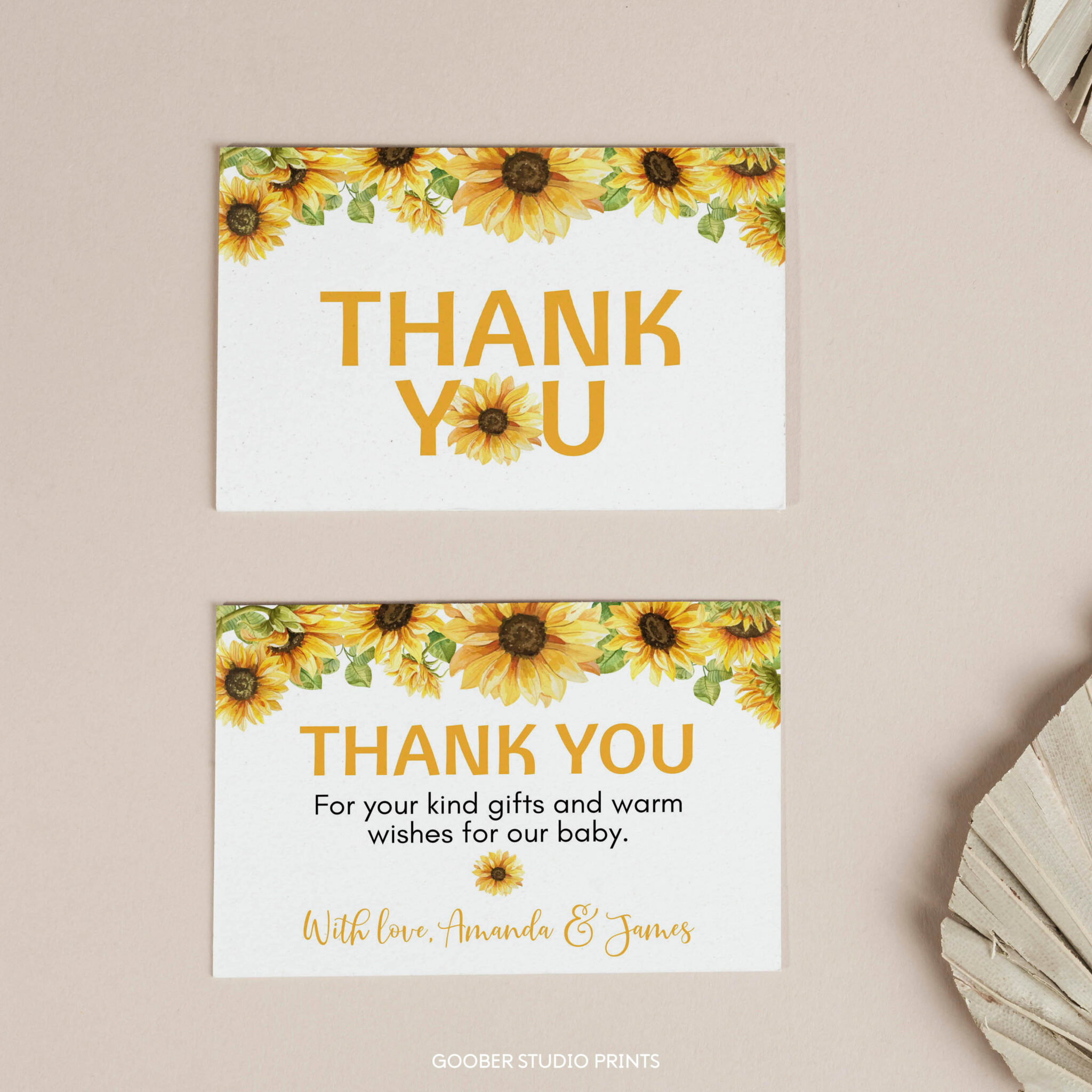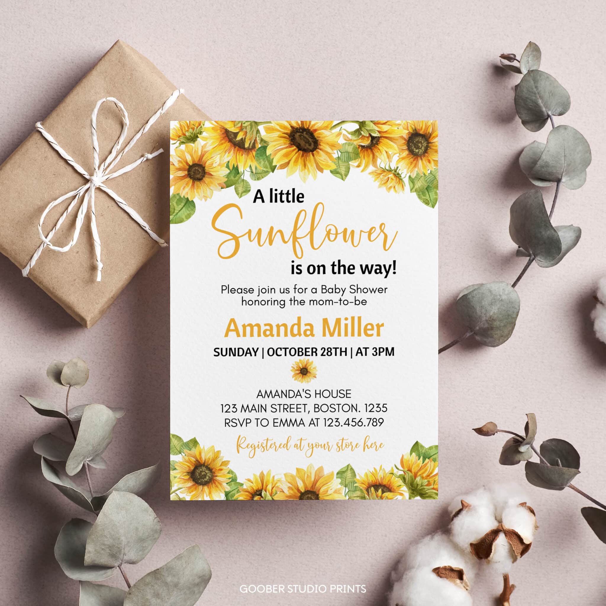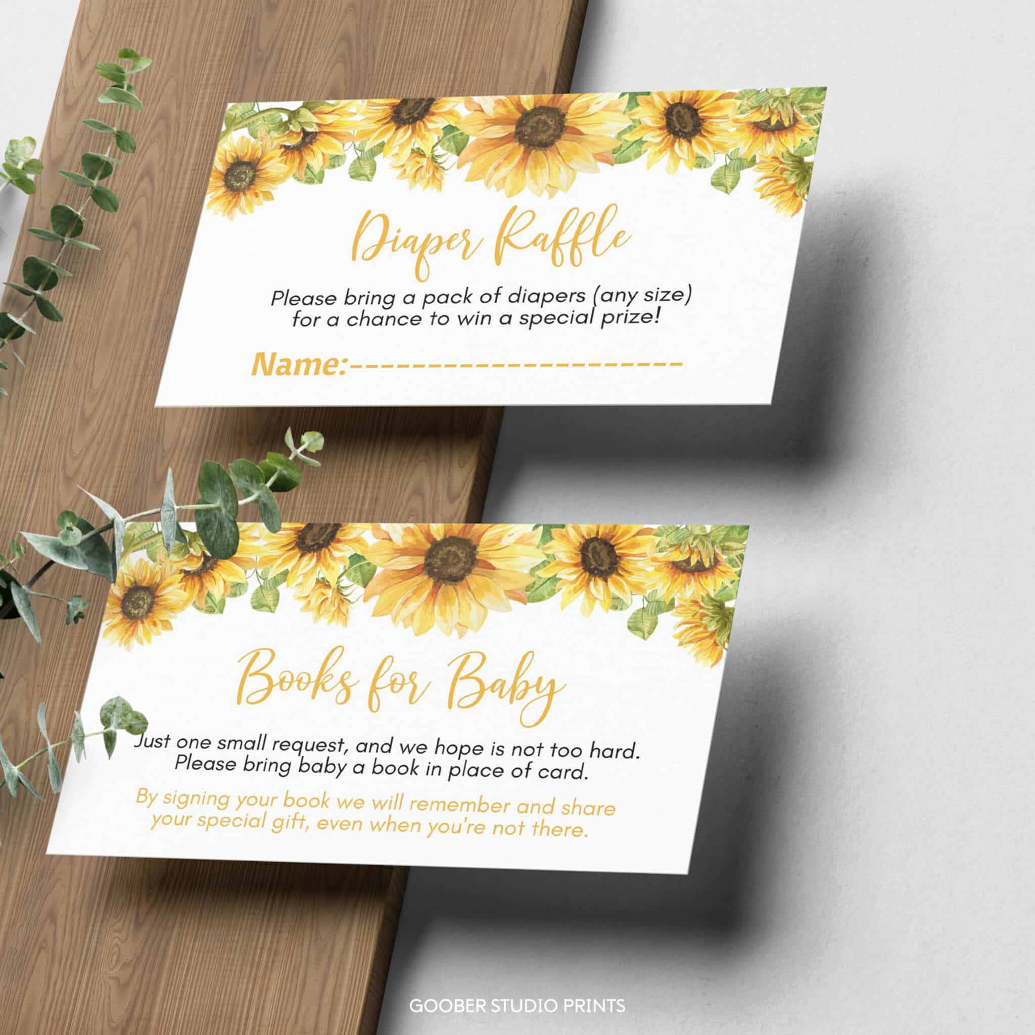 An access link to your editable sunflower baby shower invite, diaper raffle card, books for baby card, and folded thank you card designs will be sent to your e-mail address. The link allows you to edit, save and download your design as JPG or PDF file. The printable baby shower invitation is made for printing at 5×7 inches. The other set items printing sizes are: