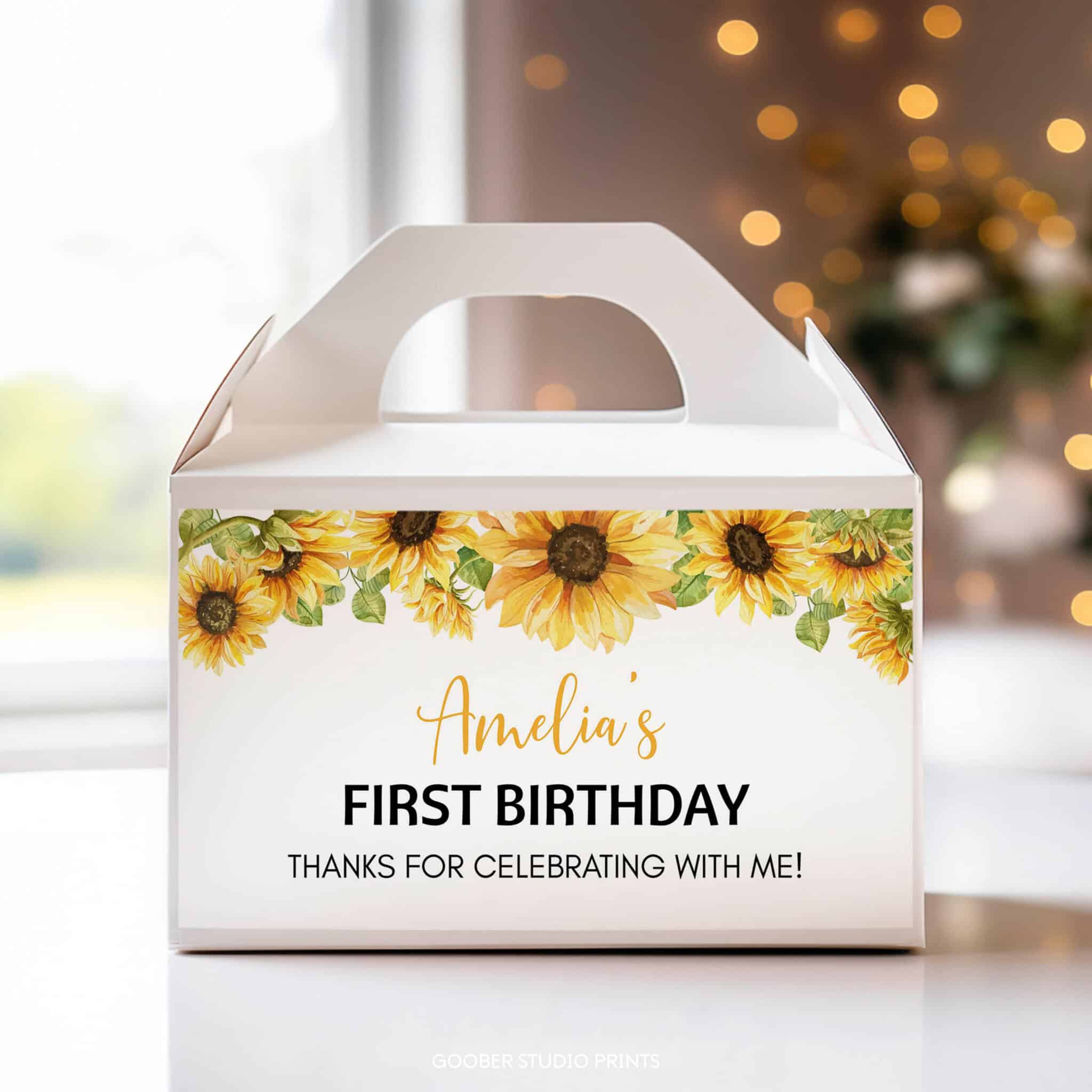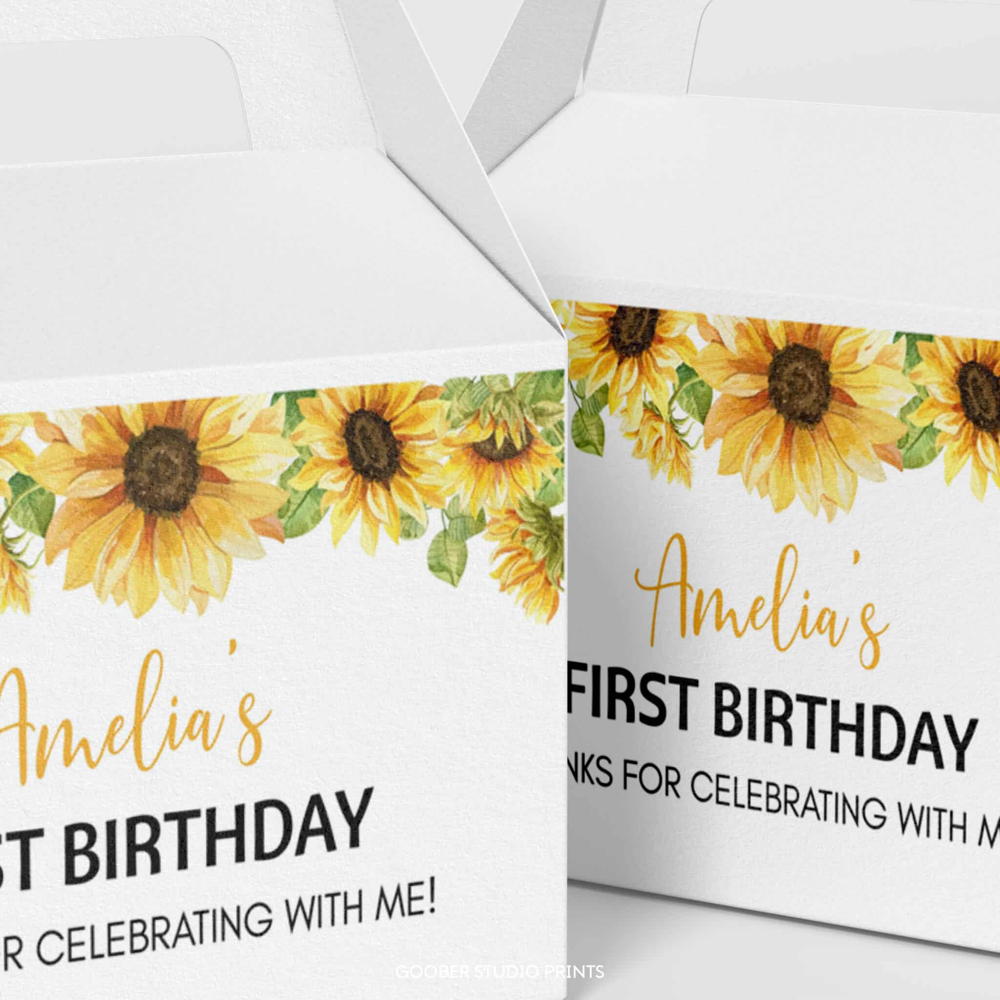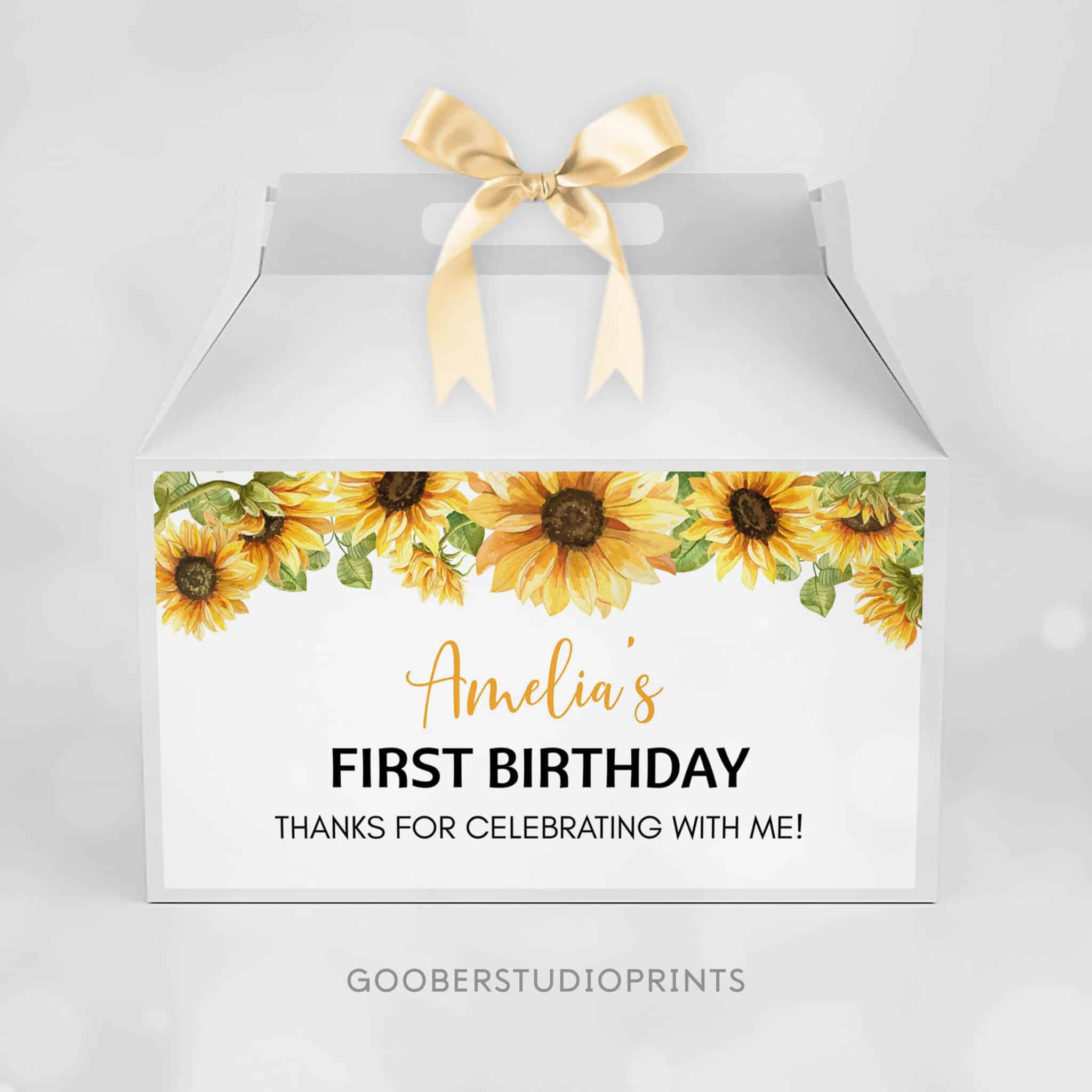 Add a charming touch to your party favors with our sunflower birthday gable box labels, perfect for a sunflower birthday girl celebration. These sweet labels feature cheerful sunflowers, soft floral details, and warm golden accents for a bright and happy design. Personalize them with your little girl’s name and age, then print at home on standard paper. Easily attach them to gable boxes to complete your sunflower birthday party decorations with a joyful and coordinated look.