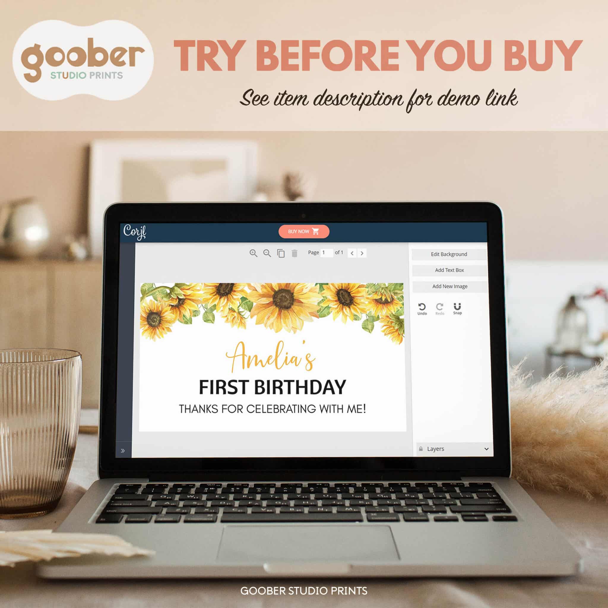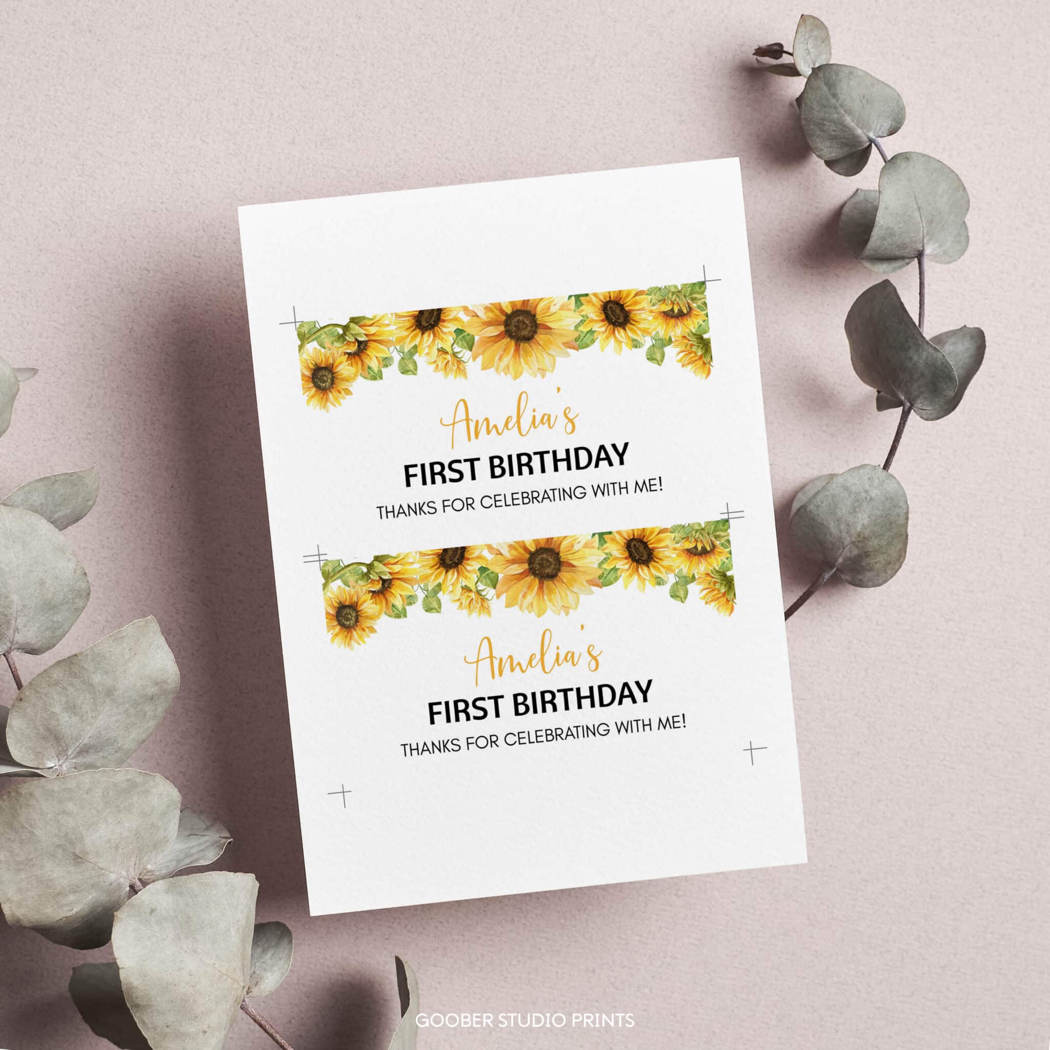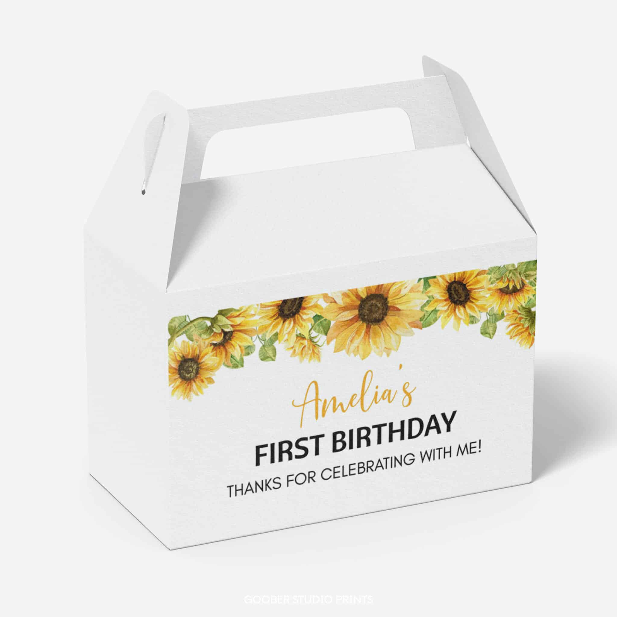Add a charming touch to your party favors with our sunflower birthday gable box labels, perfect for a sunflower birthday girl celebration. These sweet labels feature cheerful sunflowers, soft floral details, and warm golden accents for a bright and happy design. Personalize them with your little girl’s name and age, then print at home on standard paper. Easily attach them to gable boxes to complete your sunflower birthday party decorations with a joyful and coordinated look.