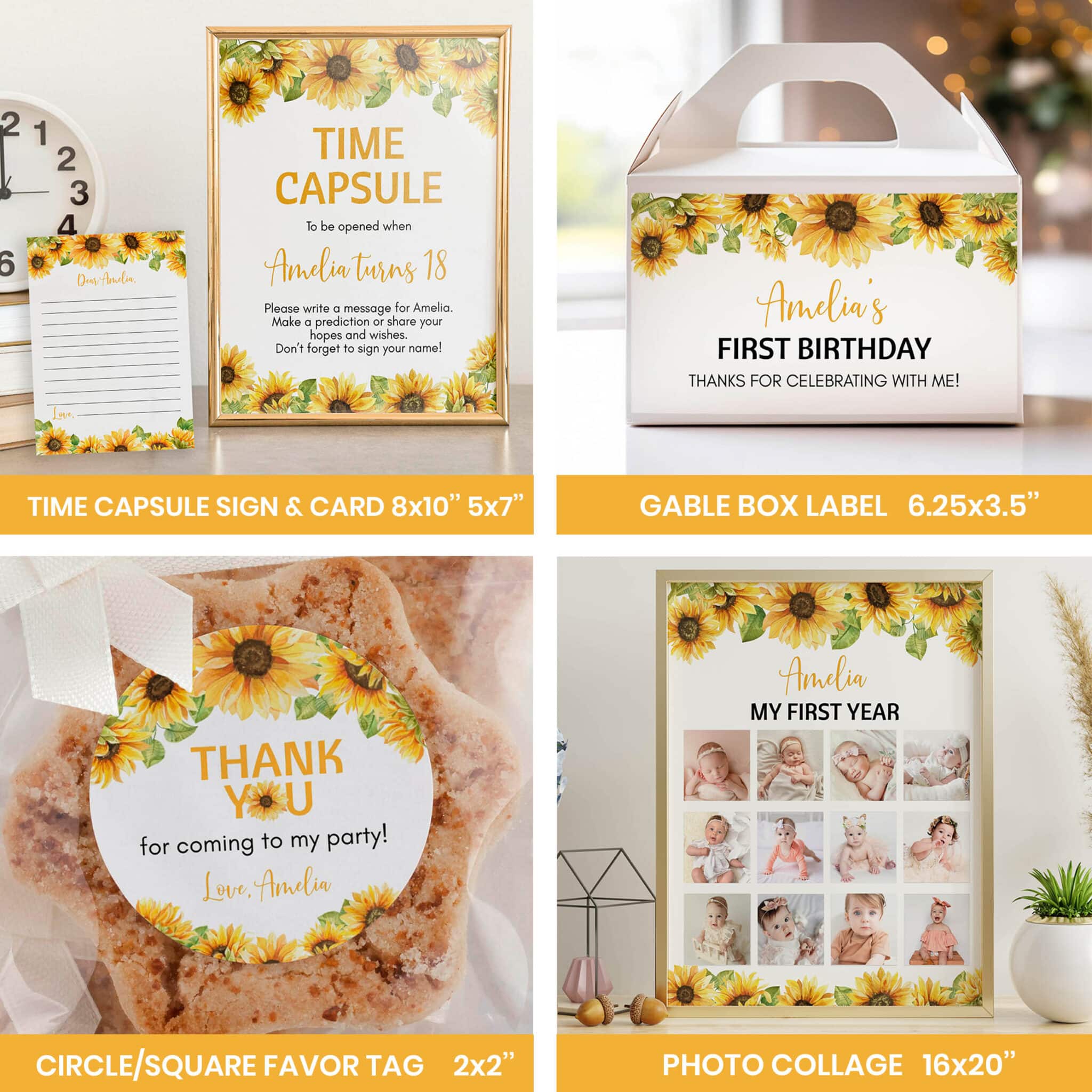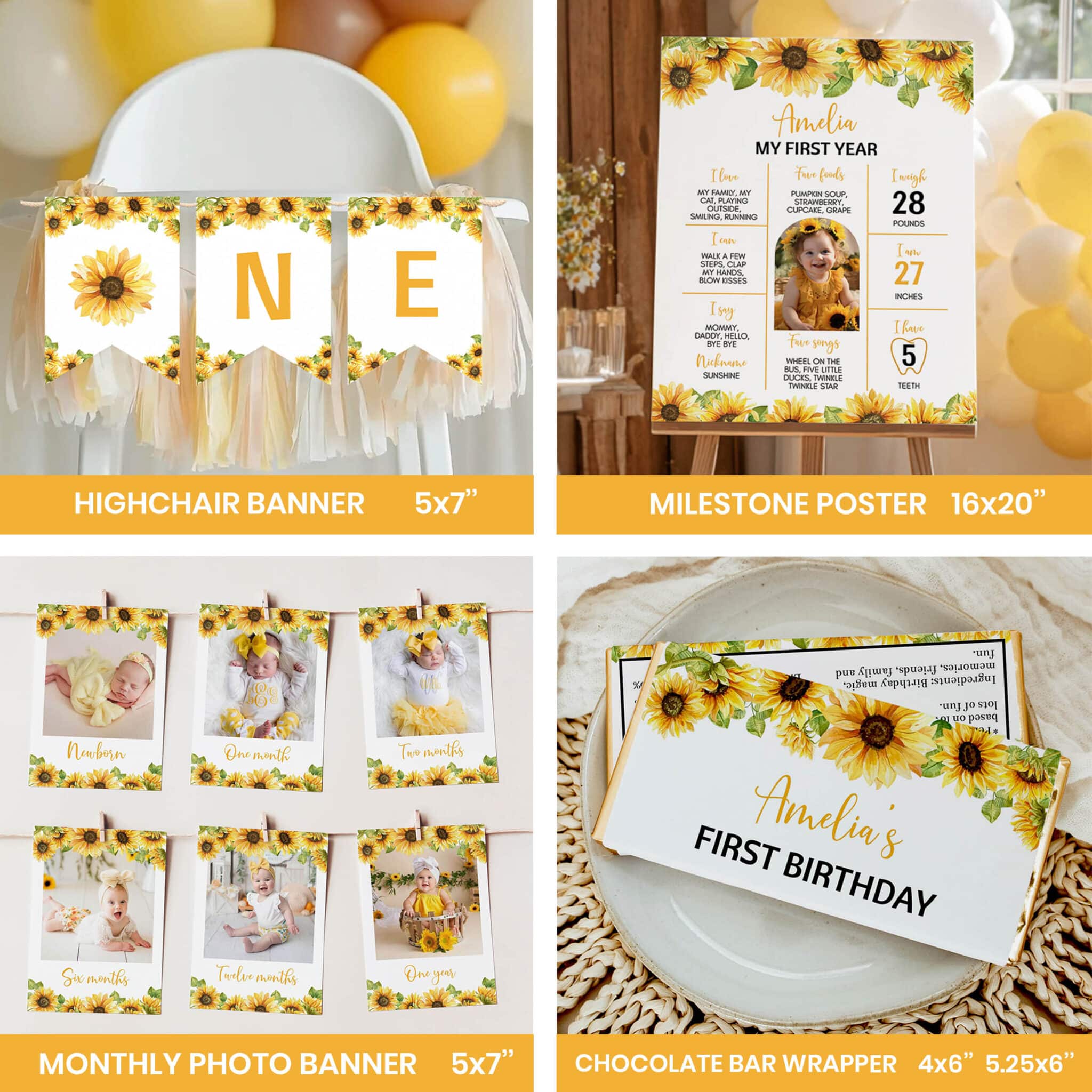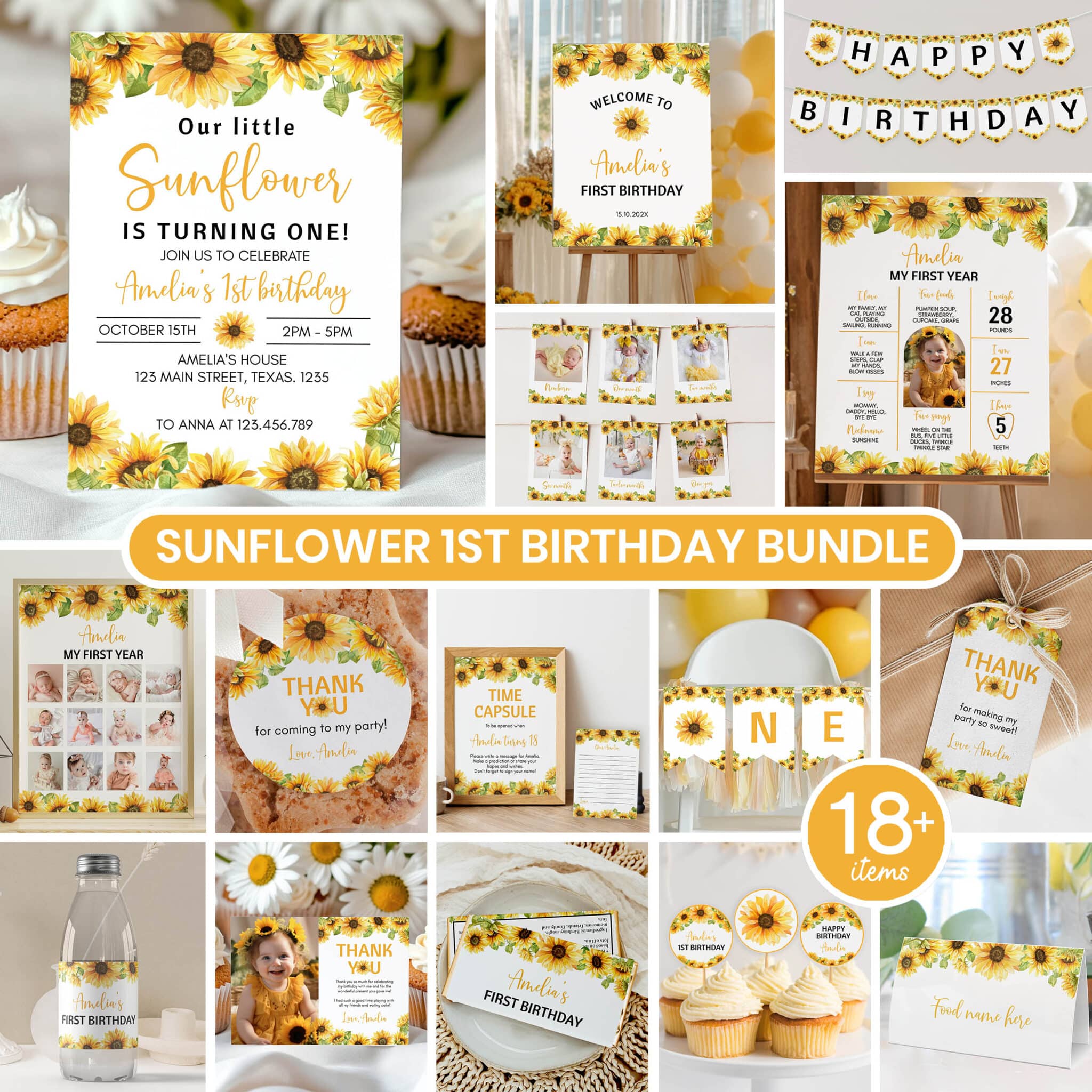 Make your little girl’s special day shine with our sunflower birthday bundle, created for a joyful sunflower birthday girl celebration. This all-in-one collection features cheerful sunflowers, soft floral details, and warm golden accents in a timeless design that pairs beautifully with your sunflower birthday party decorations. The bundle includes invitations, banners, cupcake toppers, favor tags, and more—all customizable with your child’s name, date, and party details. Discover all the lovely pieces included below and plan a bright, coordinated sunflower birthday with ease.
