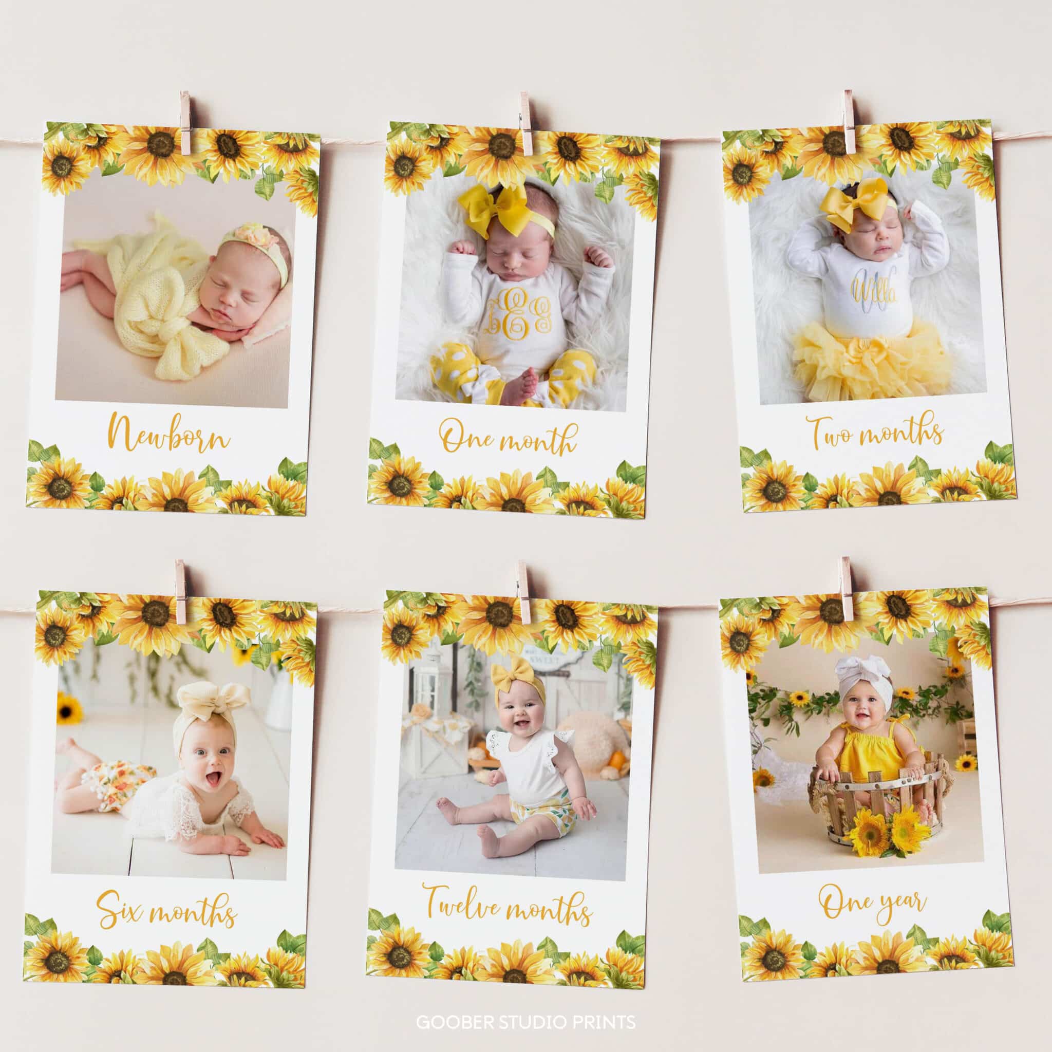 Celebrate your little one’s first year with our sunflower birthday photo banner, perfect for a sweet sunflower birthday girl celebration. This charming design features cheerful sunflowers, soft floral details, and warm golden accents to create a bright and heartwarming display. The banner includes space for 12 monthly photos, along with your baby girl’s name and age, making it a beautiful highlight of your sunflower birthday décor. Easily customizable and printable at home on standard 5×7 inch paper, it’s both a lovely party detail and a treasured keepsake.