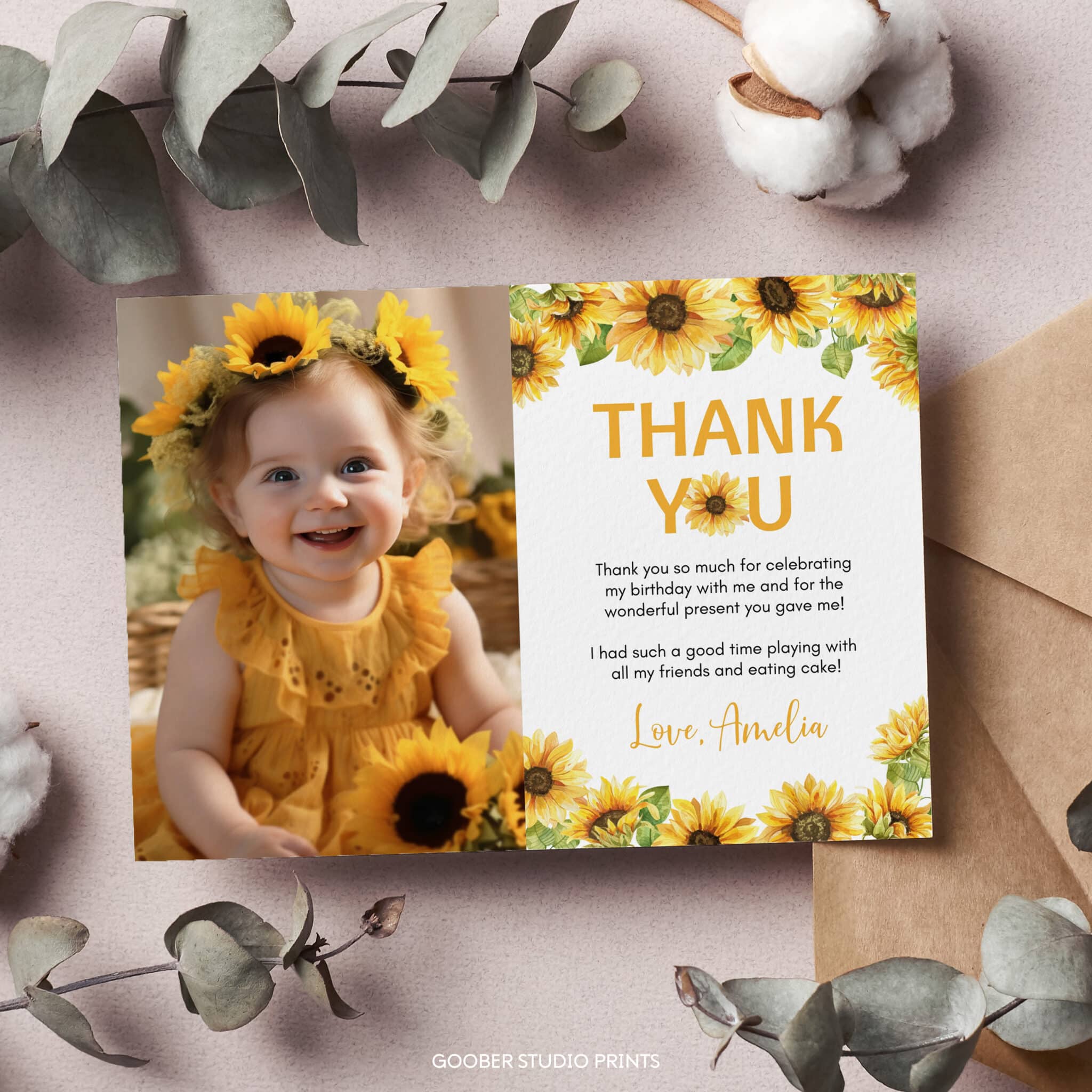 Express your gratitude with our sunflower birthday thank you cards, perfect for a sweet sunflower birthday girl celebration. These charming cards feature cheerful sunflowers, soft floral details, and warm golden accents in a bright and timeless design. With space for a heartfelt message, they’re easy to print at home on standard cardstock. A thoughtful and stylish way to thank your guests, these sunflower birthday thank you cards are the perfect finishing touch to your girl’s sunflower birthday party decorations.