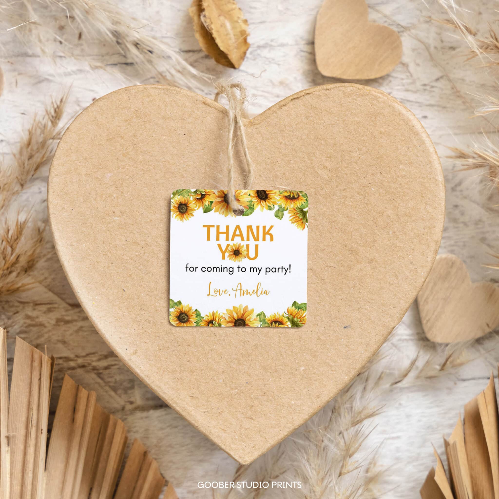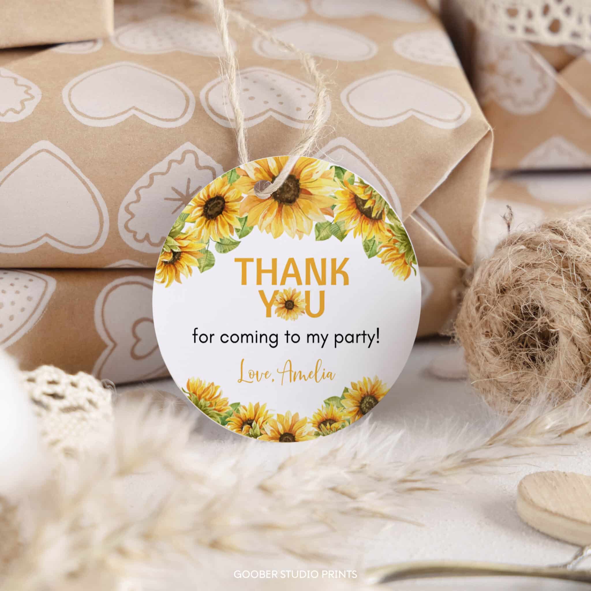 Add a sweet touch to your party favors with our sunflower birthday favor tags, perfect for a sunflower birthday girl celebration. These adorable tags feature cheerful sunflowers, soft floral details, and warm golden accents in a charming, timeless design. Personalize them with a heartfelt message and print at home on standard cardstock. The perfect finishing detail for your sunflower birthday party decorations, these favor tags help make your girl’s celebration bright, joyful, and memorable.