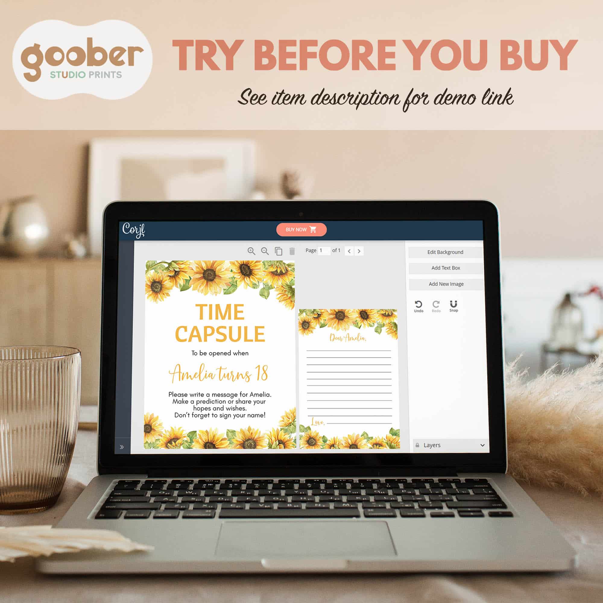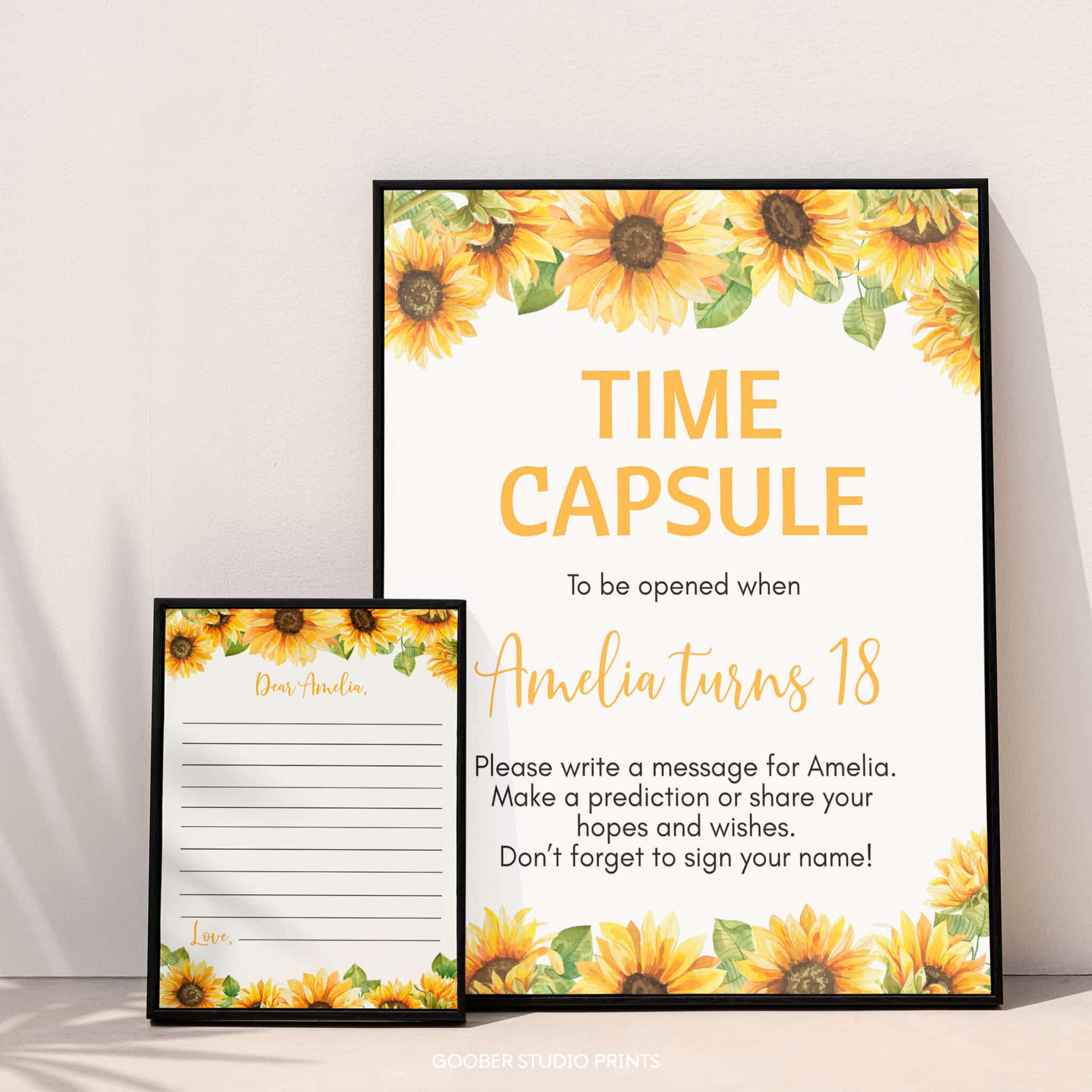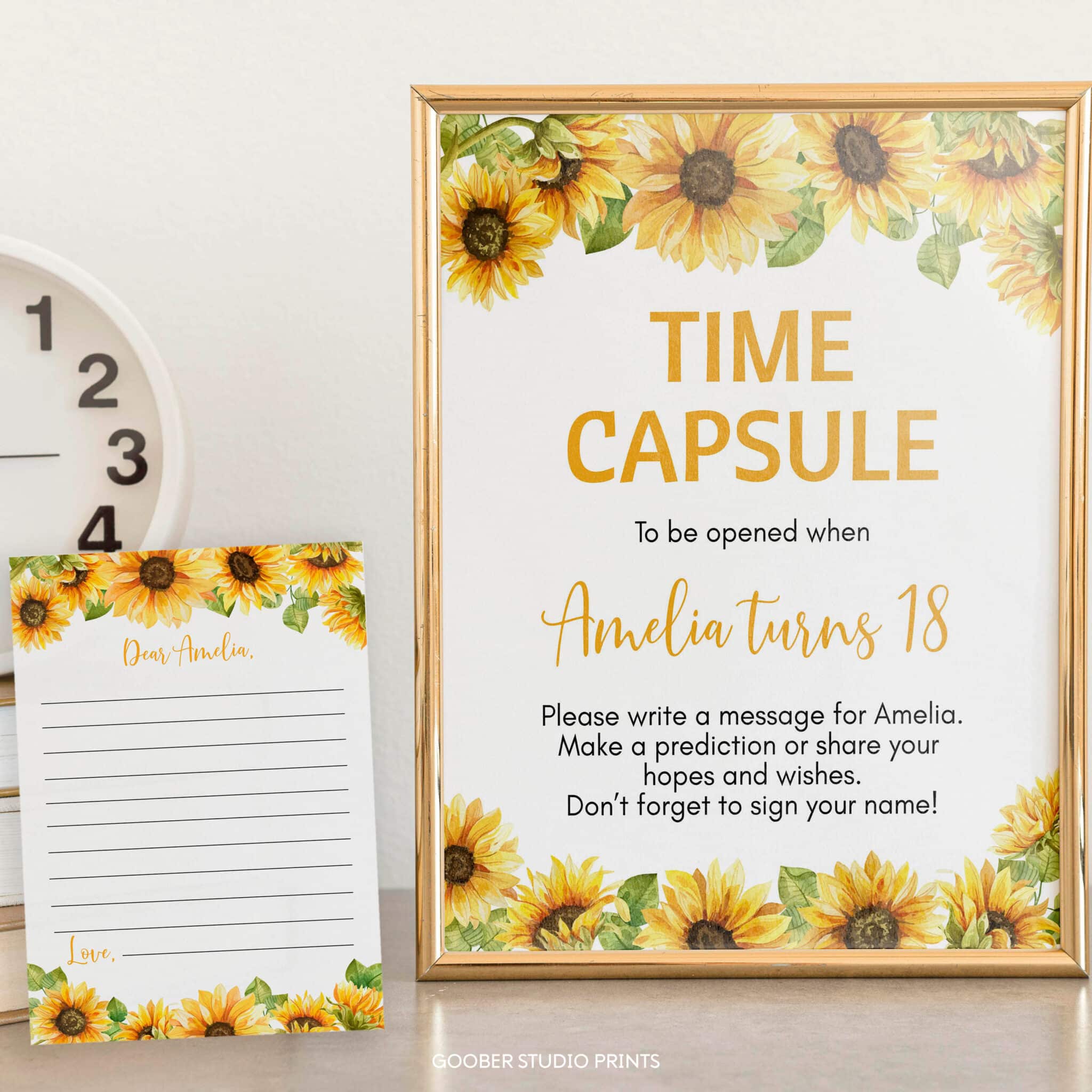 Create lasting memories with our sunflower birthday time capsule set, perfect for a sweet sunflower birthday girl celebration. This charming set features cheerful sunflowers, soft floral details, and warm golden accents in a whimsical, timeless design. It includes a time capsule sign and matching cards for guests to write wishes, memories, and predictions for your little girl’s future. A meaningful addition to your sunflower birthday party decorations, this keepsake can be sealed and saved to open on a special future date—letting your girl’s sunflower birthday celebration be remembered for years to come.