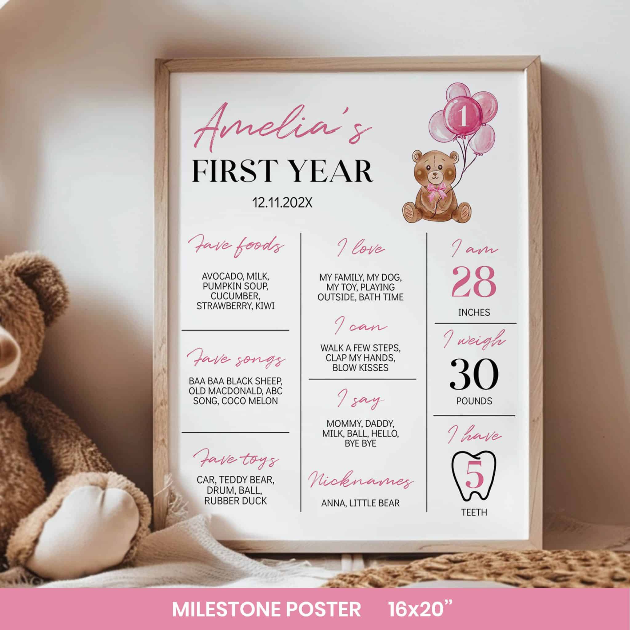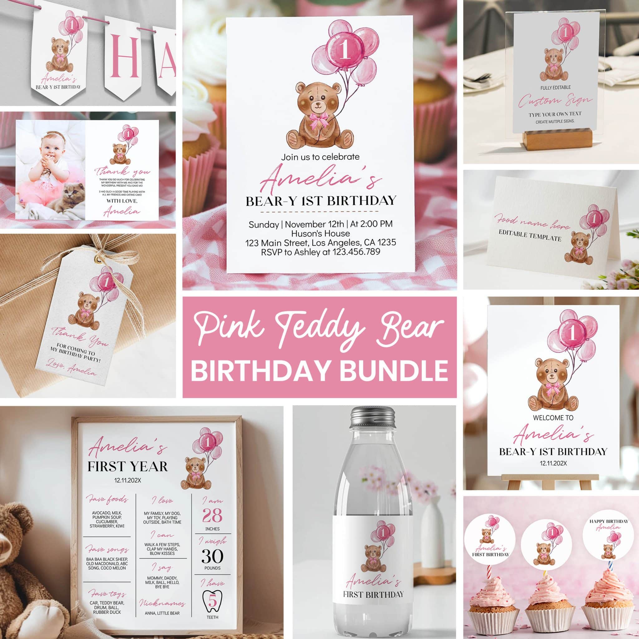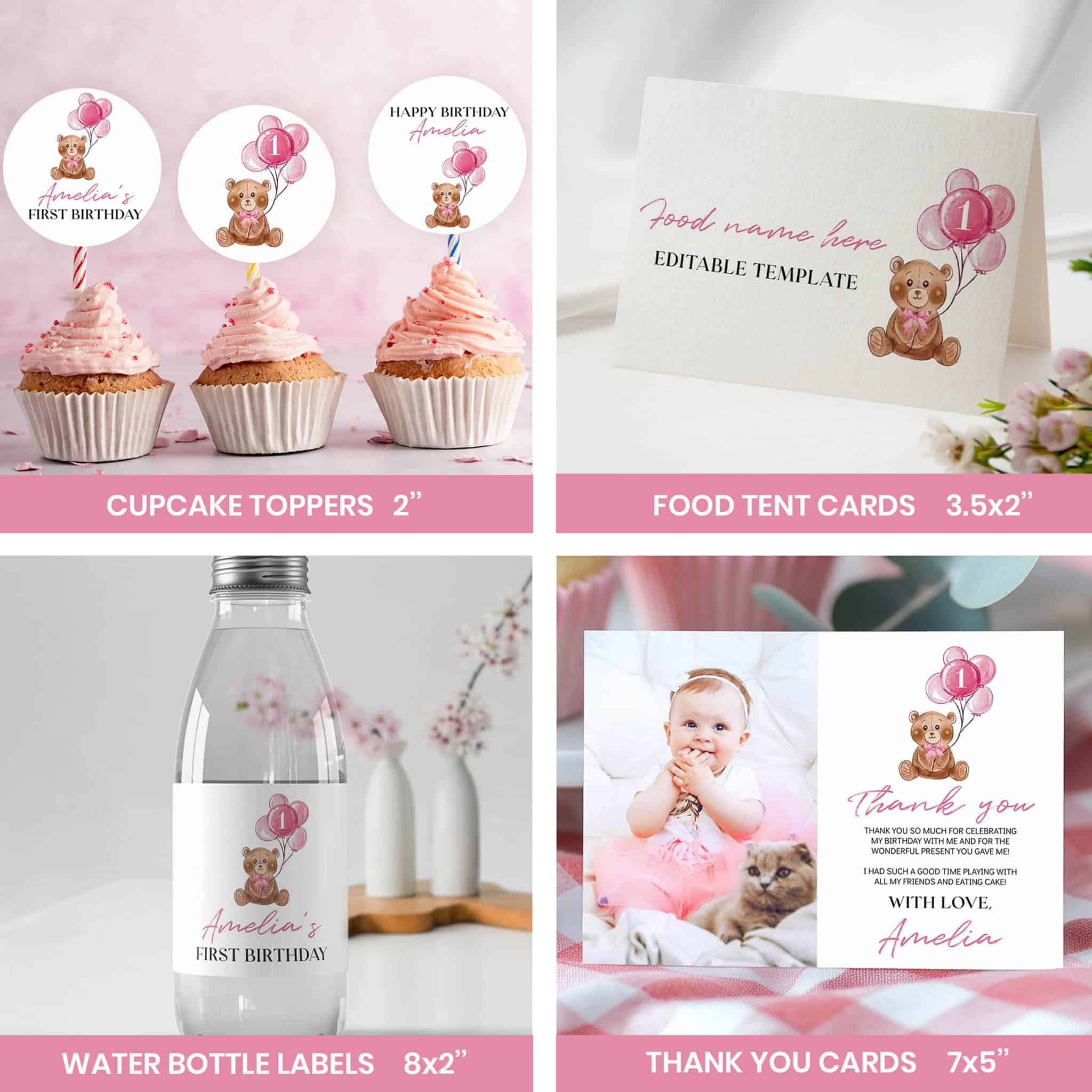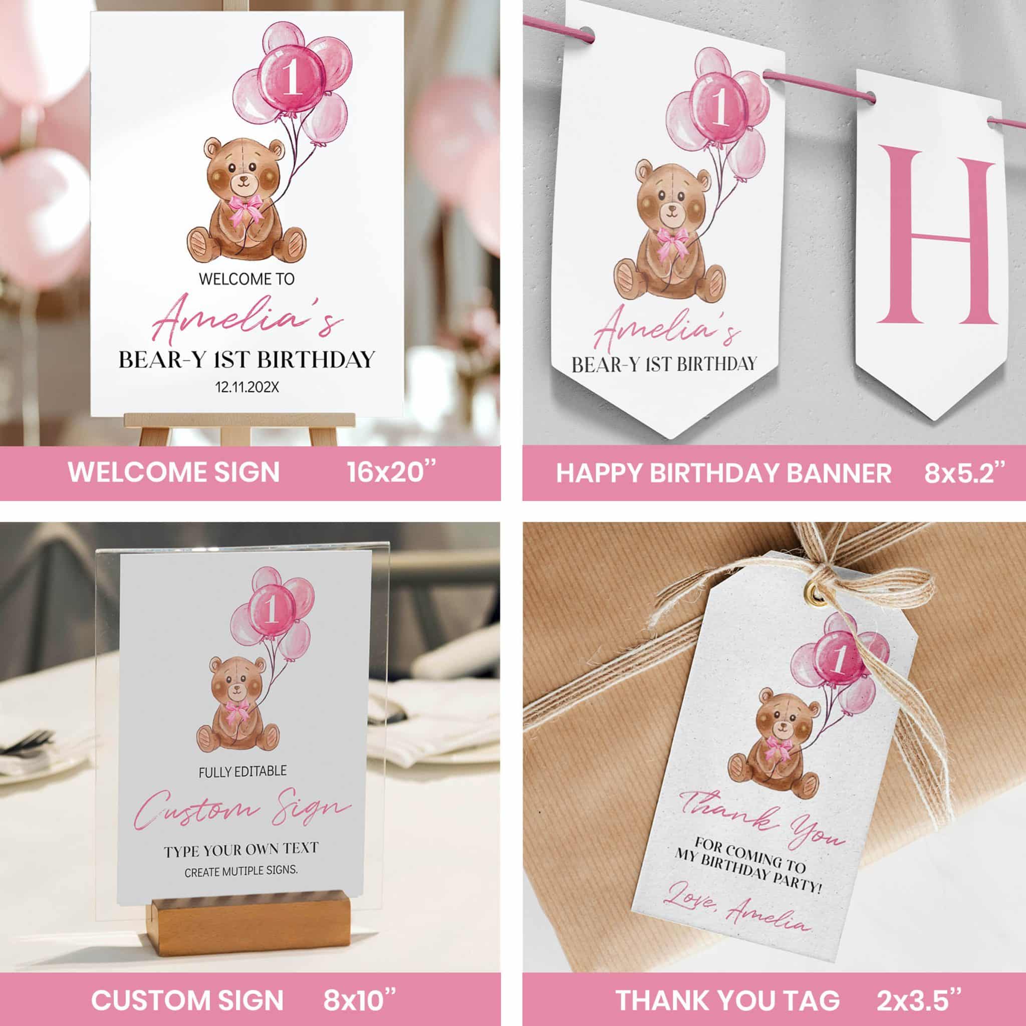 An access link to your editable teddy bear birthday bundle set will be sent to your e-mail address. The link allows you to edit, save and download your designs as JPG or PDF files. All the included designs and their sizes are:
