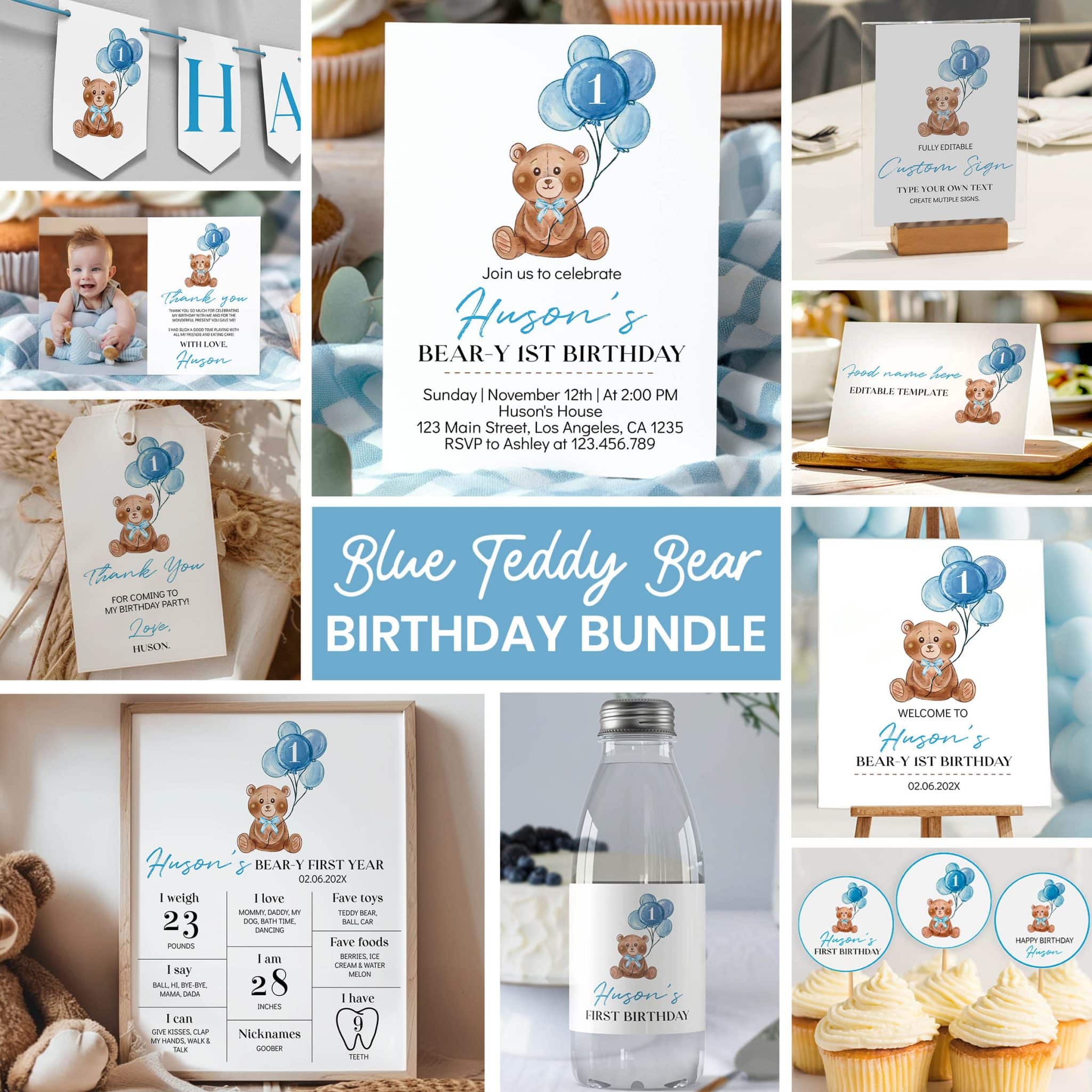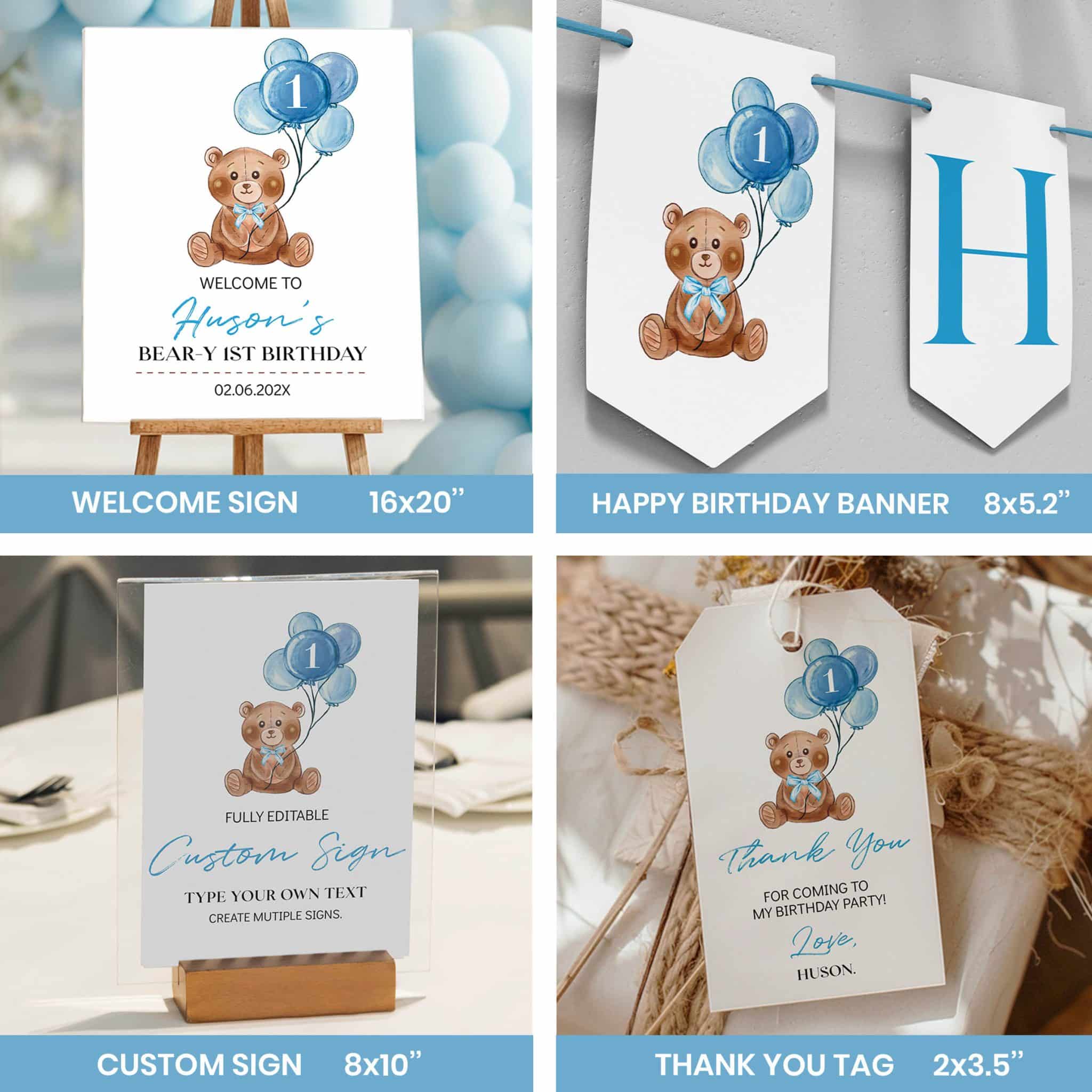 An access link to your editable teddy bear birthday bundle set will be sent to your e-mail address. The link allows you to edit, save and download your designs as JPG or PDF files. All the included designs and their sizes are: