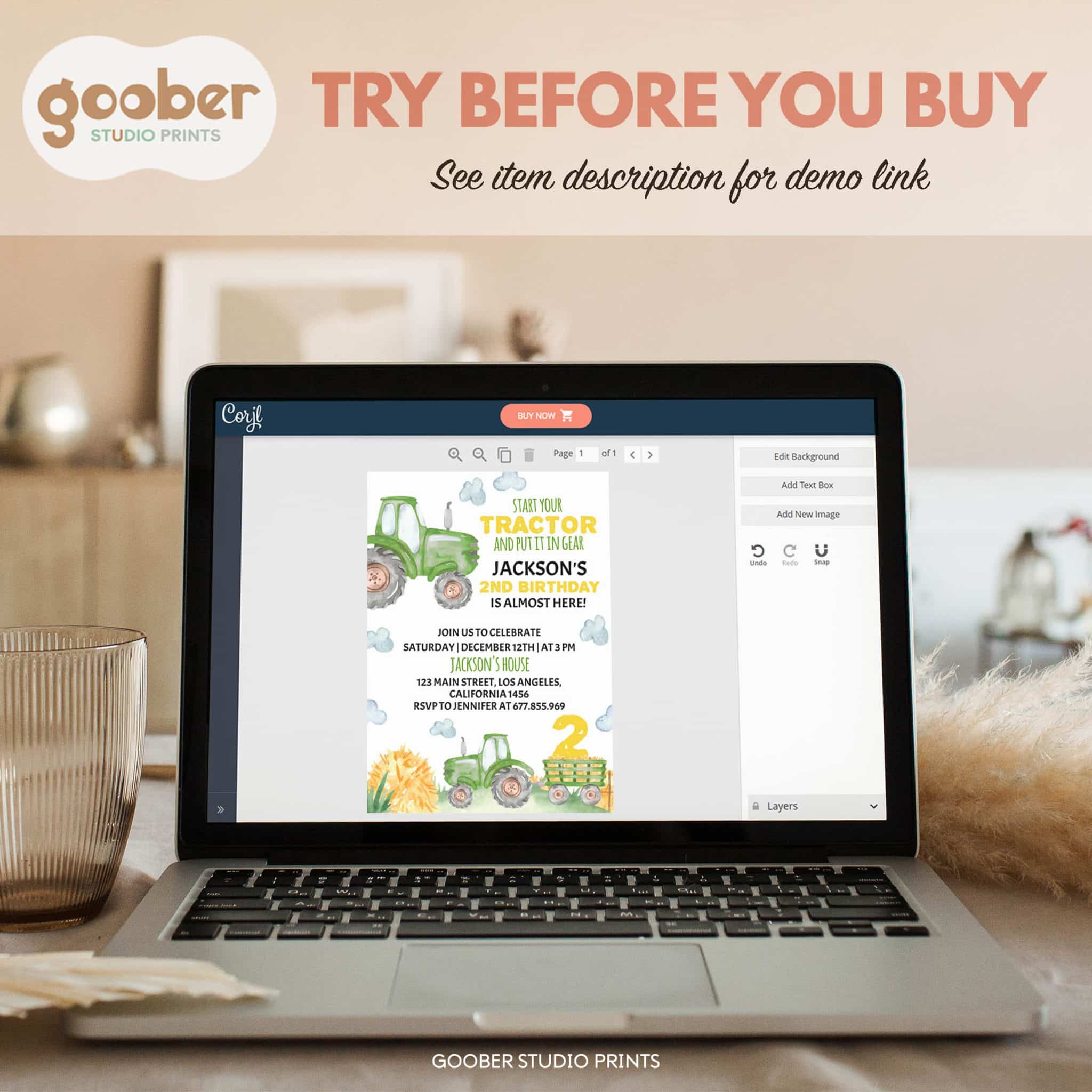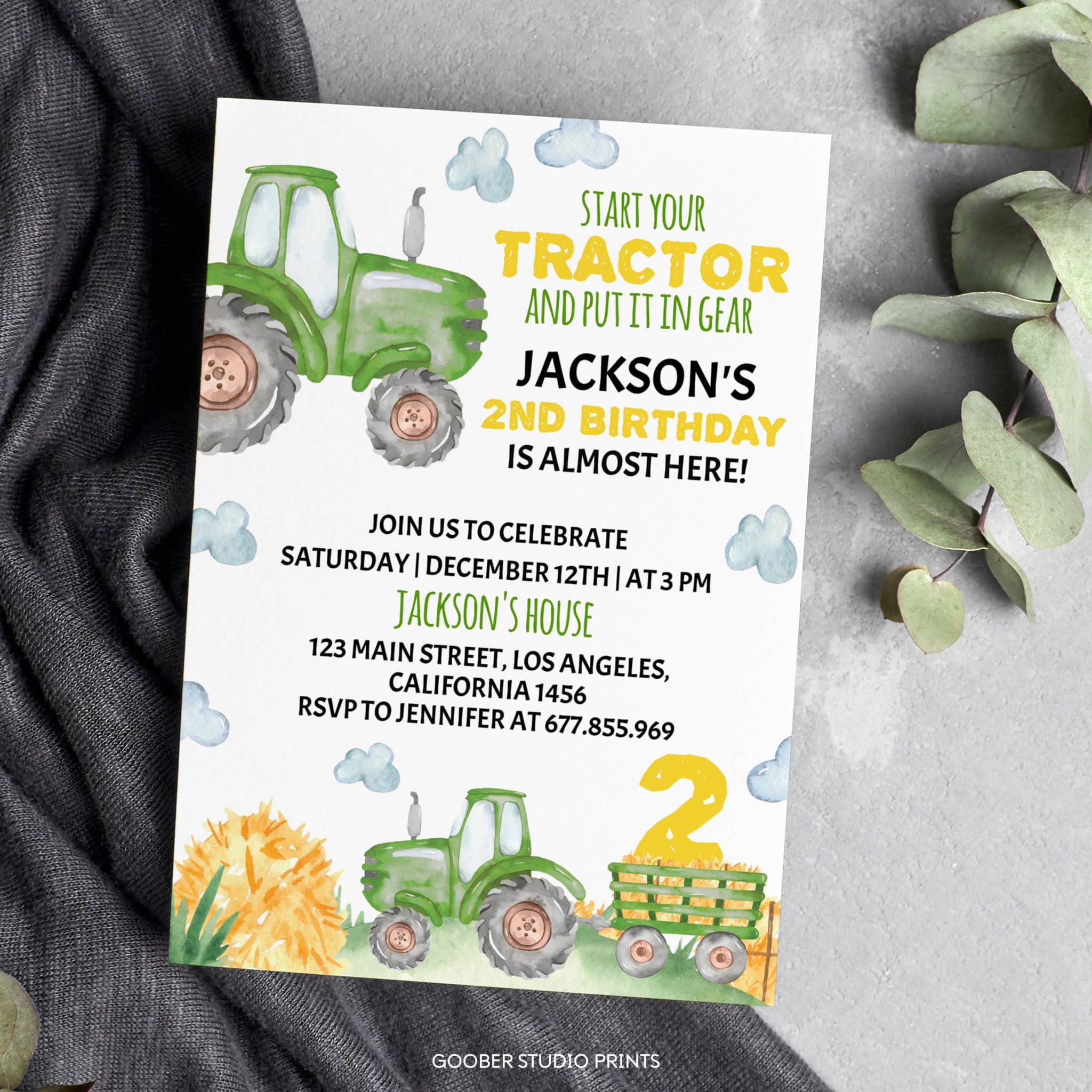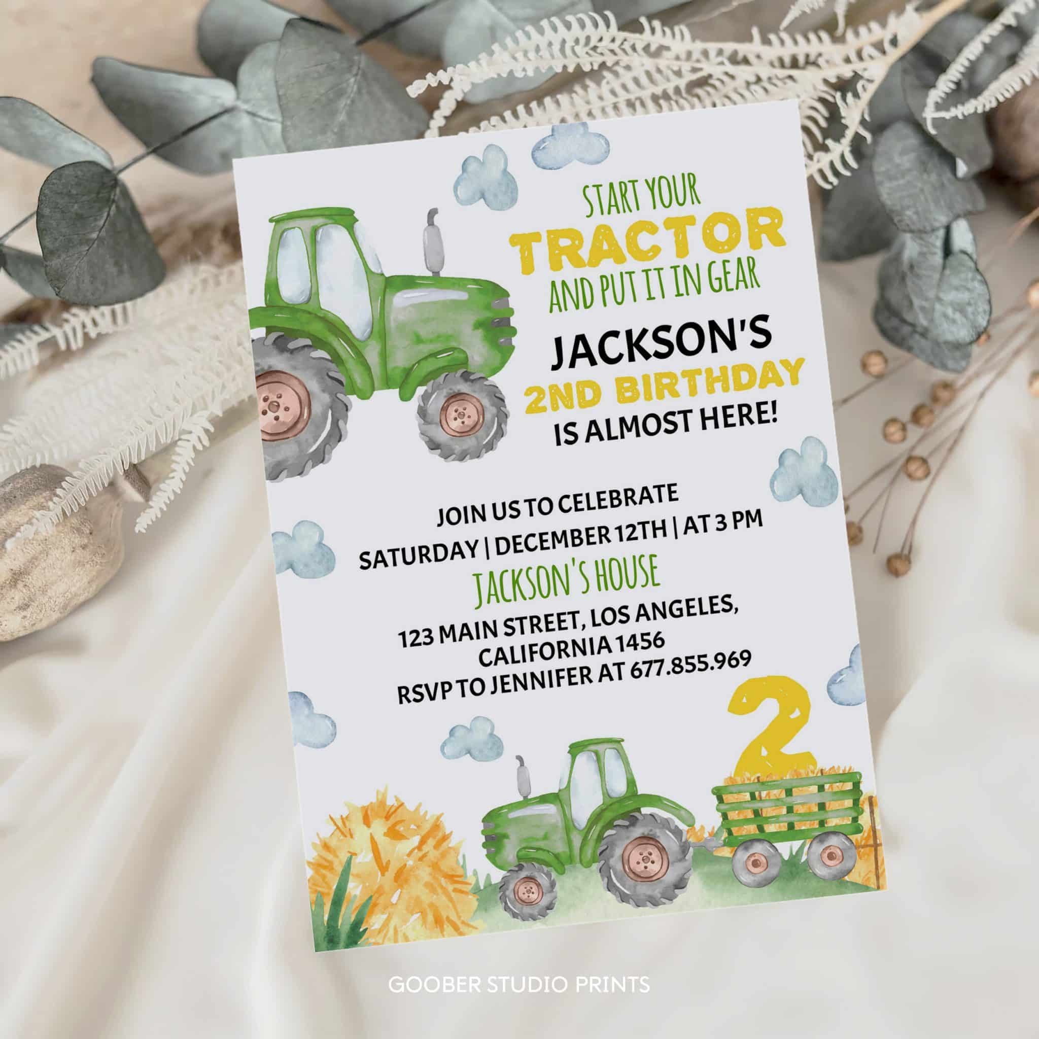 Gear up for a fantastic celebration with our green tractor-themed birthday invitation, perfect for your little farmer’s 2nd birthday! Featuring bright tractor designs and a cheerful farmyard vibe, this invitation is ideal for a fun-filled farmyard birthday party. Customizable with all your party details, it’s easy to print at home and pairs wonderfully with tractor party favors and farm-themed birthday party decorations. Set the scene for a memorable barnyard bash as you celebrate your child’s special day in true farm style!