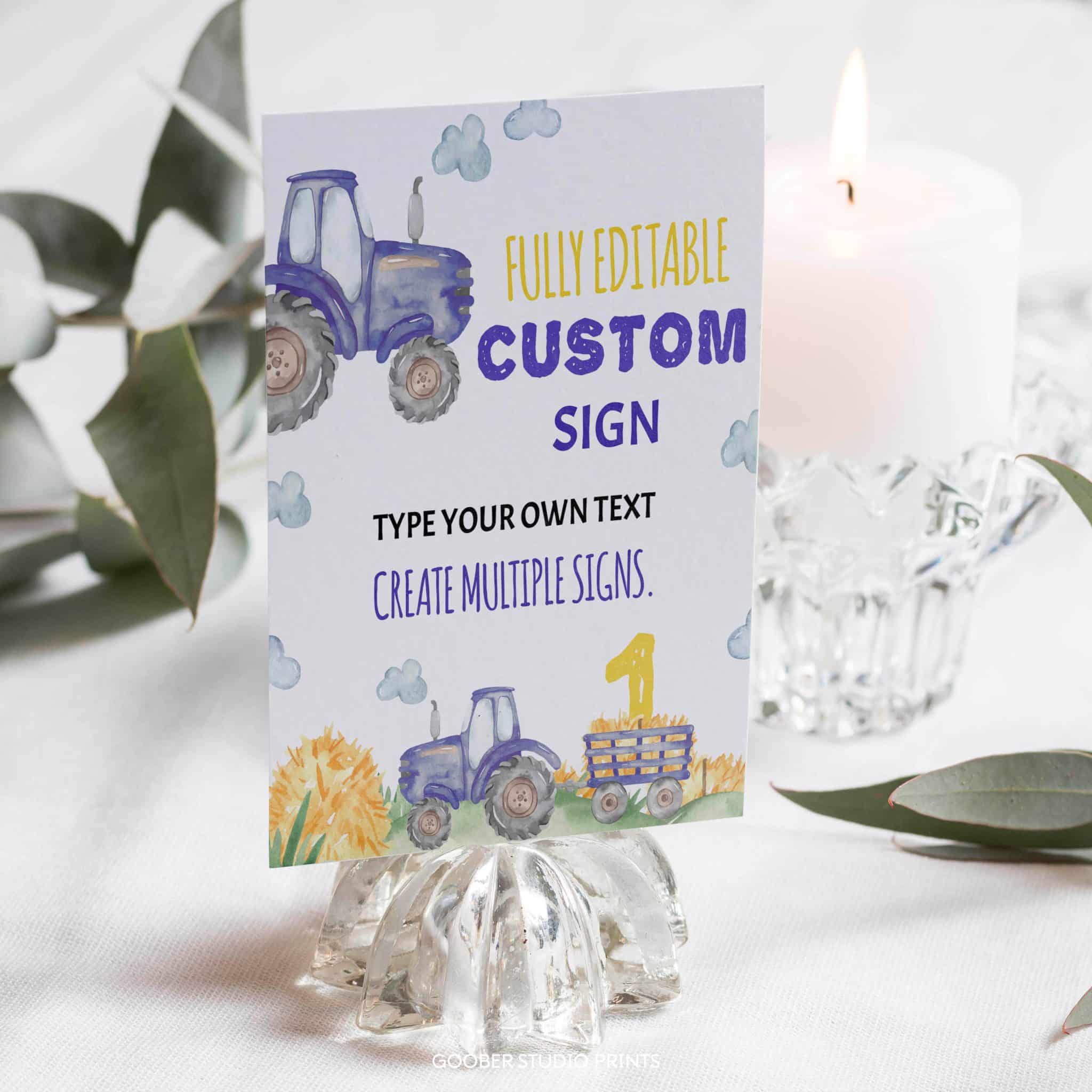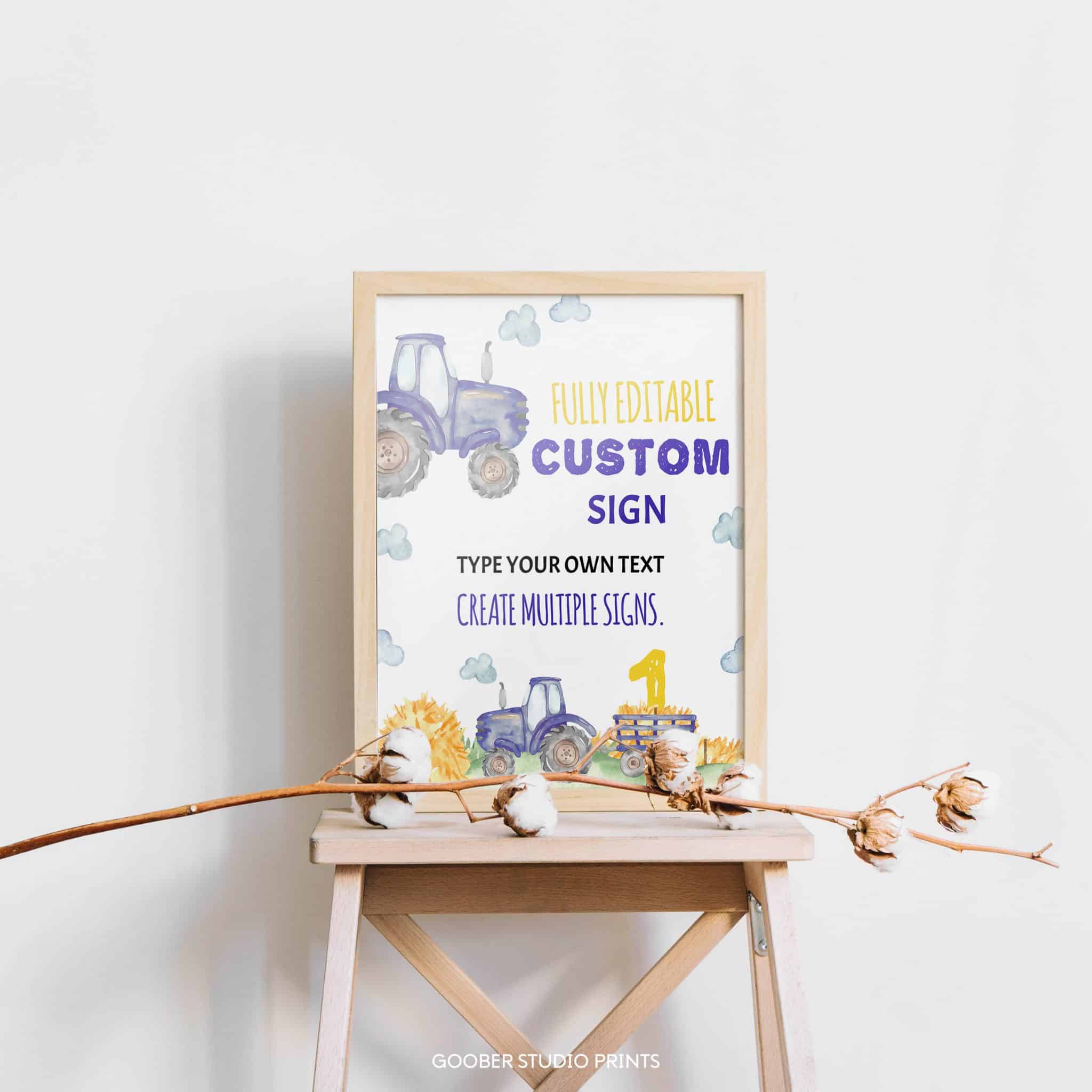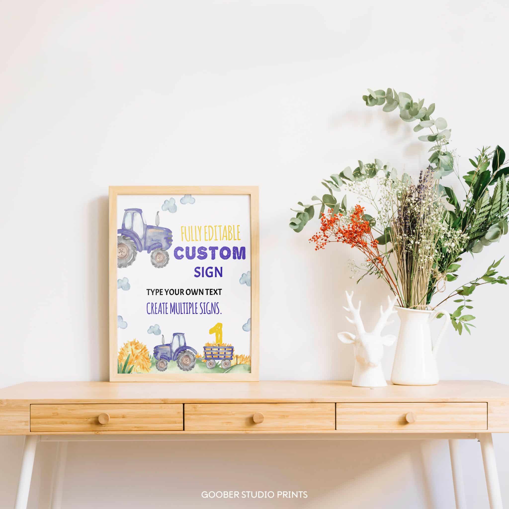 Add a personal touch to your decorations with our blue tractor birthday custom sign! Fully customizable, you can include any text, name, or age to match your little farmer’s tractor birthday theme. Perfect as a welcome sign, photo prop, or backdrop, this 8×10-inch design features charming tractor graphics, making your farmyard birthday party a true hit with tractor party favors and farm-themed birthday party decorations!