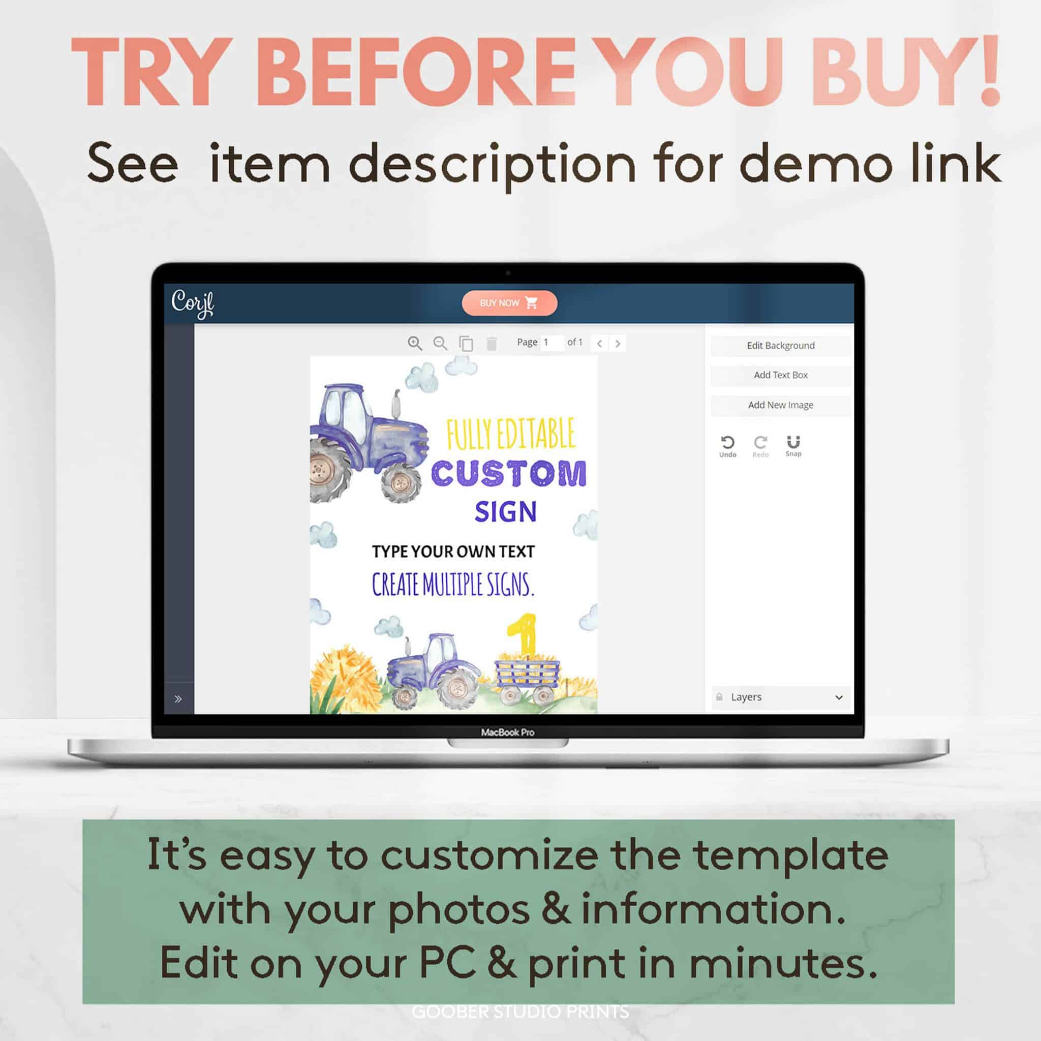 1. After you place an order you will receive an email from Corjl to access your editable tractor birthday template. Please remember to provide your email at checkout.