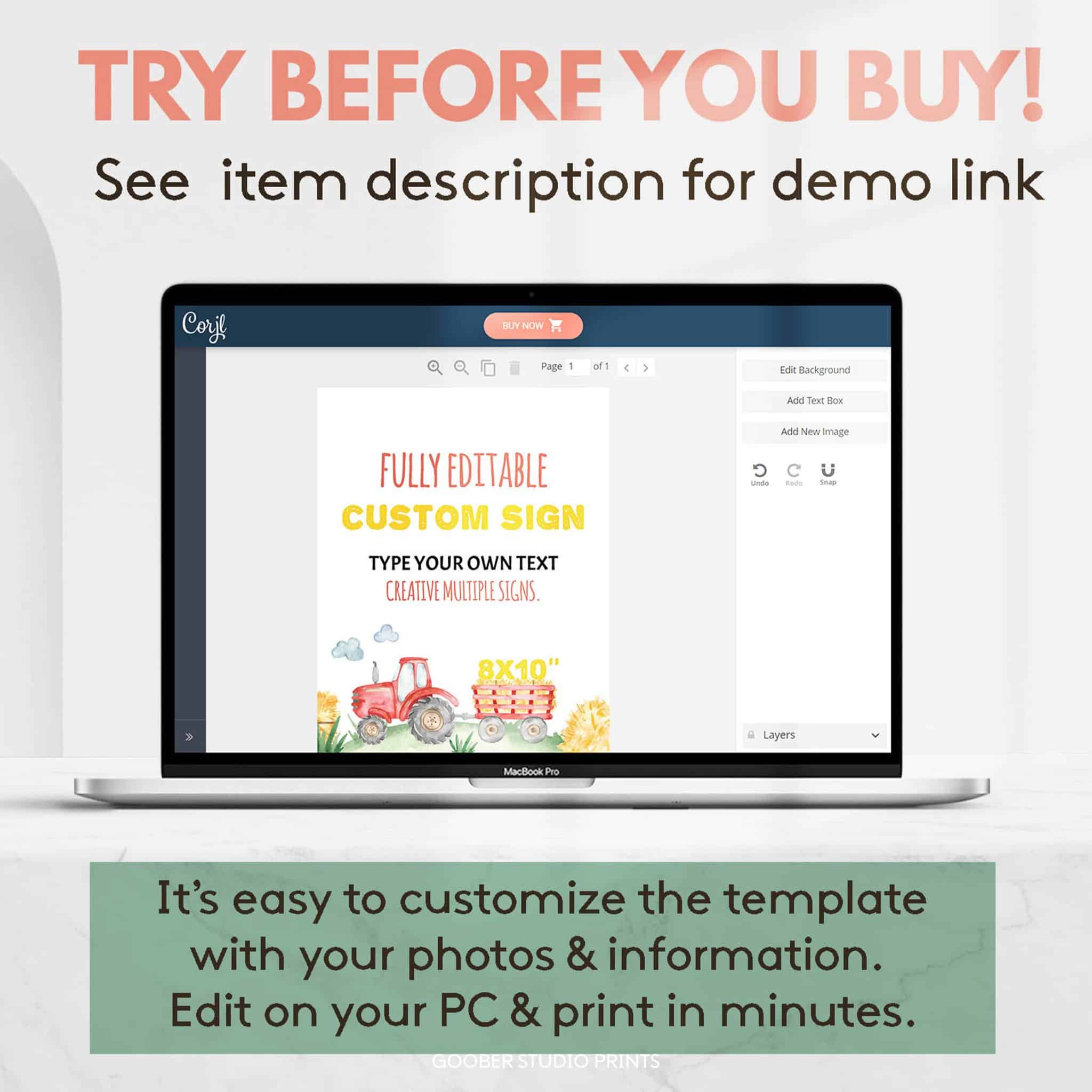 1. After you place an order you will receive an email from Corjl to access your editable tractor birthday template. Please remember to provide your email at checkout.