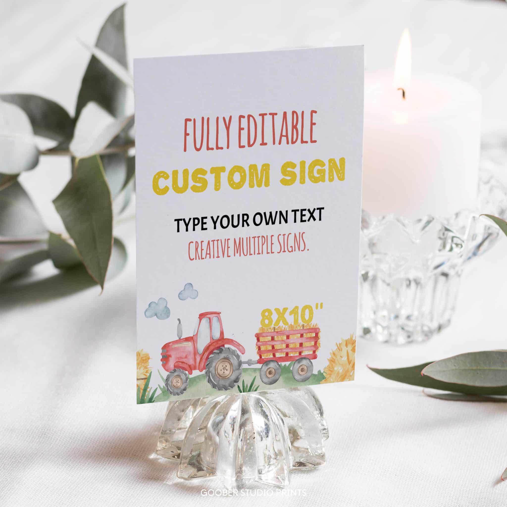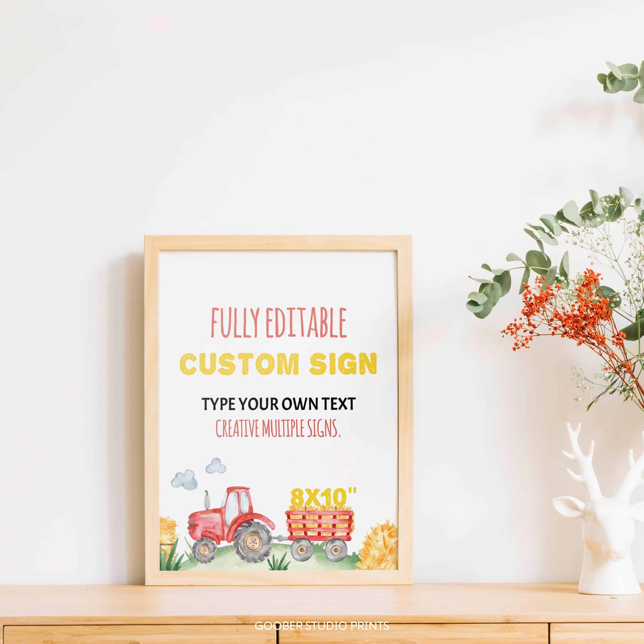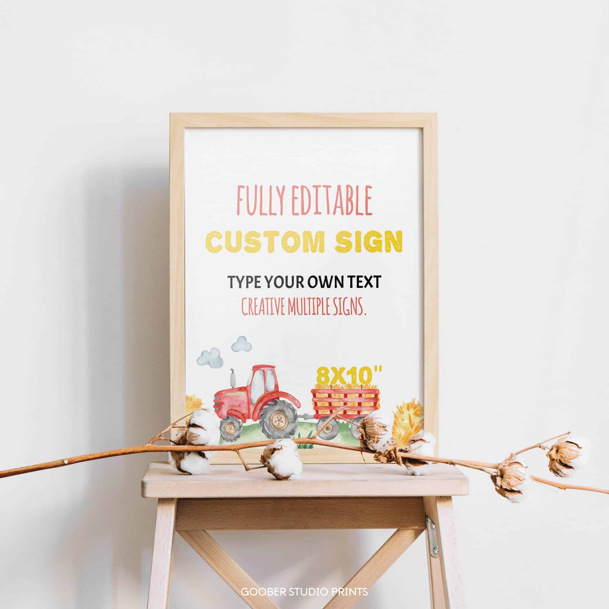 Add a personal touch to your decorations with our red tractor birthday custom sign! Fully customizable, you can include any text, name, or age to match your little farmer’s tractor birthday theme. Perfect as a welcome sign, photo prop, or backdrop, this 8×10-inch design features charming tractor graphics, making your farmyard birthday party a true hit with tractor party favors and farm-themed birthday party decorations!