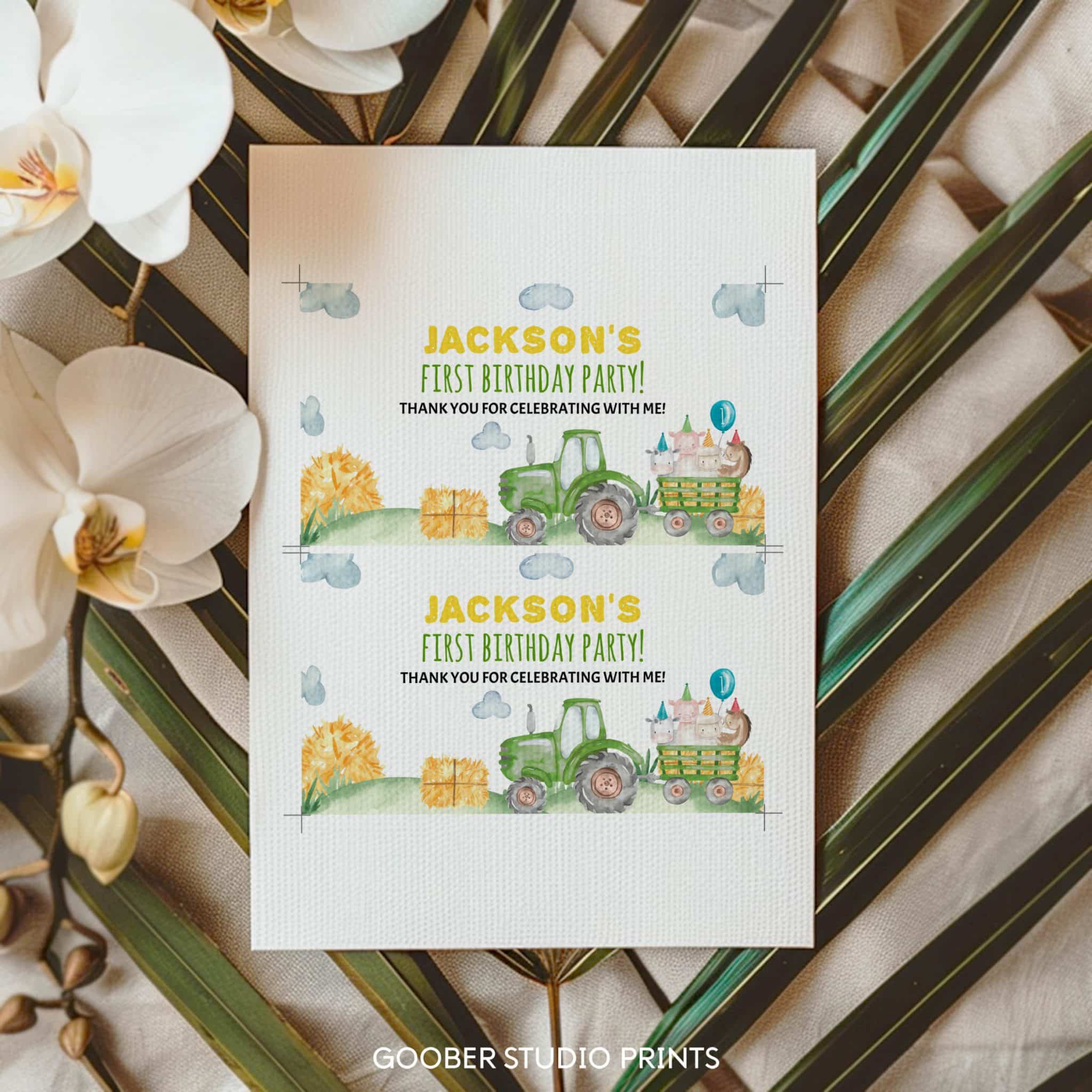 Add a festive touch to your party favors with our green tractor gable box labels! Featuring adorable tractor designs and playful farm animals, these labels can be personalized with the birthday boy’s name and age. Easily printable at home on standard paper, they attach effortlessly to gable boxes, transforming them into unique and personalized tractor birthday treats for your little farmer’s celebration. Perfect for a farmyard birthday party, complete with tractor party favors and farm-themed birthday party decorations!