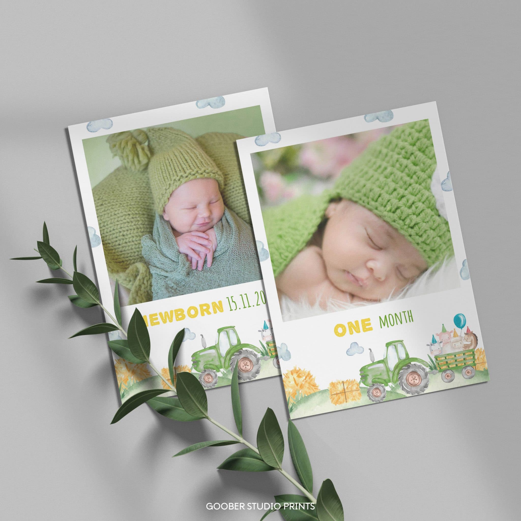 Celebrate your little farmer’s first year with our green tractor photo banner! Featuring charming tractor designs and playful farm animals, this banner includes space for 12 monthly photos, your child’s name, and age. Easily customizable and printable at home on standard 5×7 inch paper, it’s perfect for displaying at a tractor birthday theme party or as a cherished keepsake for your baby boy’s room. Pair it with tractor party favors and farmyard birthday party decorations to make the celebration truly special!