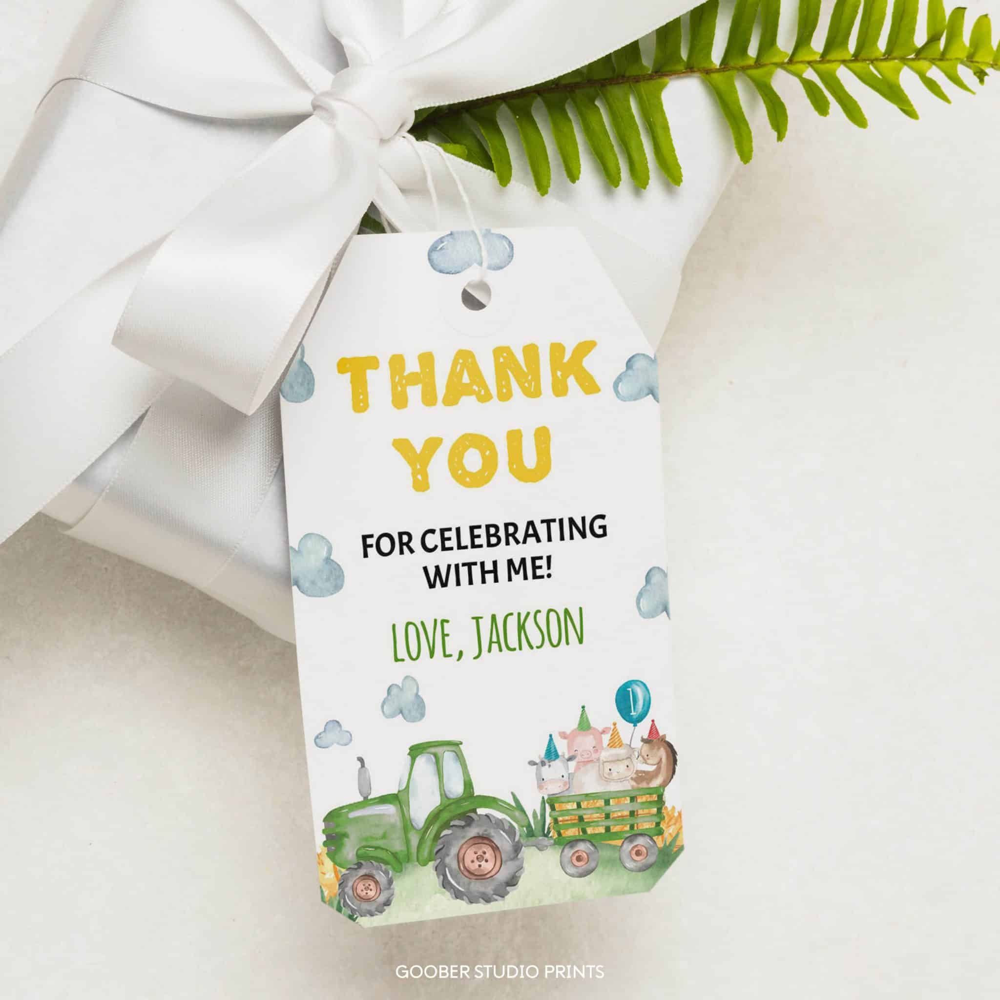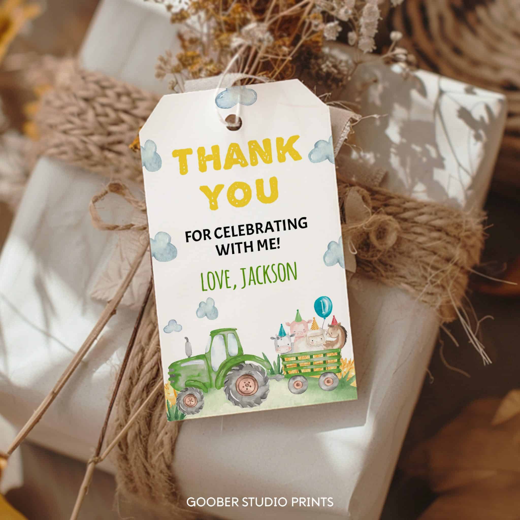 Show your gratitude with our green tractor thank you tags! Featuring cute tractor designs and playful farm animals, these tags offer space for a personalized message or “thank you” note. Easily customizable and printable at home on standard cardstock, they’re perfect for tractor party favors, gifts, or as a charming addition to your little farmer’s farmyard birthday party decorations. Add a special touch to your celebration with these farm-themed tags!