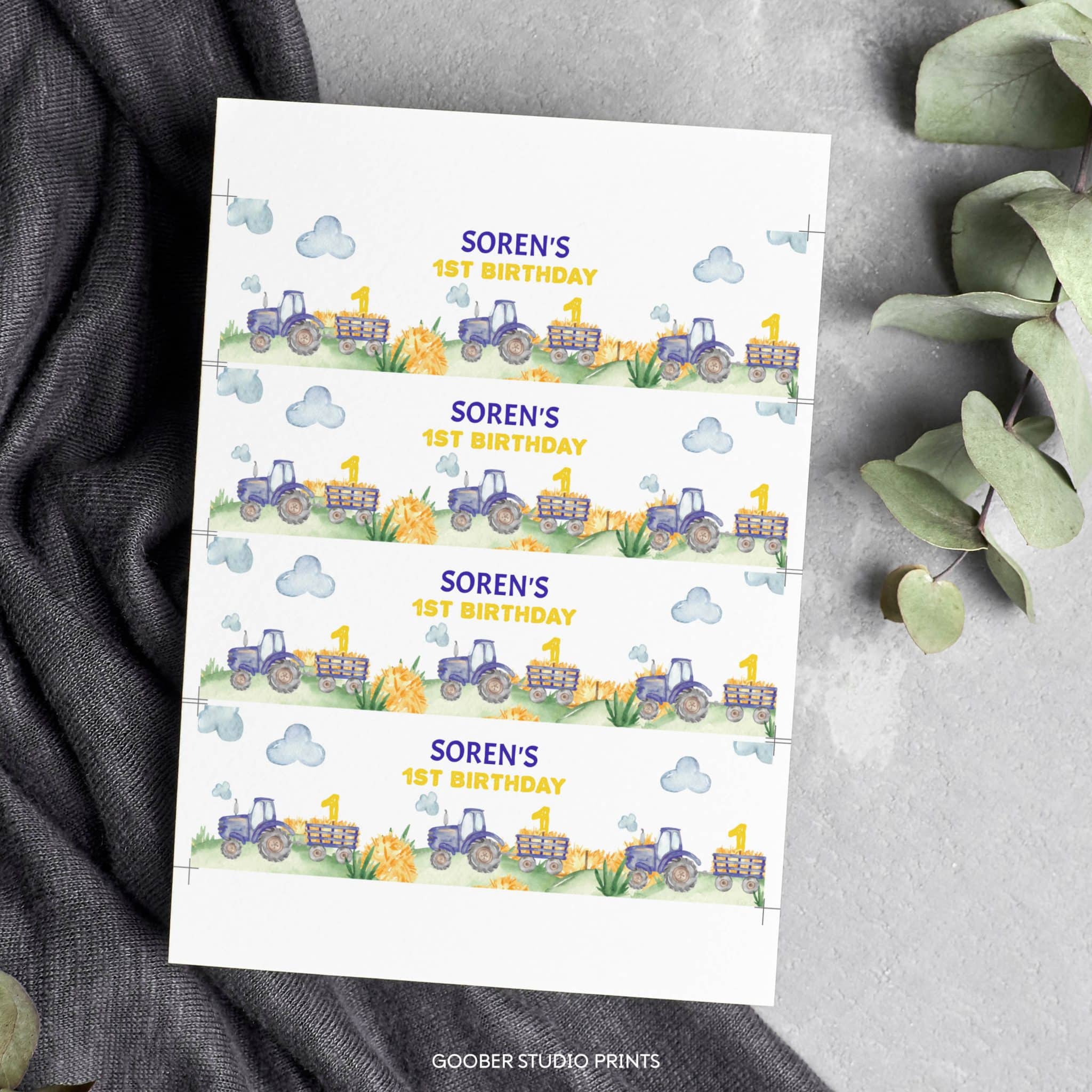 Add a charming touch to your party drinks with our blue tractor water bottle labels! Featuring adorable tractor designs, these labels can be customized with the birthday boy’s name and age. Designed to fit standard 8.5”x2” bottles, they’re easy to print at home and make the perfect addition to your tractor birthday theme decor. Complete your farmyard birthday party with these fun, farm-themed labels for a special touch on your little farmer’s big day!