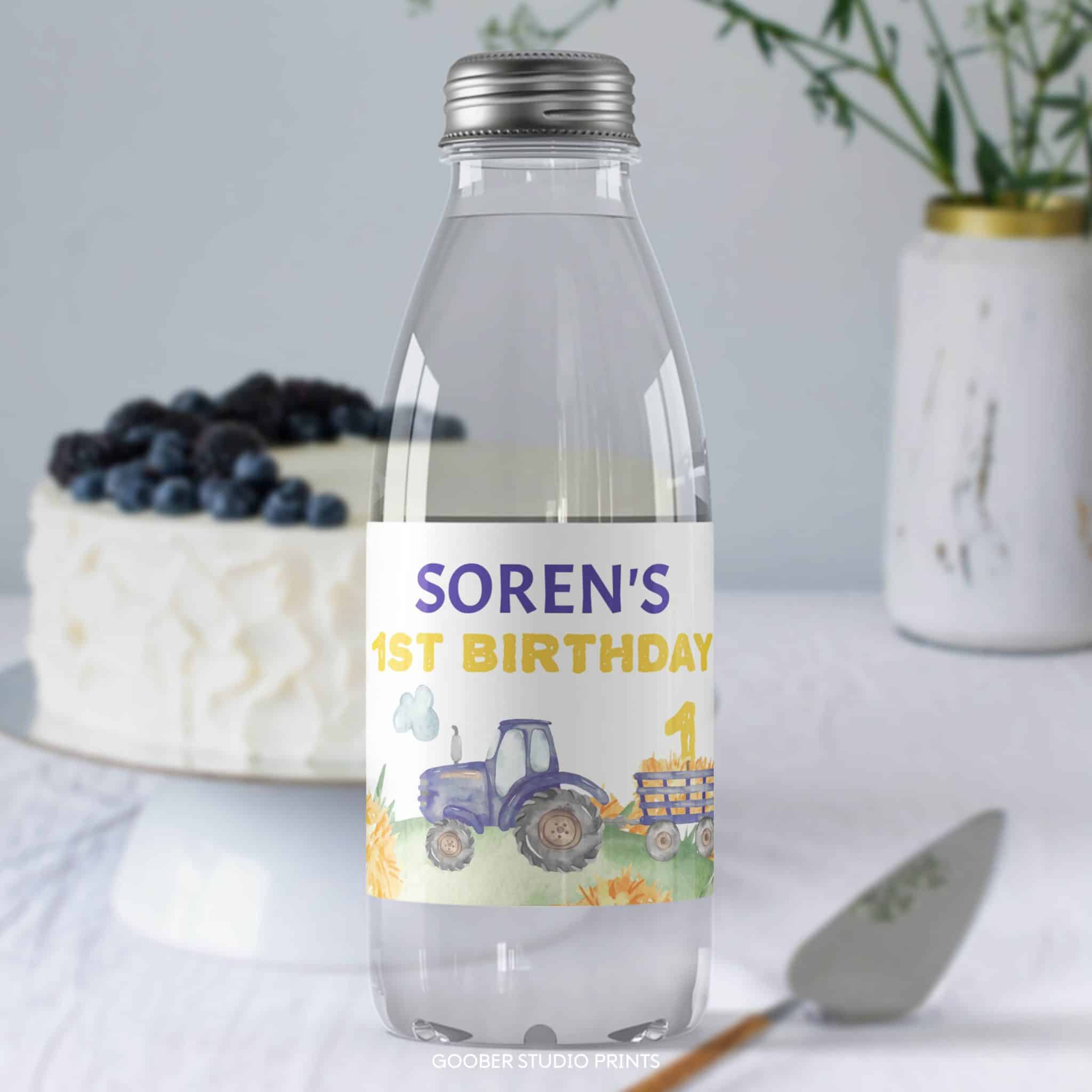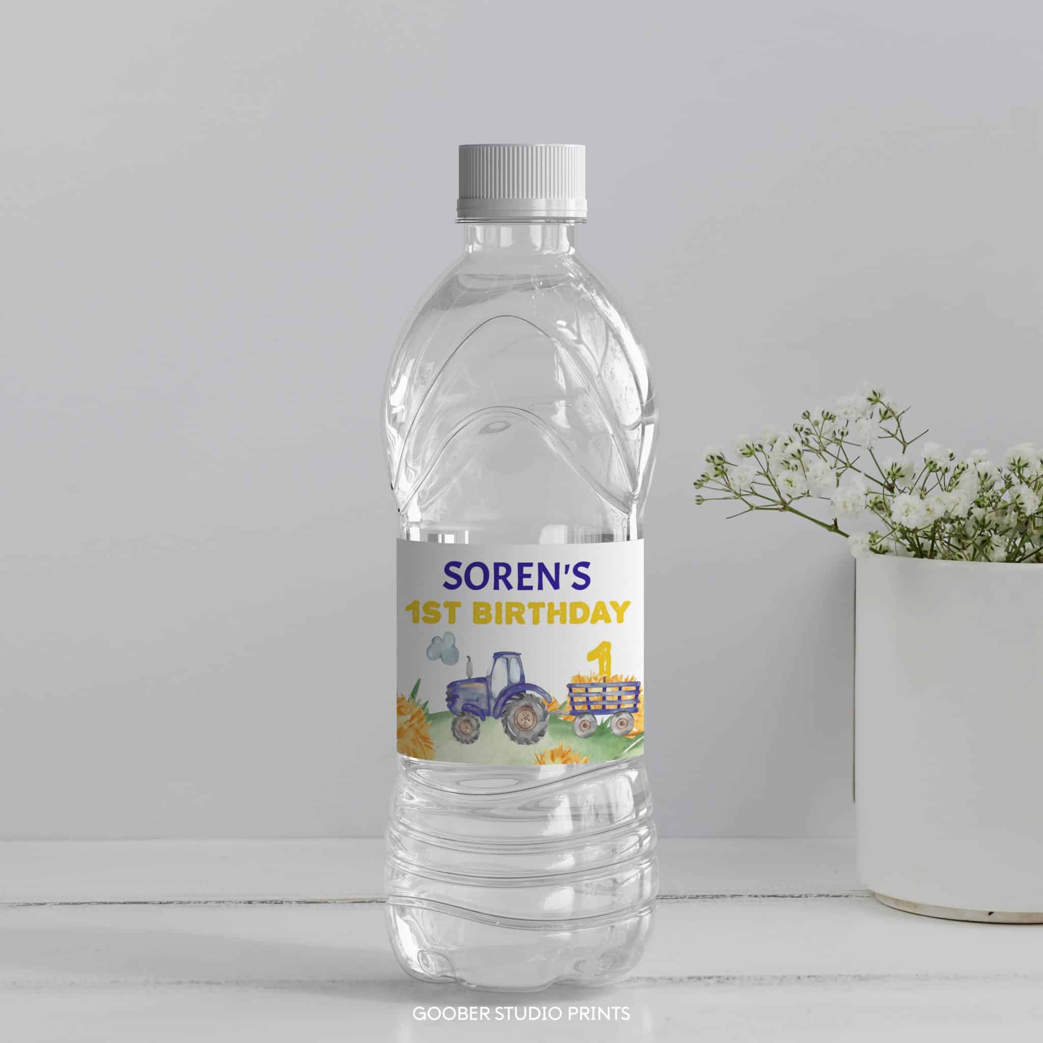 An access link to your editable tractor birthday water bottle label design will be sent to your e-mail address. The link allows you to edit, save and download your design as JPG or PDF file. The design is made for printing at 8.5×2 inches. We’re happy to answer any questions through our contact page.