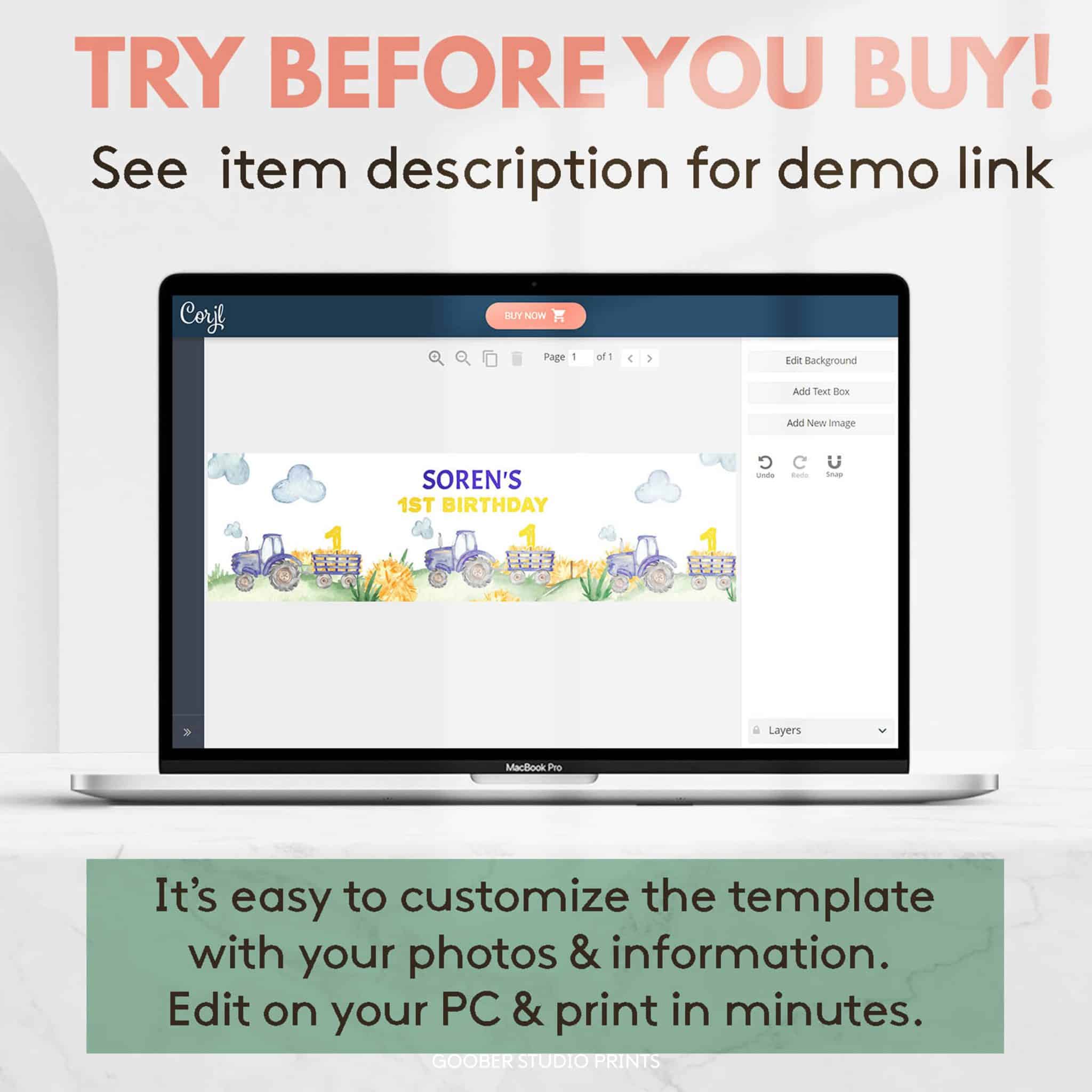 1. After you place an order you will receive an email from Corjl to access your editable tractor birthday template. Please remember to provide your email at checkout.