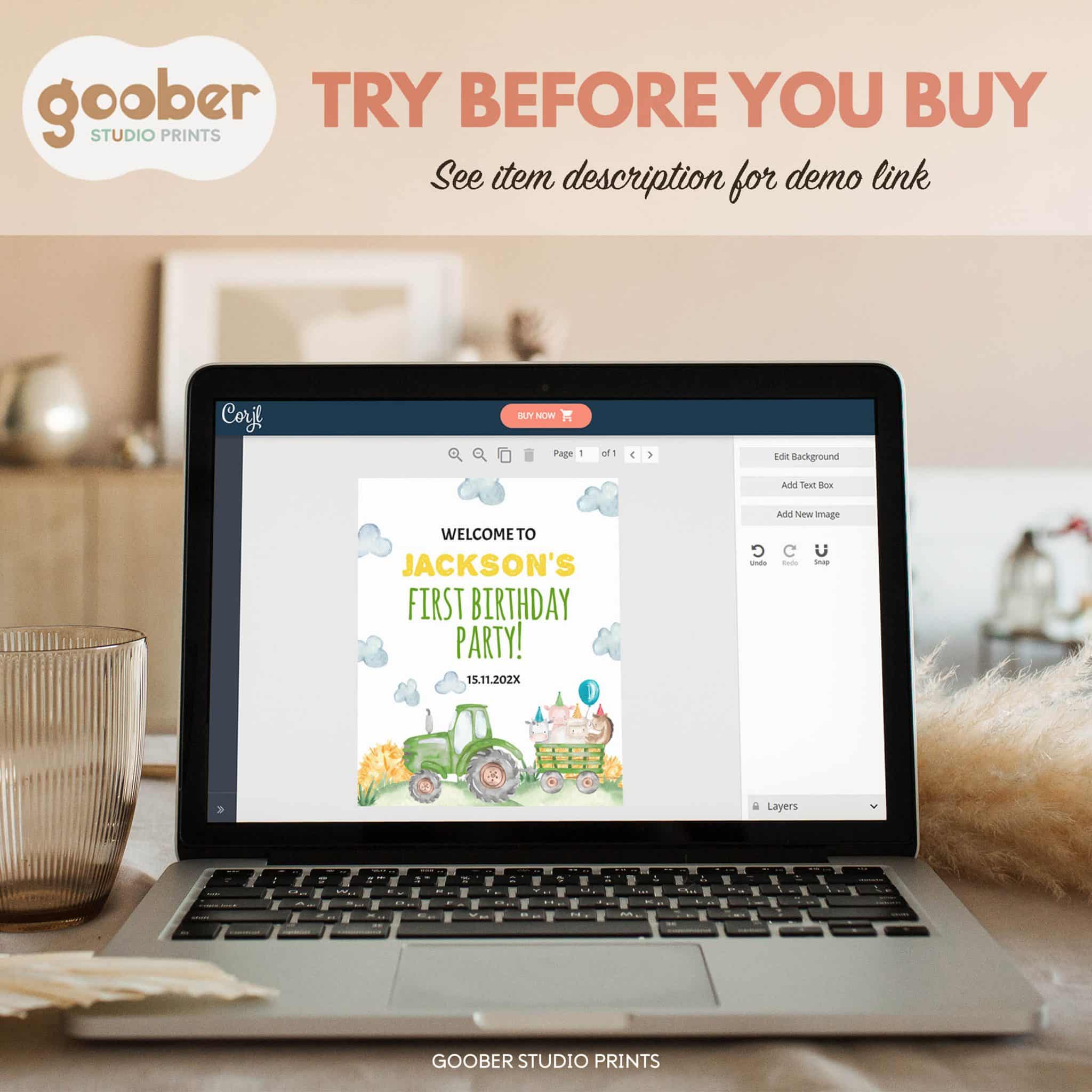 Welcome guests to your little farmer’s birthday celebration with our green tractor welcome sign! Featuring charming tractor designs and playful farm animals, this sign adds a fun, rustic touch to your party. Personalize it with the birthday boy’s name and age to create the perfect backdrop or entrance sign for your tractor birthday theme. Complete your farmyard birthday party with this farm-themed decoration to set the stage for a memorable celebration!