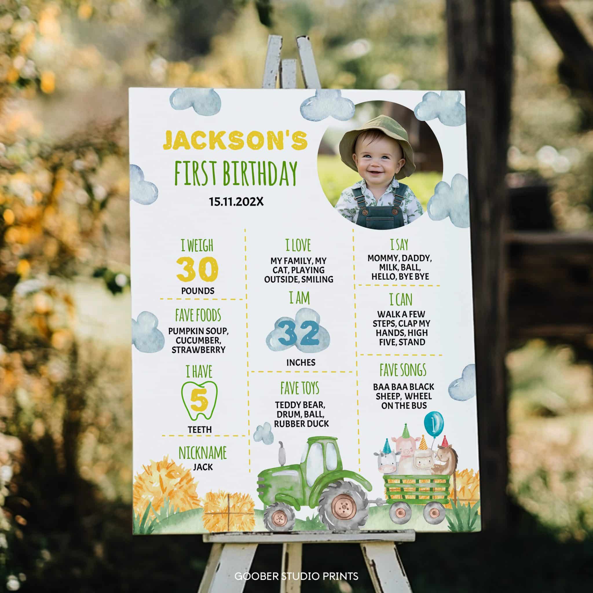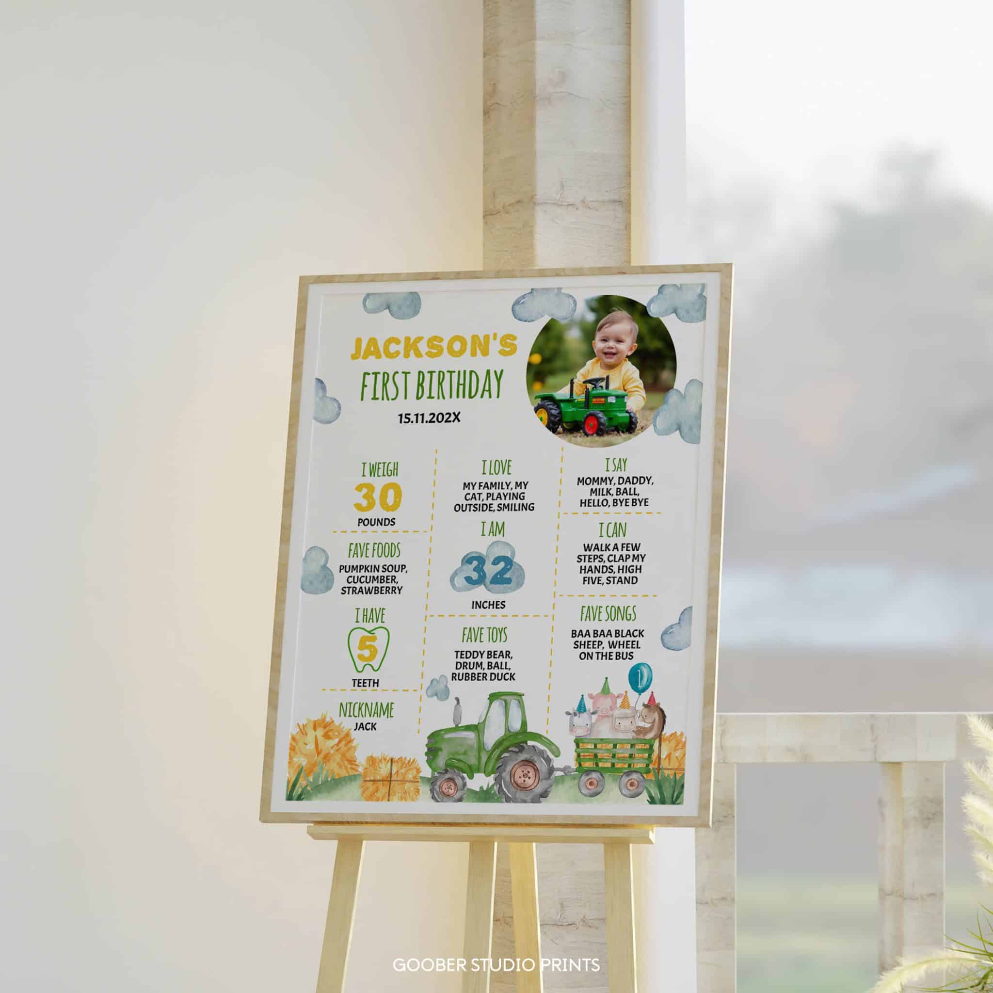Commemorate your little farmer’s big day with our green tractor first year milestone photo poster! Featuring charming tractor designs and playful farm animals, this poster offers space to showcase your baby boy’s name, milestones, achievements, and treasured memories. A perfect keepsake for a tractor birthday theme, it’s a wonderful way to celebrate his first year and create lasting memories of this special farmyard birthday party occasion.