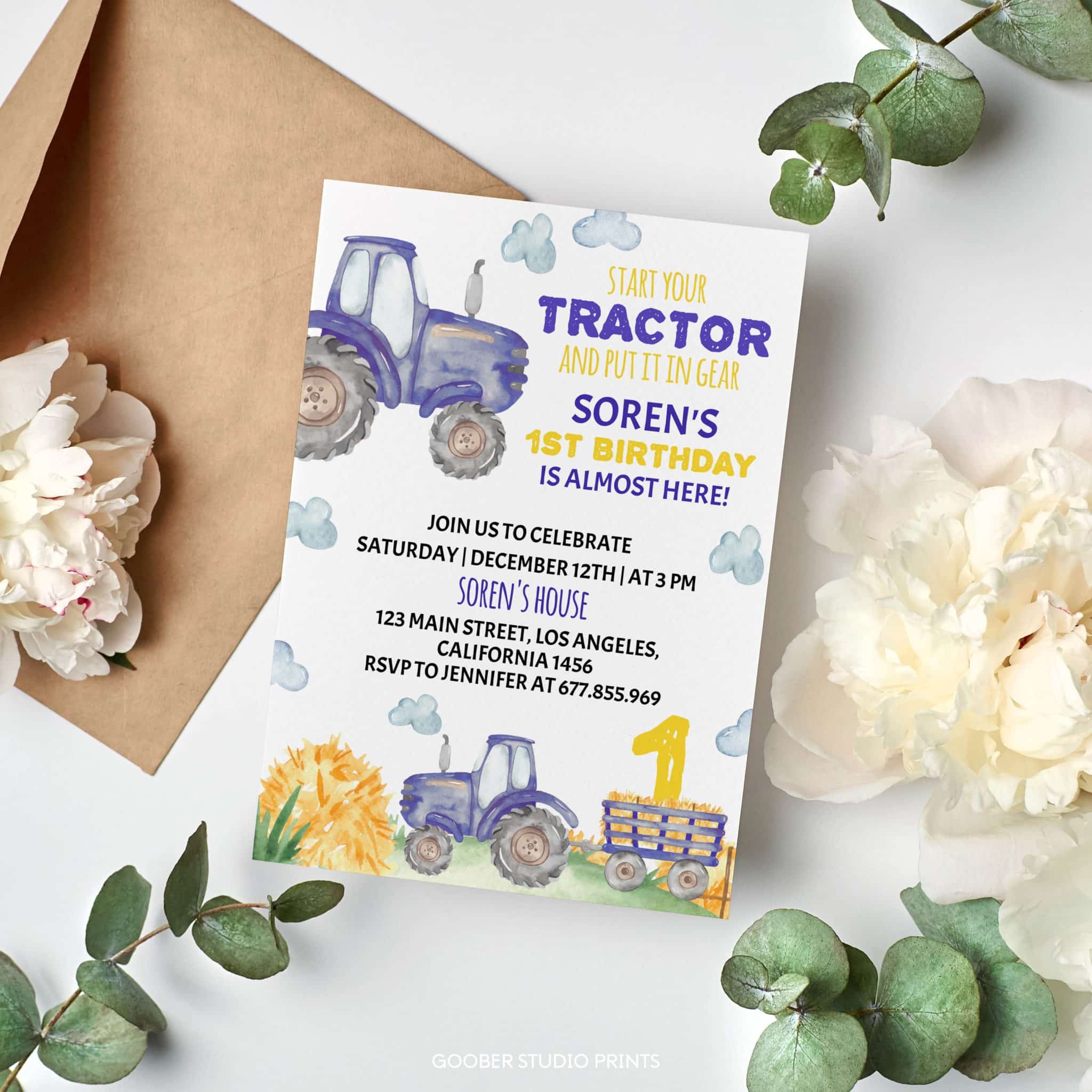 Rev up the fun and celebrate your little boy’s first birthday with our blue tractor-themed birthday invitation! Featuring playful tractor designs and farmyard charm, this invitation sets the stage for a delightful farmyard birthday party. Perfect for a tractor birthday theme, it brings a touch of rustic joy to his special day. With plenty of space to personalize all your party details, it’s easy to customize and print at home. Pair it with tractor party favors and farm-themed birthday party decorations to create a celebration that’s as memorable as a day on the farm!