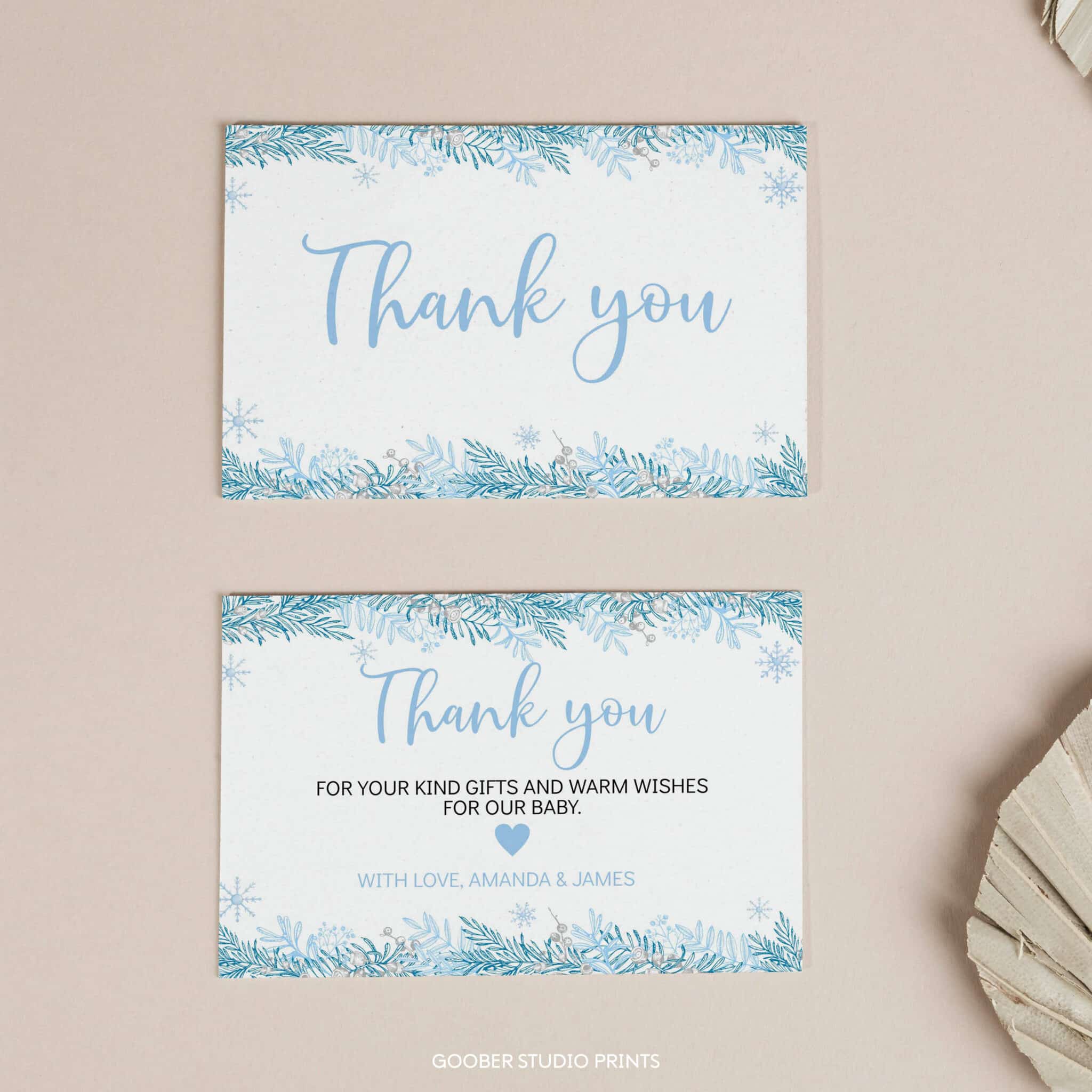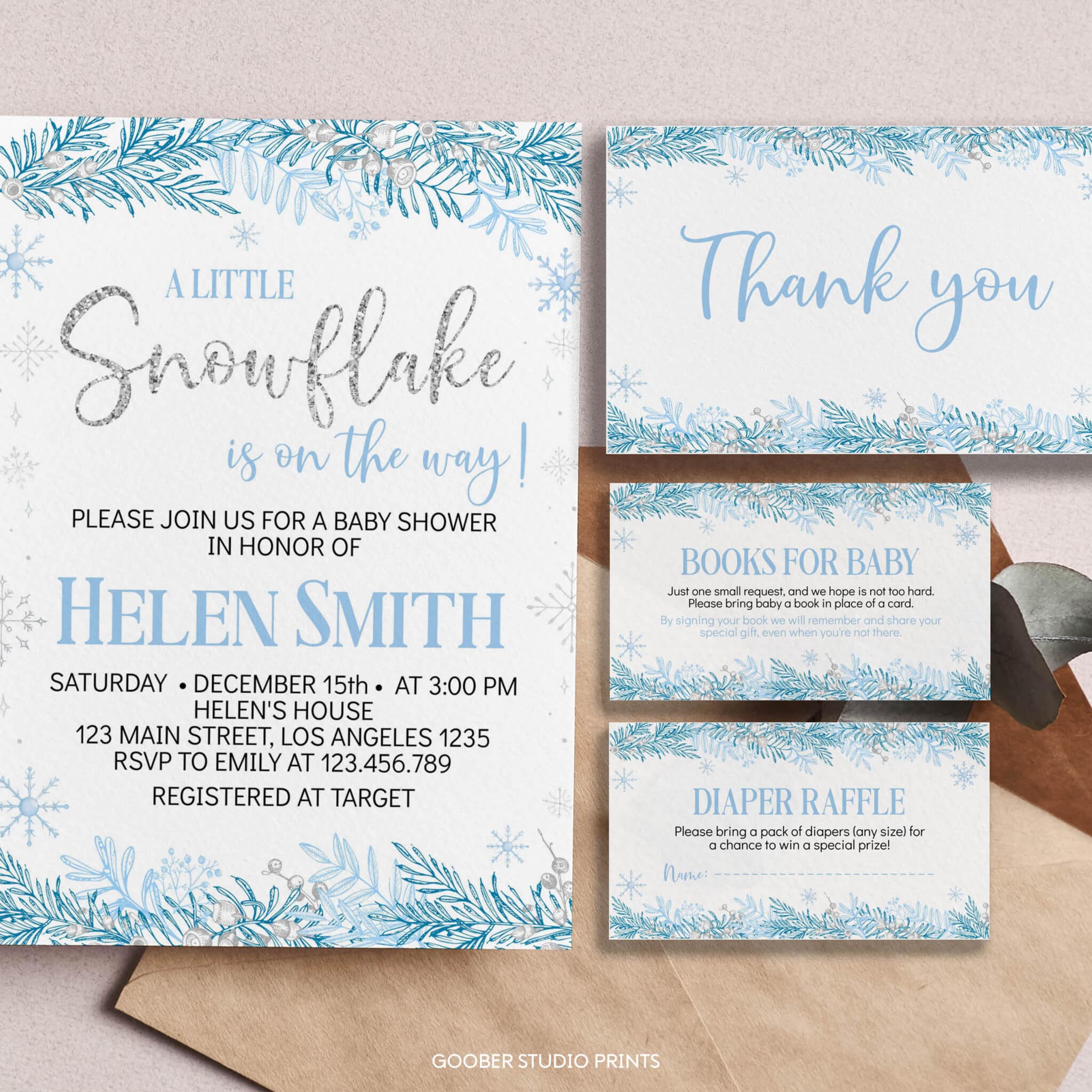 An access link to your editable winter baby shower invite, diaper raffle card, books for baby card, and folded thank you card designs will be sent to your e-mail address. The link allows you to edit, save and download your design as JPG or PDF file. The printable baby shower invitation is made for printing at 5×7 inches. The other set items printing sizes are: