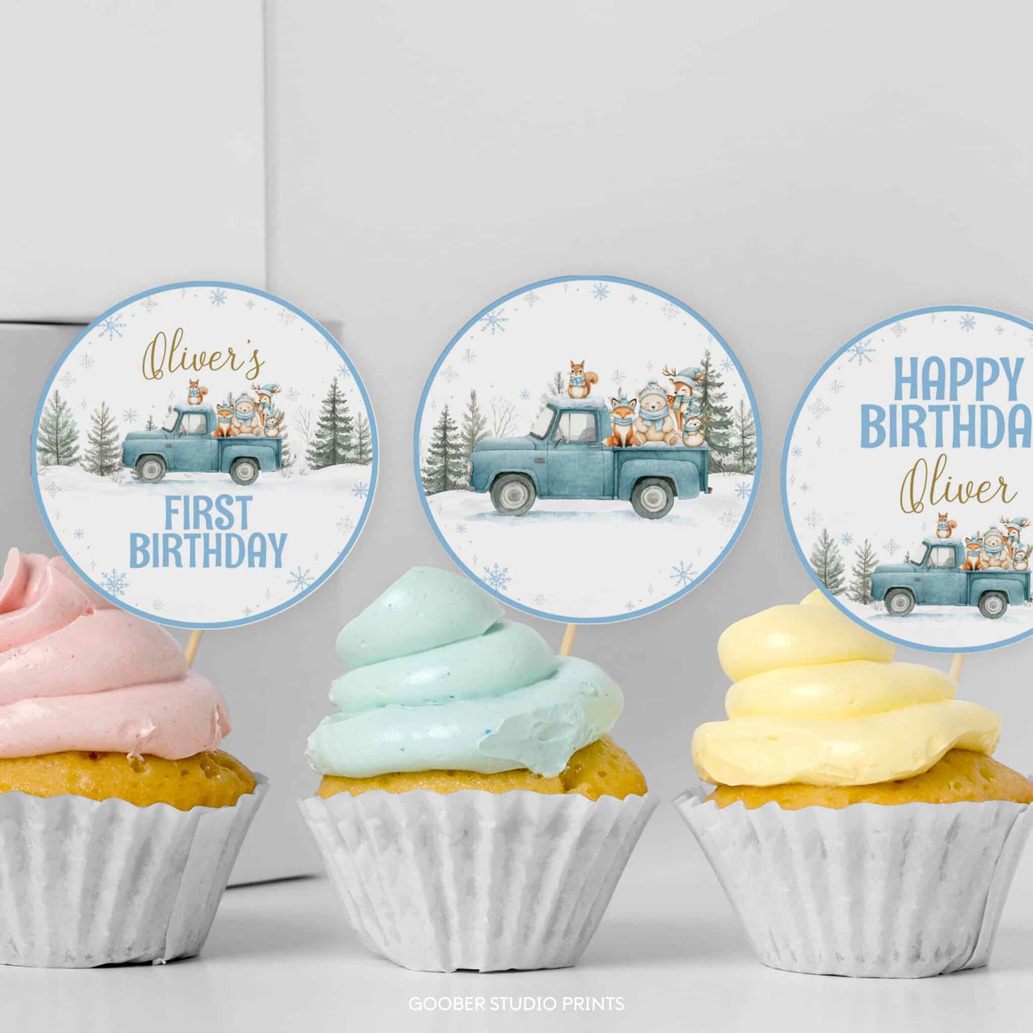 Add a magical touch to your desserts with our winter onederland cupcake toppers! Designed with a cute blue truck, playful woodland animals, shimmering snowflakes, and charming winter forest details, these toppers are perfect for celebrating your little one’s winter birthday. Personalize with your child’s name and age, then print at home on standard cardstock to decorate cupcakes, cake pops, muffins, and more. A fun, whimsical, and budget-friendly way to bring snowy charm to your winter onederland party!