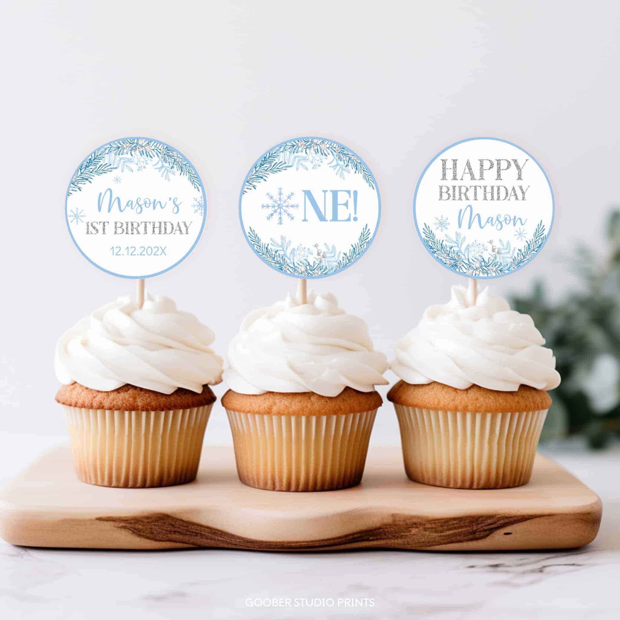 Top off your party treats with our winter birthday cupcake toppers! Featuring shimmering silver accents and delicate snowflake designs, these toppers bring a magical touch to your winter onederland celebration. Easily customizable with your birthday boy’s name and age, they’re perfect for decorating cupcakes, cake pops, muffins, and more. Printable at home on standard cardstock, these festive toppers are a fun and budget-friendly way to make your winter birthday party truly sparkle.
