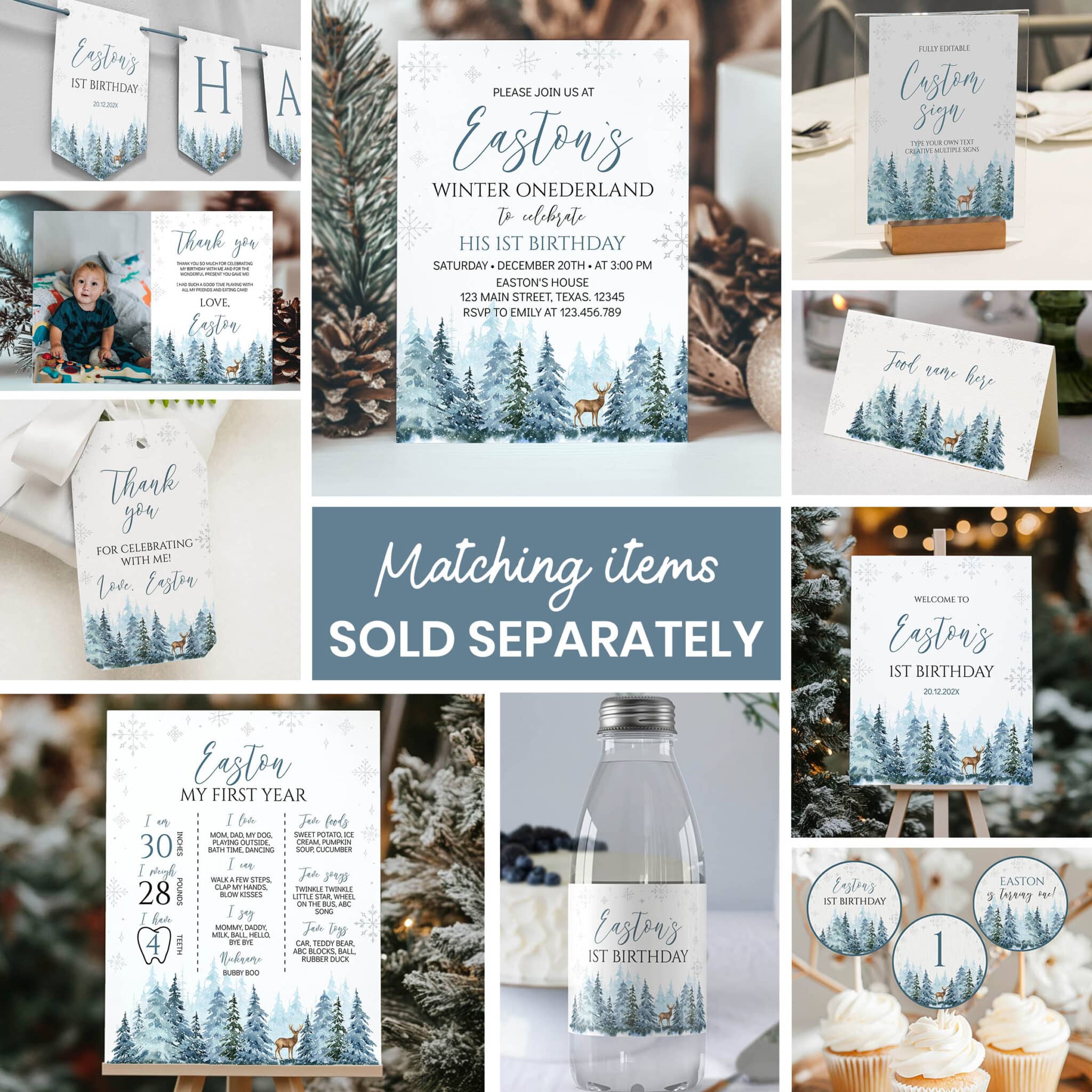 Add a festive touch to your party favors with our winter birthday gable box labels! Featuring playful reindeer and snowy woodland details in a soft watercolor design, these labels can be personalized with your birthday boy’s name and age. Easily printable at home on standard paper, they attach effortlessly to gable boxes, transforming them into unique and personalized treats that perfectly match your winter onederland boy birthday celebration.