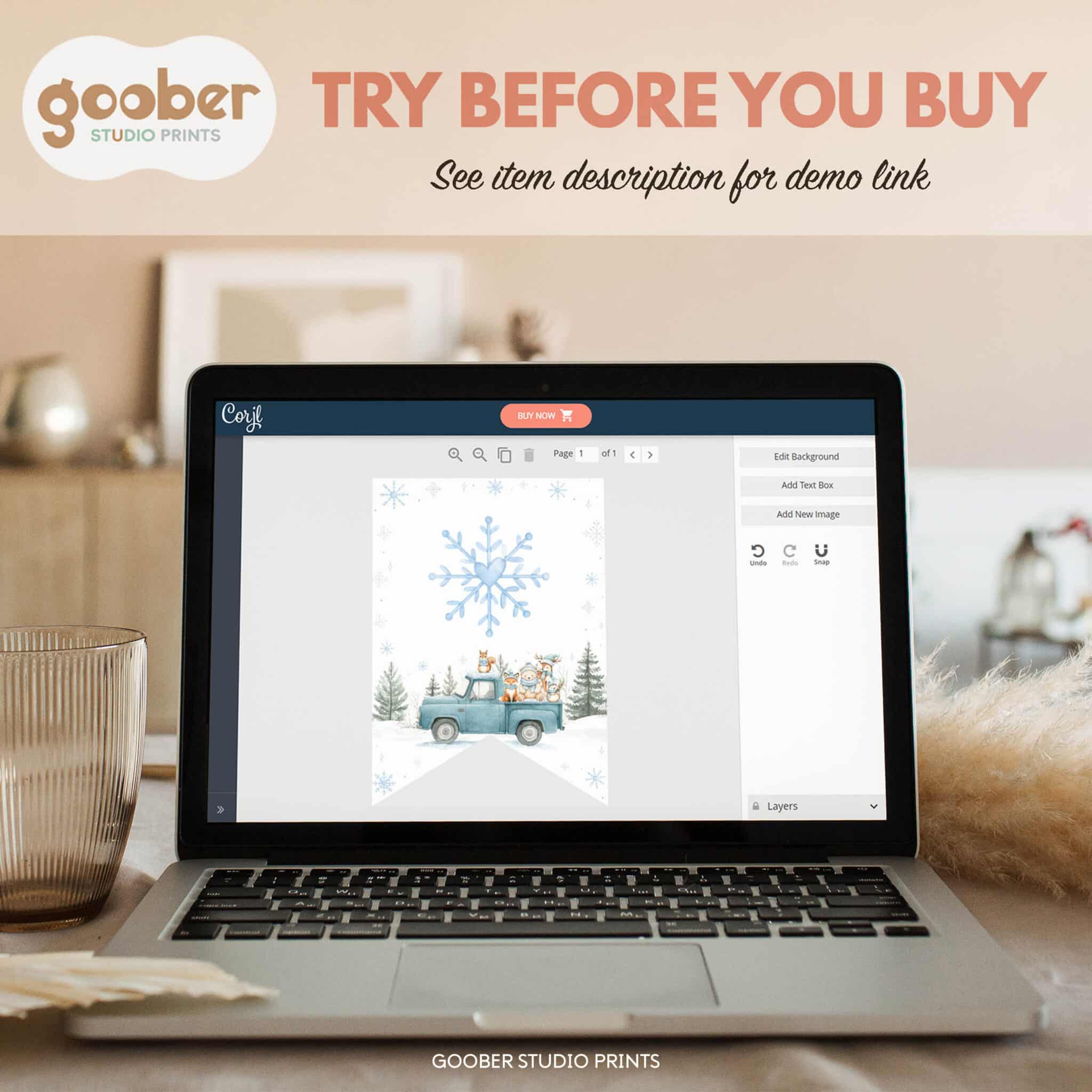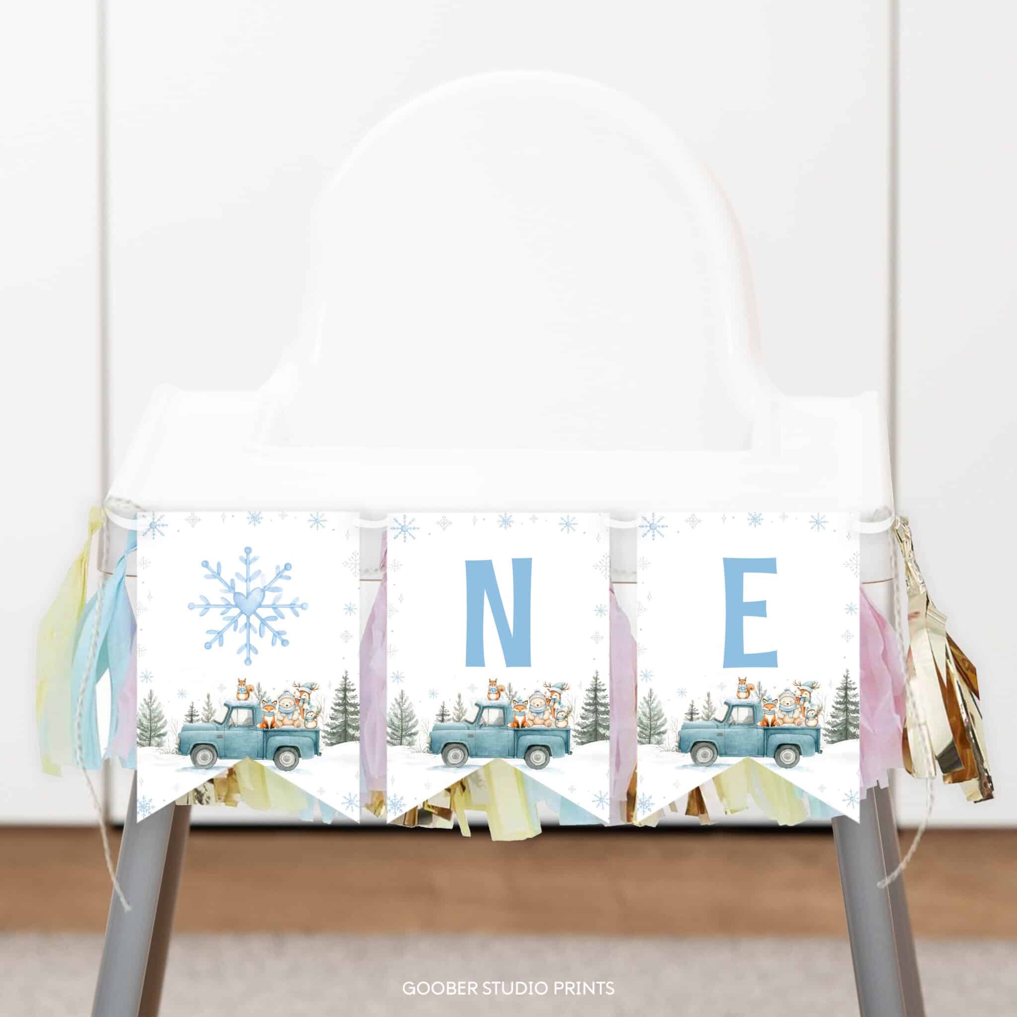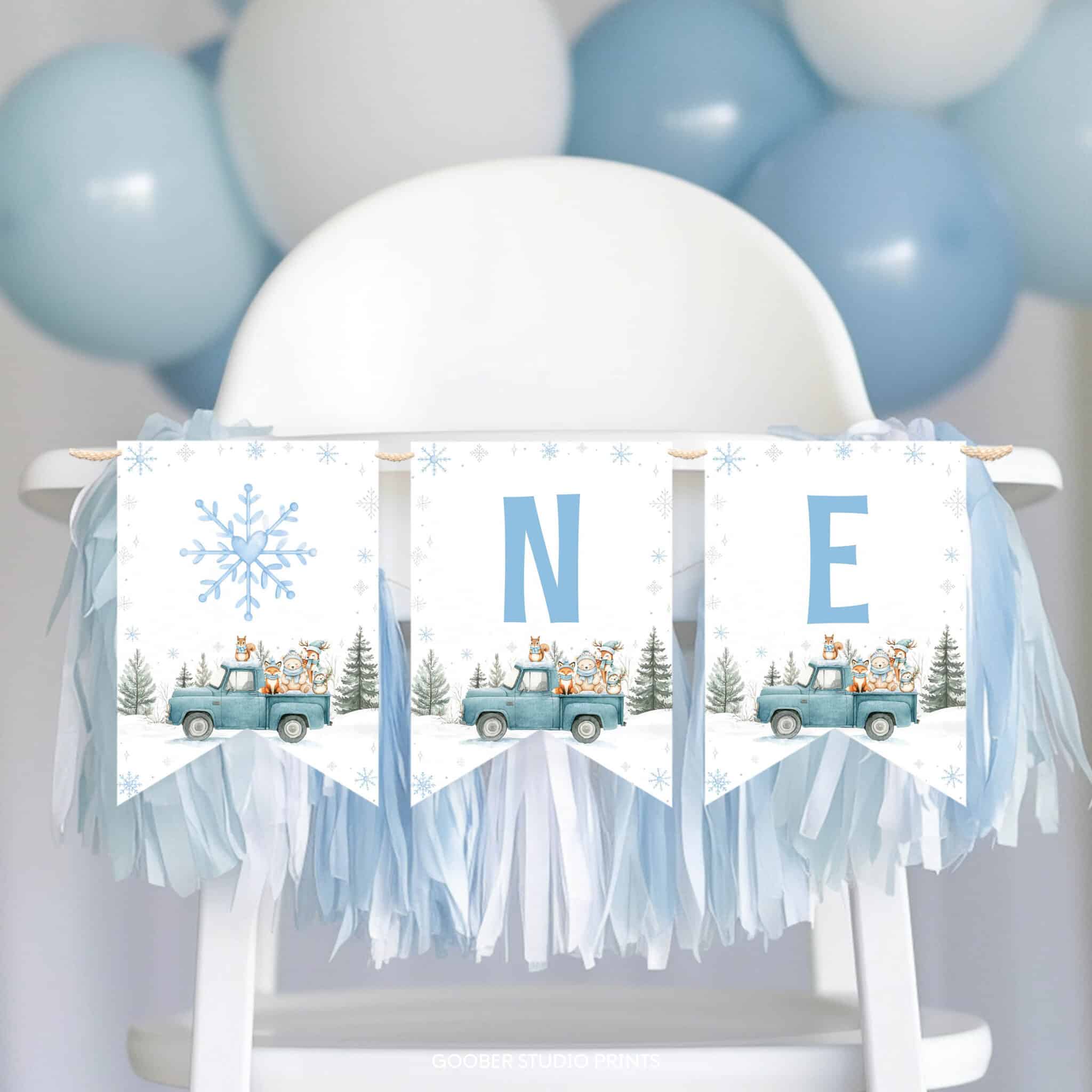 Make your little one’s winter birthday extra special with our adorable winter onederland highchair banner! Designed with a cute blue truck, playful woodland animals, sparkling snowflakes, and cozy winter forest accents, this charming banner spells out “one” in soft, whimsical lettering. Perfect for highlighting your baby’s milestone moment, it turns the highchair into a magical party centerpiece. Easy to print at home, it’s a sweet and budget-friendly addition to your winter onederland celebration!