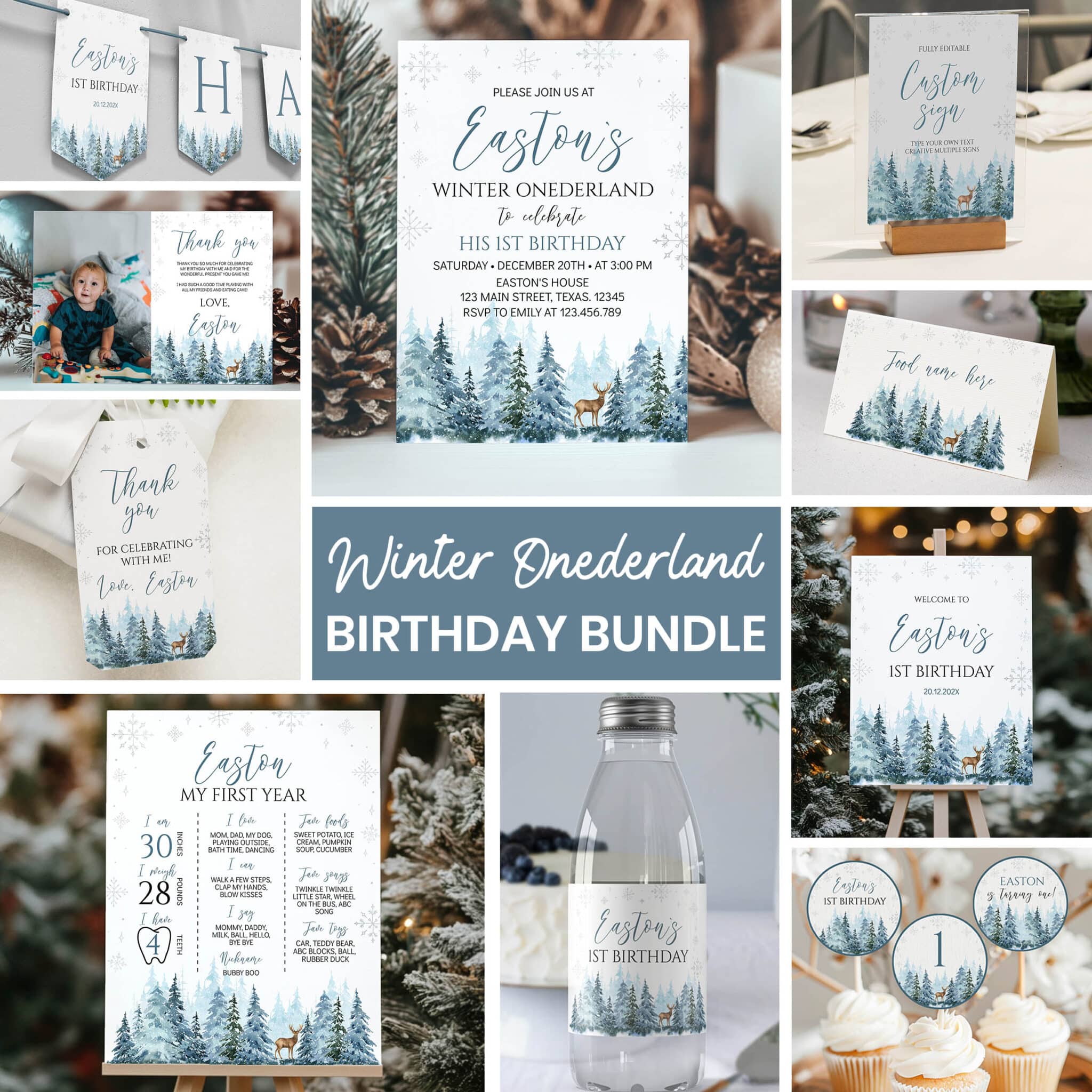 Get everything you need for a magical celebration with our watercolor winter birthday bundle! This all-in-one package features playful reindeer and snowy woodland details in soft, festive tones—perfect for your baby boy’s special day. The bundle includes invitations, banners, cupcake toppers, favor tags, and more. Each item can be personalized with your birthday boy’s name, date, and party details, making it the perfect choice for a fun and memorable winter onederland boy birthday celebration. See the full bundle contents below!