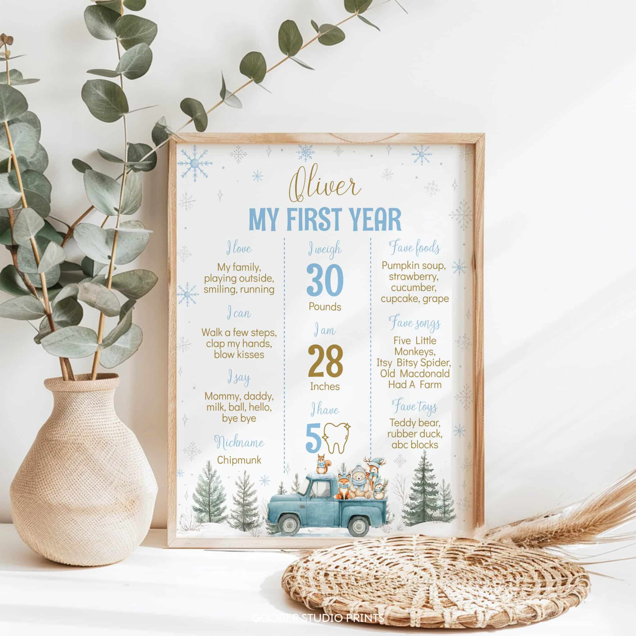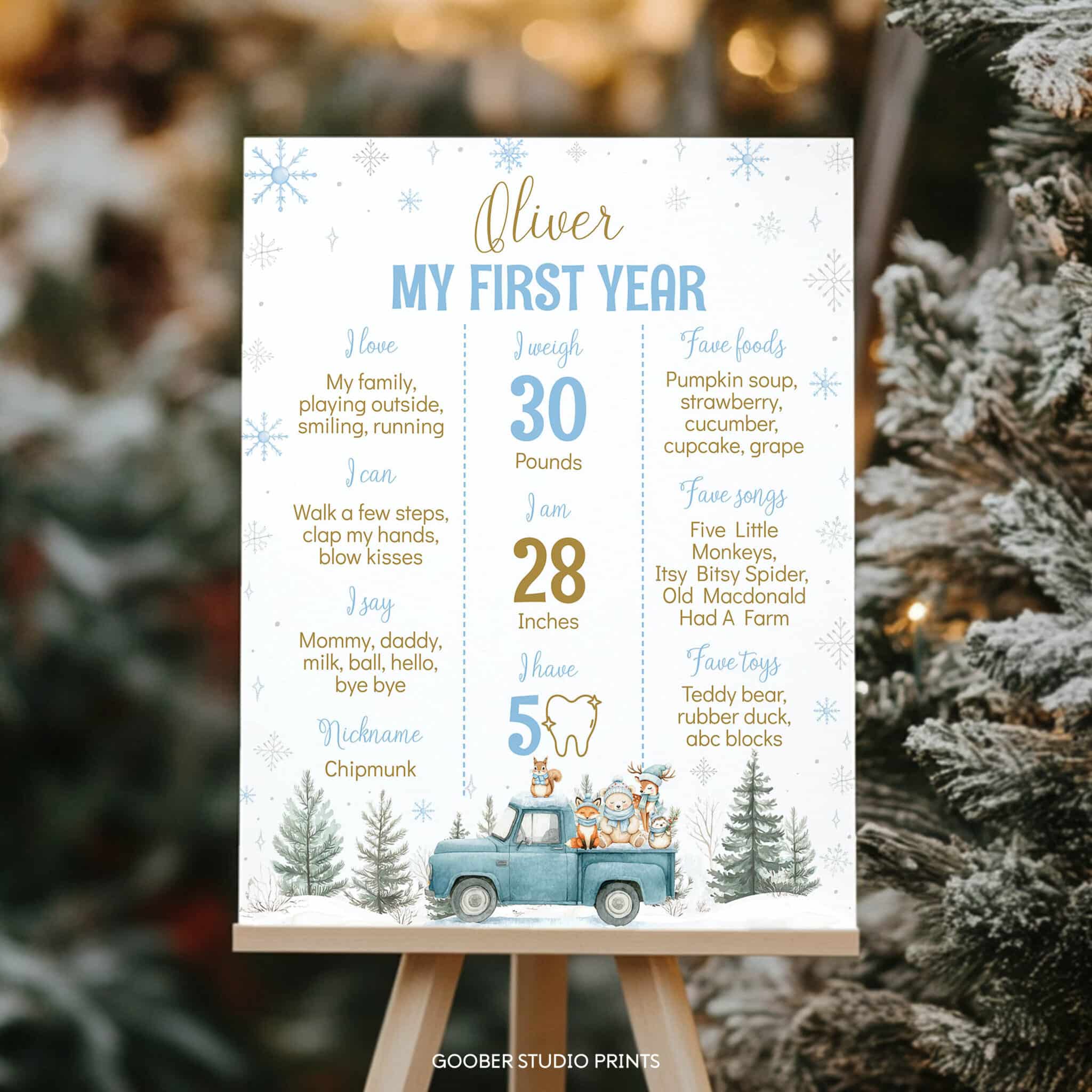 Celebrate your little one’s special day with our winter onederland milestone poster! Featuring a cute blue truck, playful woodland animals, sparkling snowflakes, and enchanting winter forest accents, this poster beautifully highlights your child’s name, milestones, favorites, and precious memories. Perfect for a cozy winter birthday celebration, it also makes a lovely keepsake to cherish long after the party. A heartfelt and charming addition to your winter onederland décor!