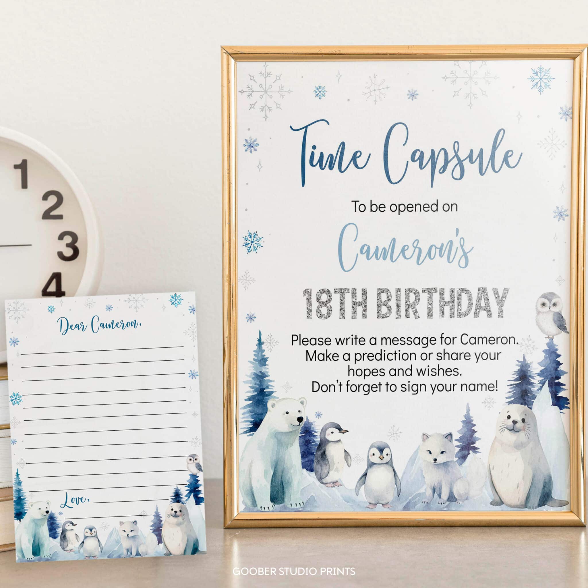 Create precious keepsakes with our winter birthday time capsule set! Adorned with adorable arctic animals, sparkling snowflakes, and frosty woodland accents in a soft watercolor style, this set includes a time capsule sign and matching cards for guests to share wishes, memories, and predictions for your little one’s future. Perfect for displaying at a winter onederland celebration, it’s a heartfelt addition to your child’s winter birthday—a treasured memento to open and enjoy for years to come.