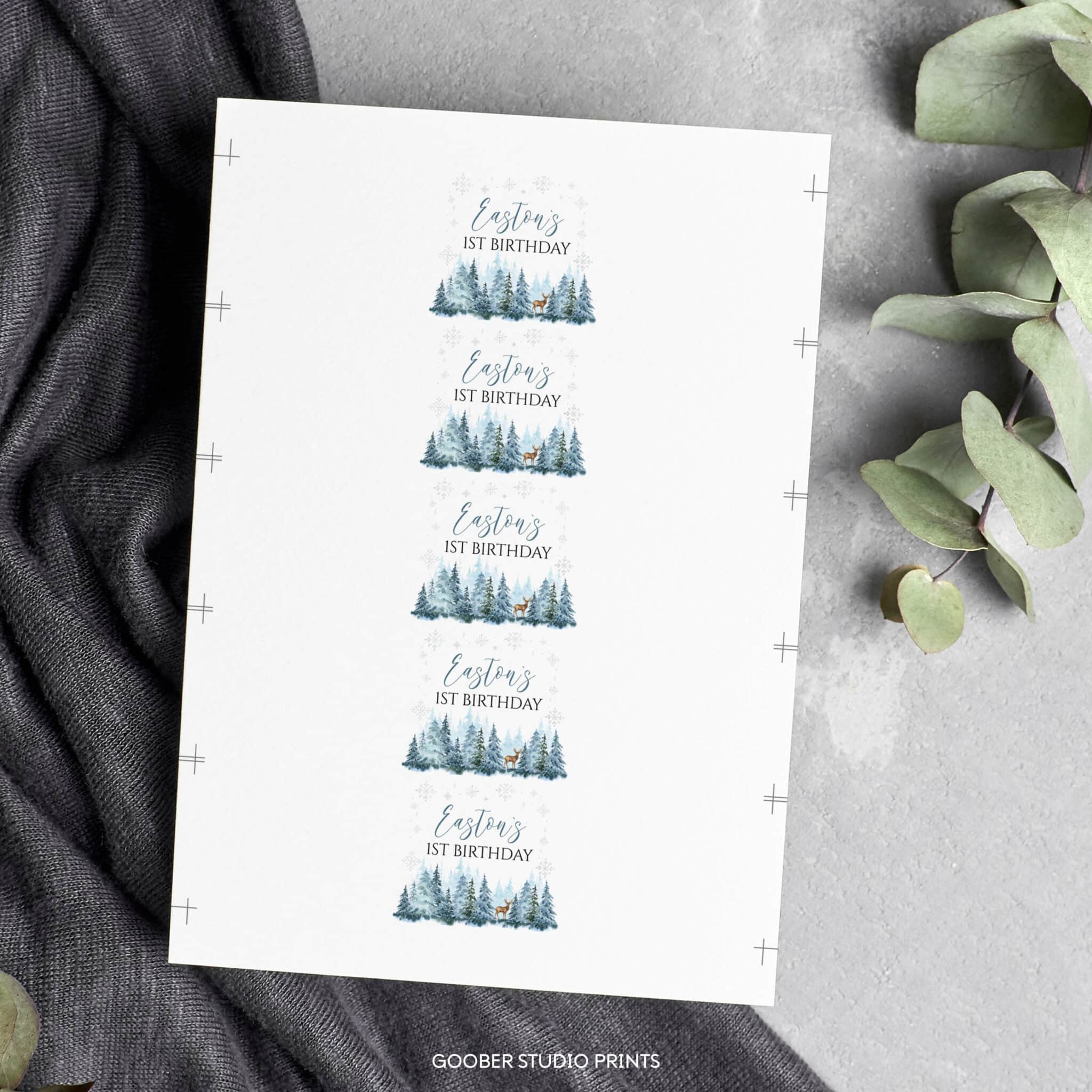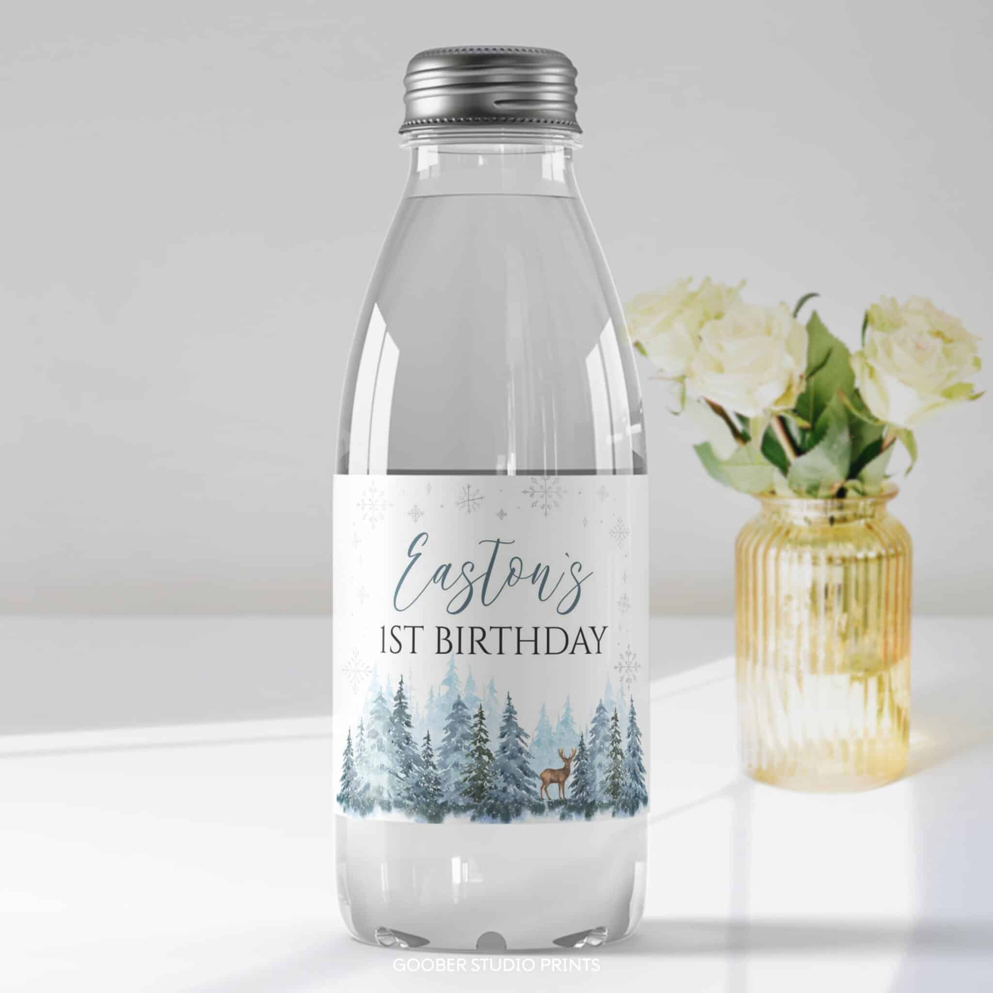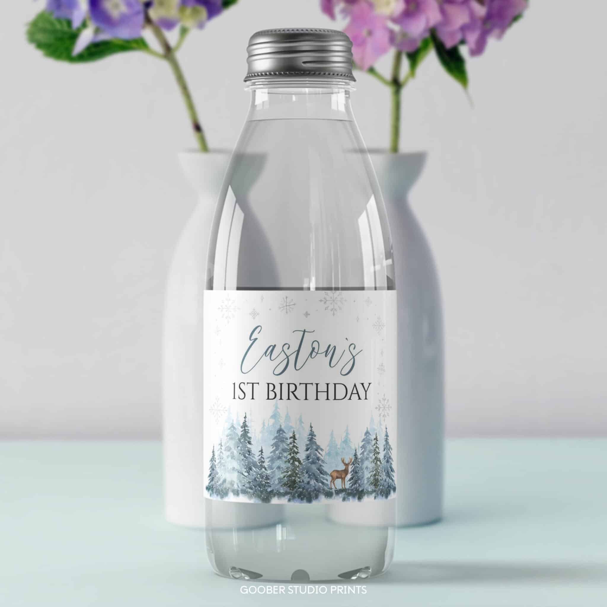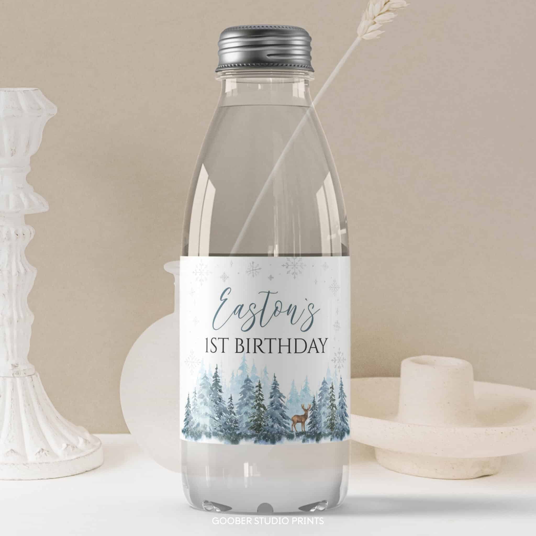 Add a charming touch to your party drinks with our winter birthday water bottle labels! Featuring playful reindeer and snowy woodland accents in a soft watercolor design, these labels can be customized with your birthday boy’s name and age. Designed to fit standard 8.5”x2” bottles, they’re easy to print at home and make a perfect addition to your winter onederland boy birthday decorations.