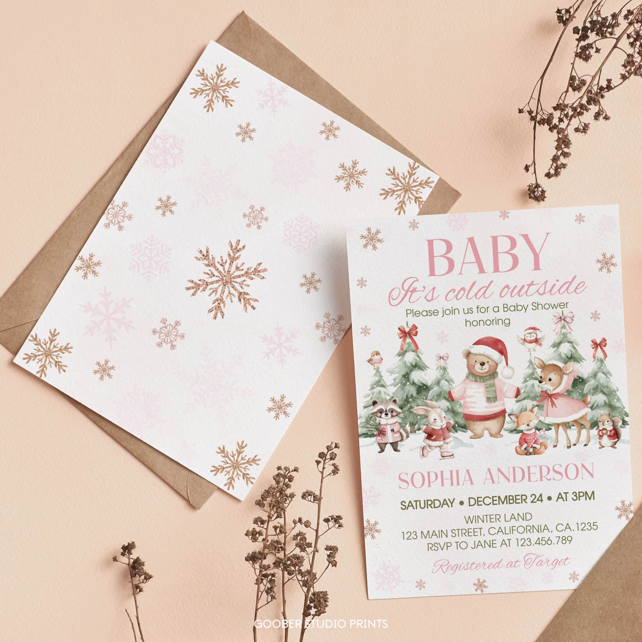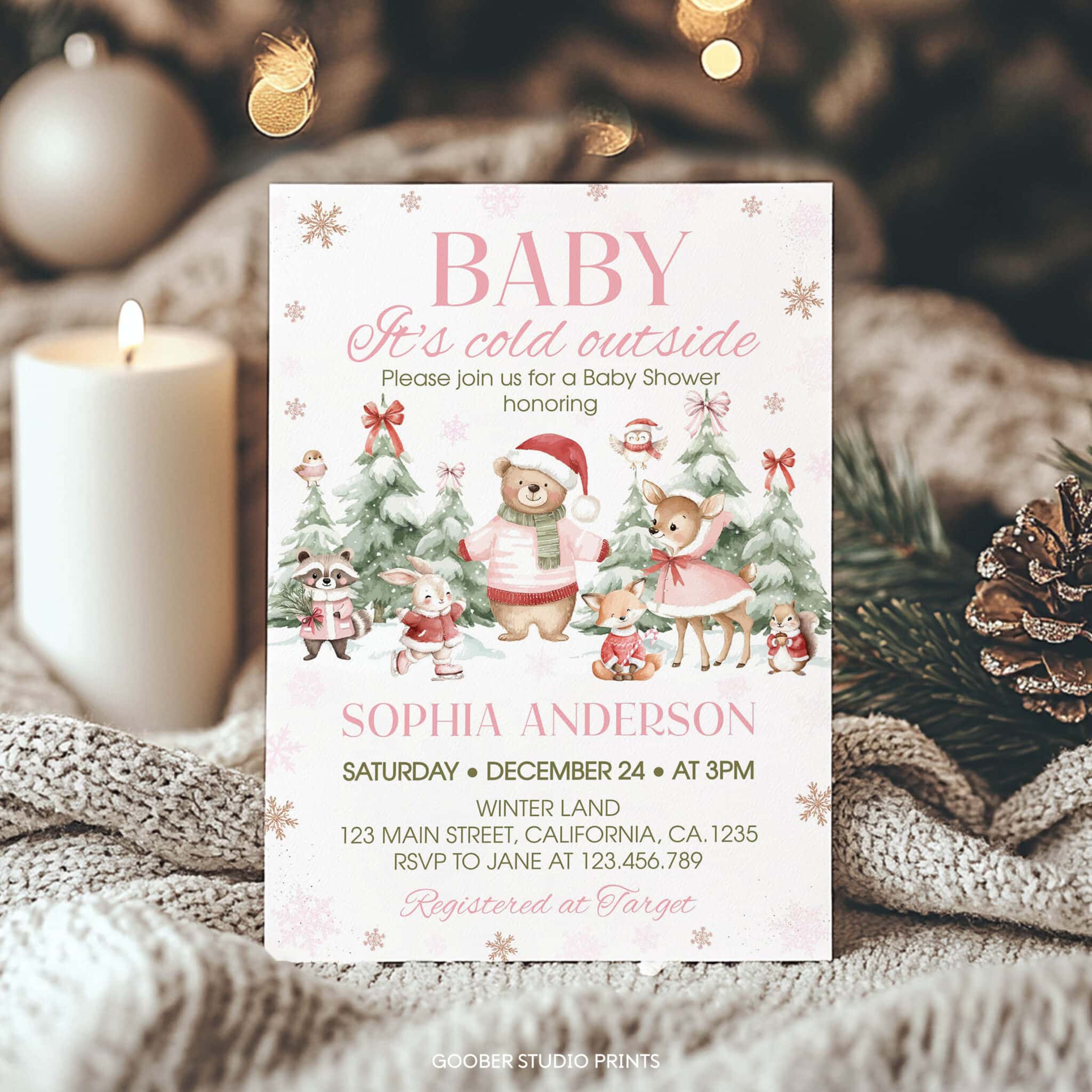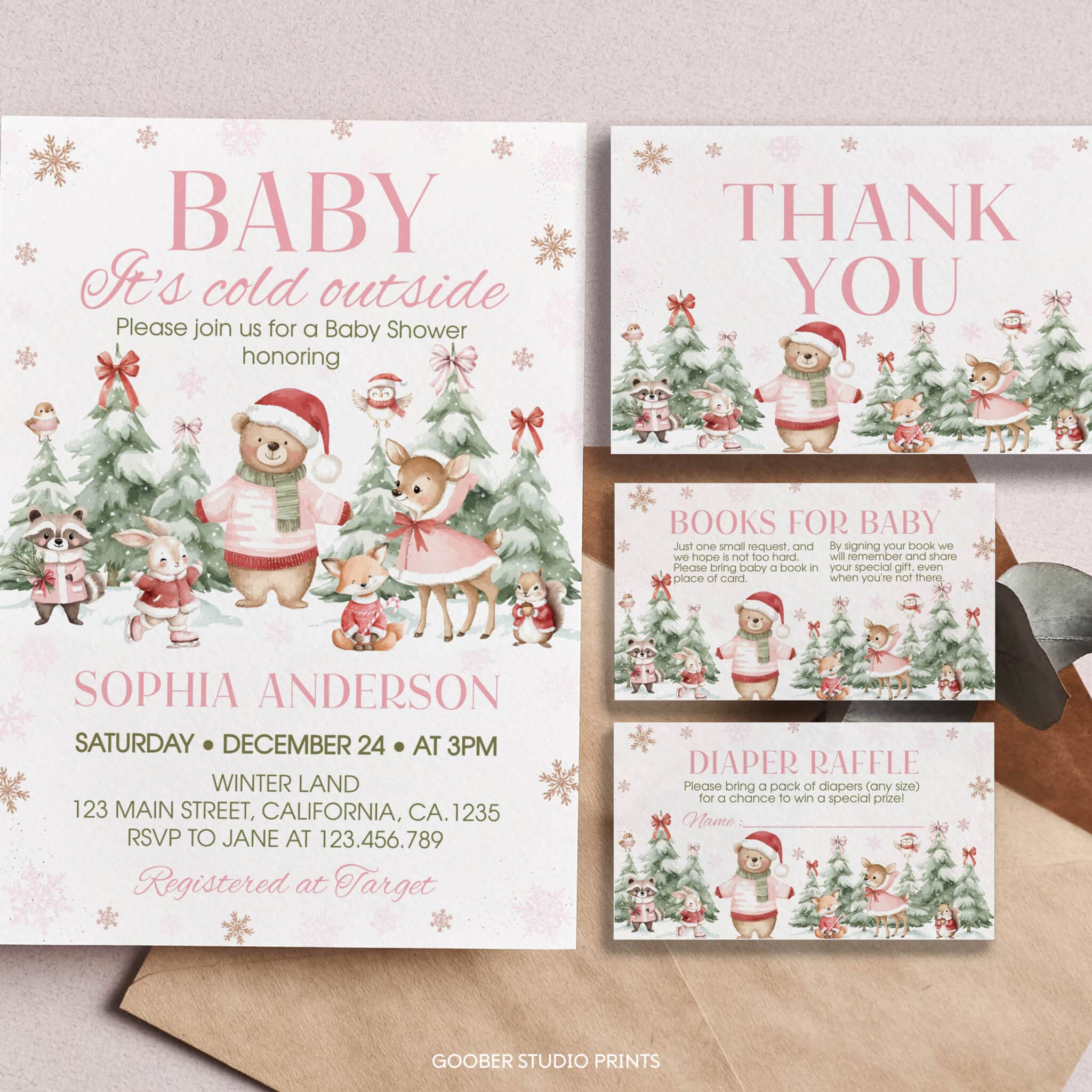 Celebrate your baby girl with our charming winter Christmas baby shower invitation set! Designed with adorable woodland animals, shimmering snowflakes, and peaceful snowy forest accents, this collection beautifully captures the cozy spirit of a winter party with a festive Christmas touch. The customizable invitation lets you include all your shower details—date, time, and location—while the matching pieces include a diaper raffle card, a Books for Baby card, and a coordinating thank-you card. A heartwarming winter-inspired set that brings seasonal magic and woodland charm to your Christmas baby shower celebration.