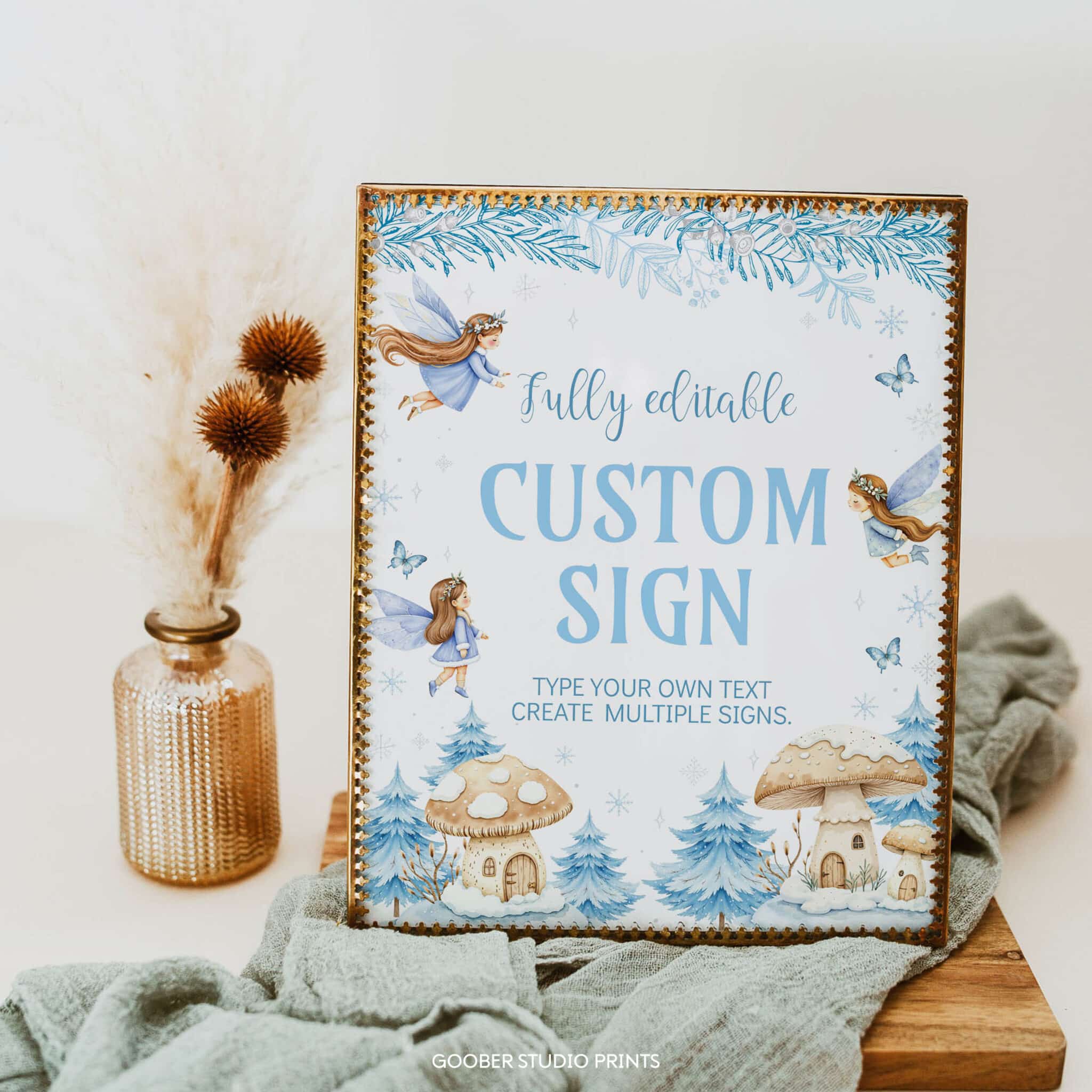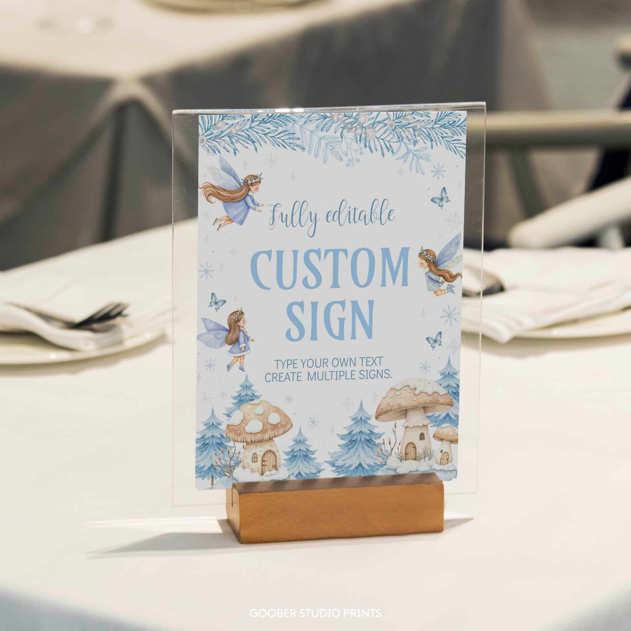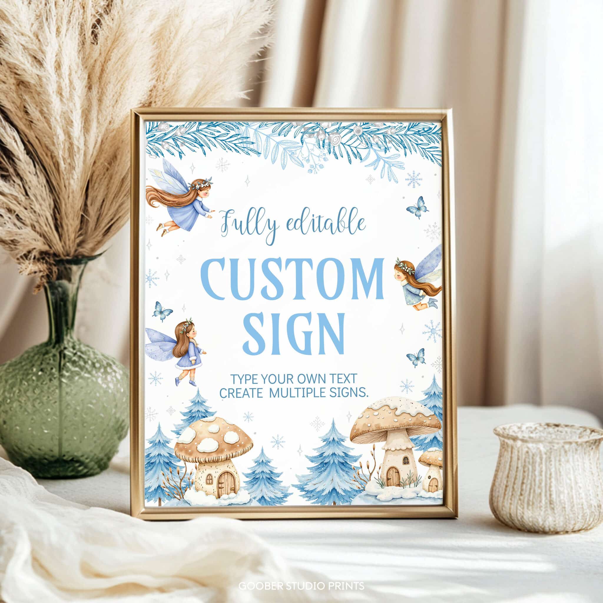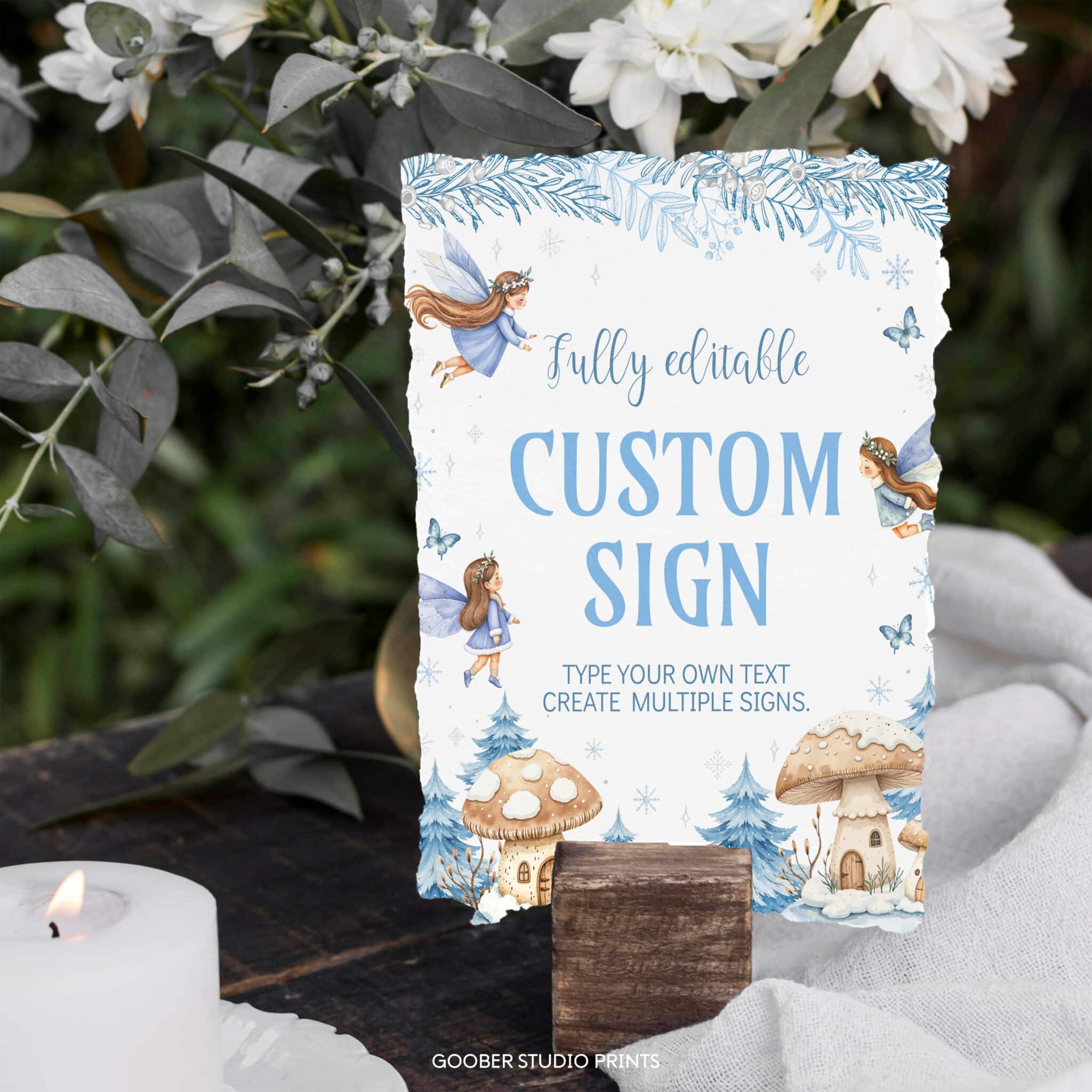 Add a personal touch to your decorations with our winter fairy birthday custom sign! Fully customizable, you can include any text, name, or age to suit your fairy birthday party. Perfect as a welcome sign, photo prop, or backdrop, this 8×10-inch design features delicate fairies, sparkling snowflakes, and an enchanted forest in a soft watercolor style. A whimsical addition to your winter onederland celebration, making your child’s winter birthday truly magical and unique.