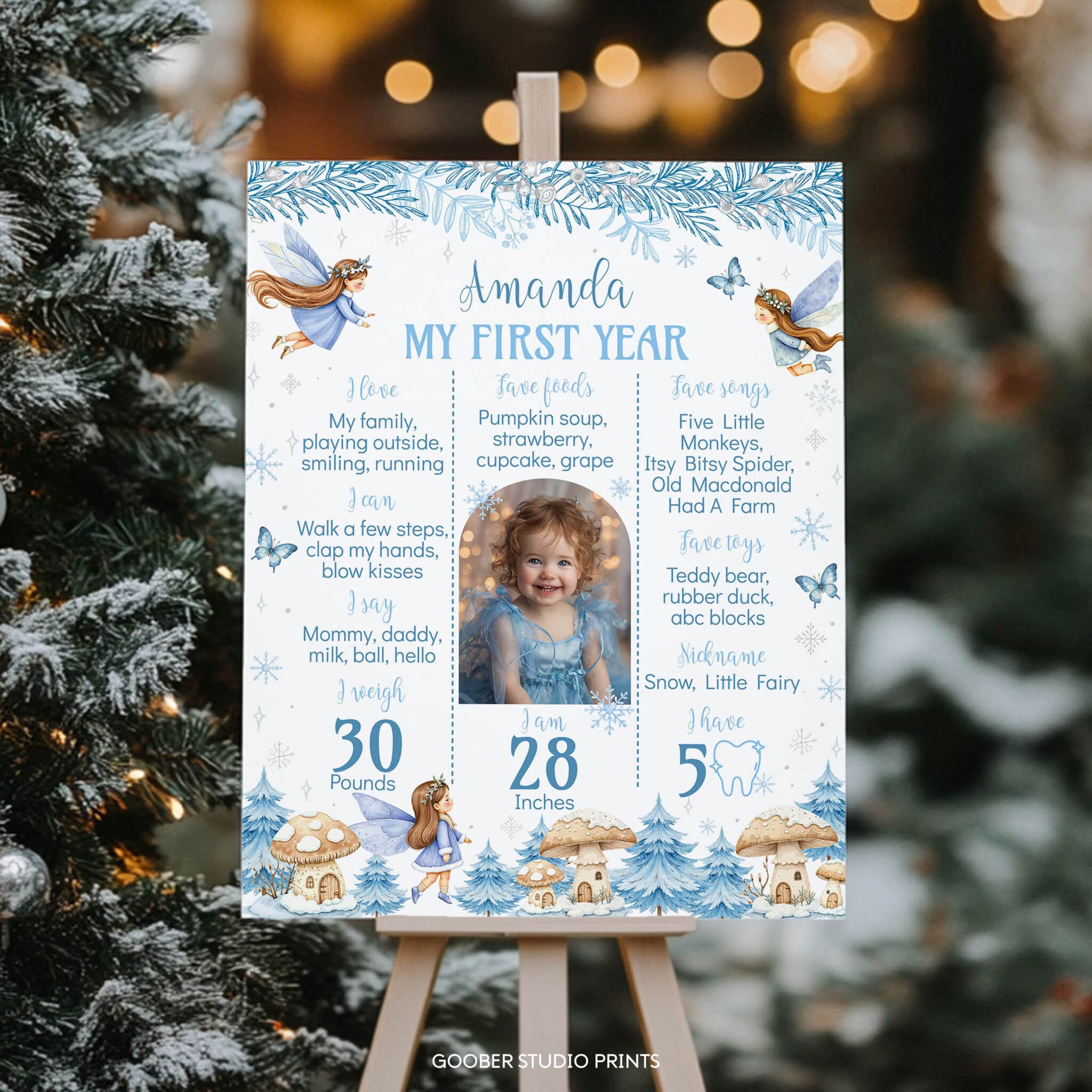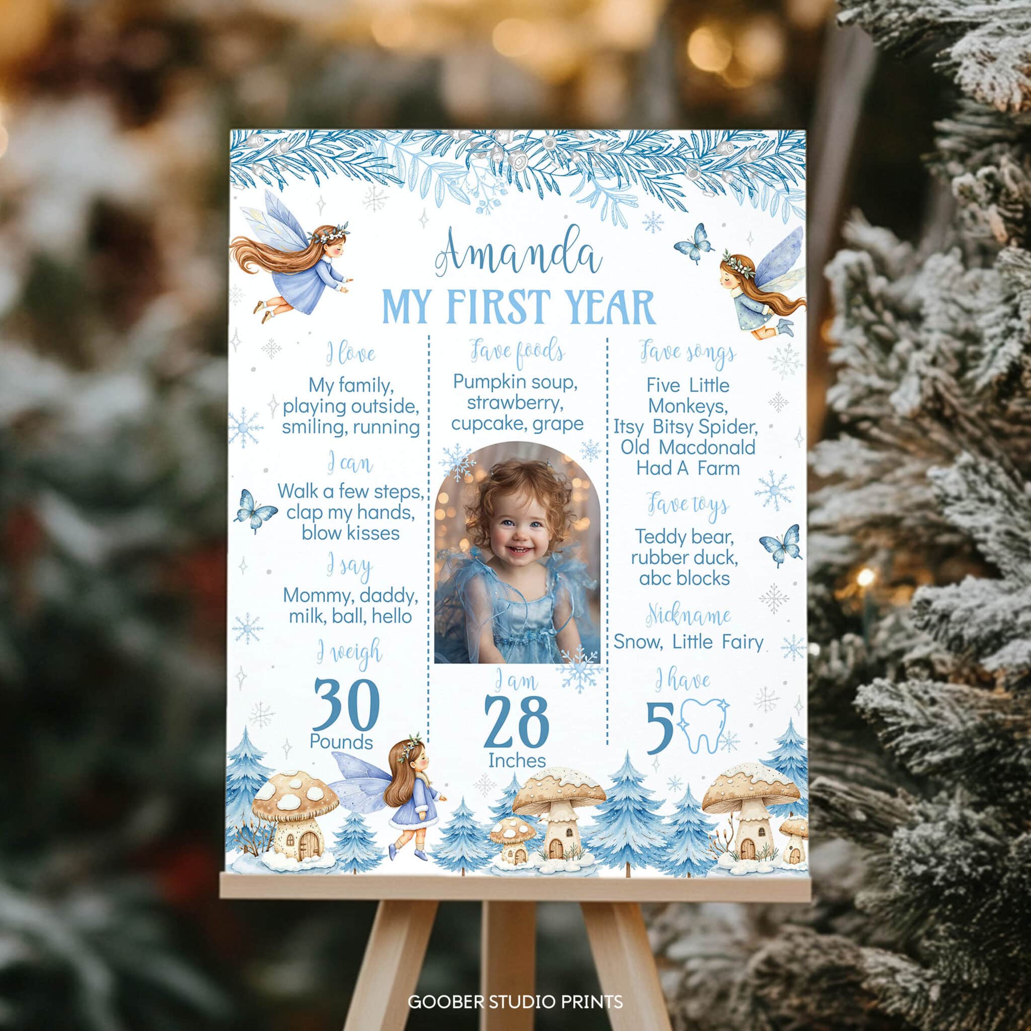 Capture the magic of your little fairy’s winter birthday with our winter fairy birthday milestone photo poster! Featuring delicate fairies, sparkling snowflakes, and an enchanted forest backdrop in a soft watercolor style, this poster includes space for your child’s name, special milestones, achievements, and cherished memories. Perfect for a whimsical fairy birthday party or charming winter onederland celebration, it’s easily printable at home on standard poster paper and makes a beautiful keepsake to treasure long after the celebration.