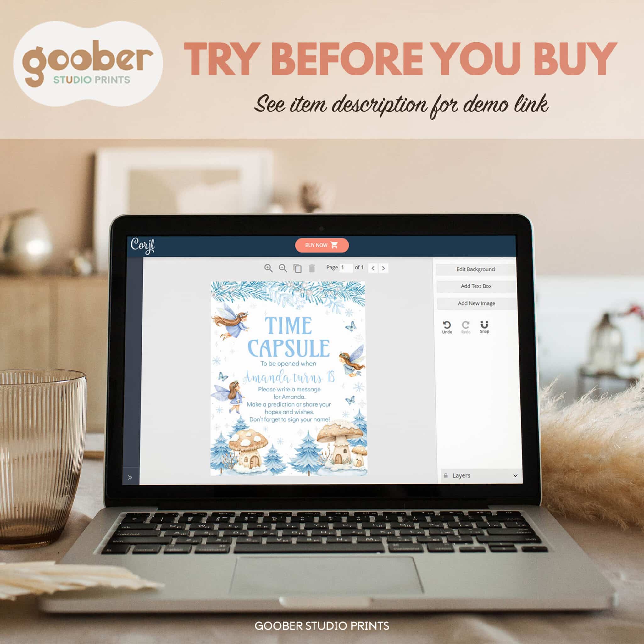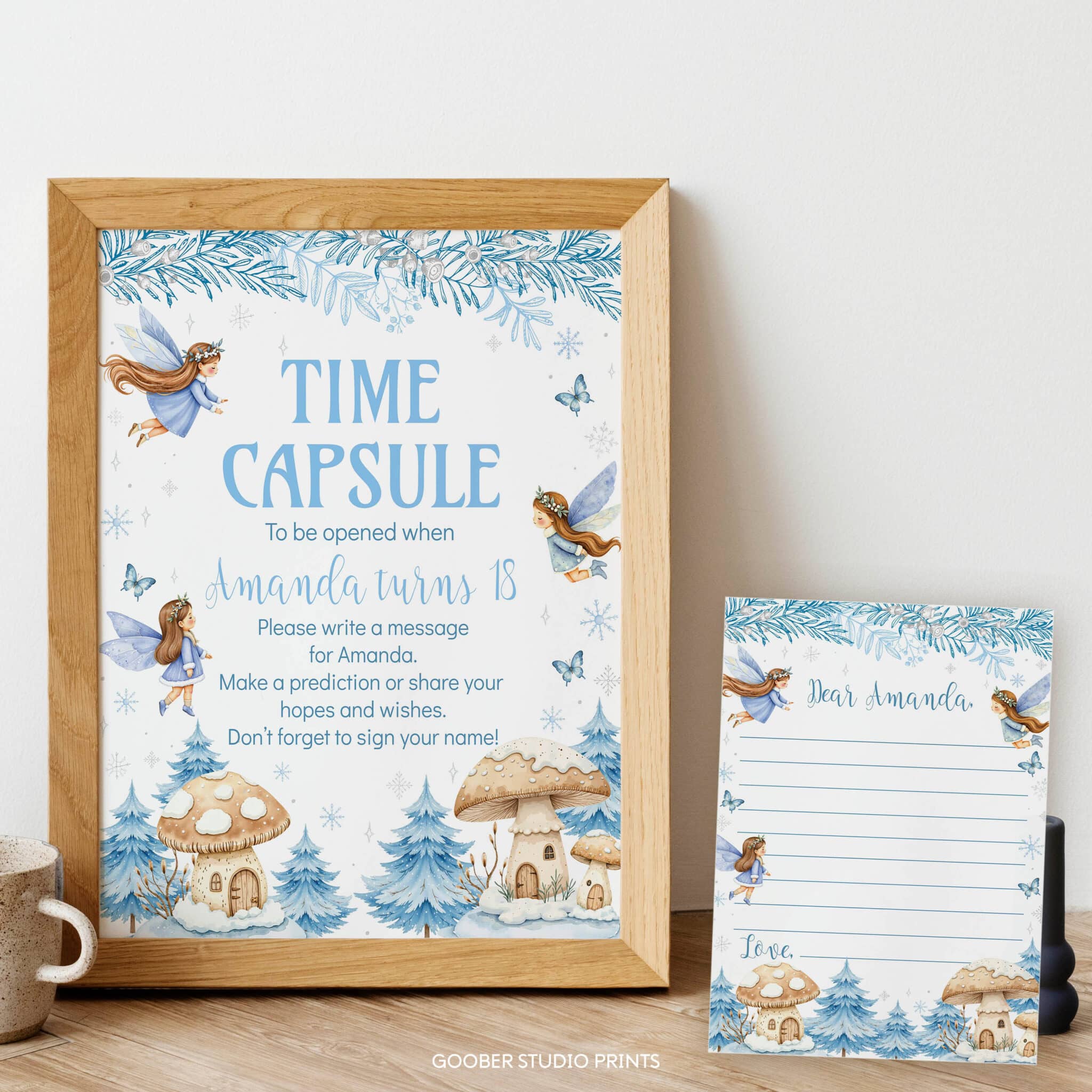 Create lasting memories with our winter fairy birthday time capsule set! Featuring delicate fairies, sparkling snowflakes, and an enchanted forest backdrop in a soft watercolor design, this set includes a time capsule sign and matching cards for guests to share wishes, memories, and predictions for your little one’s future. Perfect for displaying at a whimsical fairy birthday party or magical winter onederland celebration, it can be sealed as a treasured keepsake to be opened on a special future date—adding extra enchantment to your child’s winter birthday.