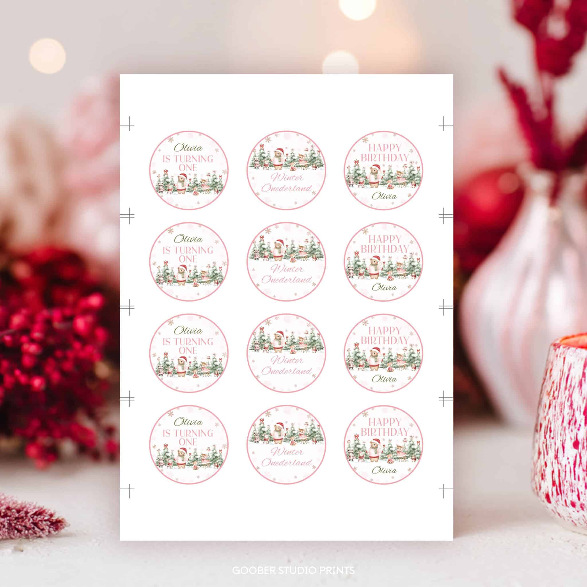Add a magical touch to your desserts with our winter onederland cupcake toppers! Featuring adorable woodland animals, shimmering snowflakes, festive Christmas accents, and charming snowy forest details, these toppers are perfect for celebrating your little girl’s winter birthday. Personalize with your child’s name and age, then print at home on standard cardstock to decorate cupcakes, cake pops, muffins, and more. A fun, whimsical, and budget-friendly way to bring snowy charm to your winter onederland party!
