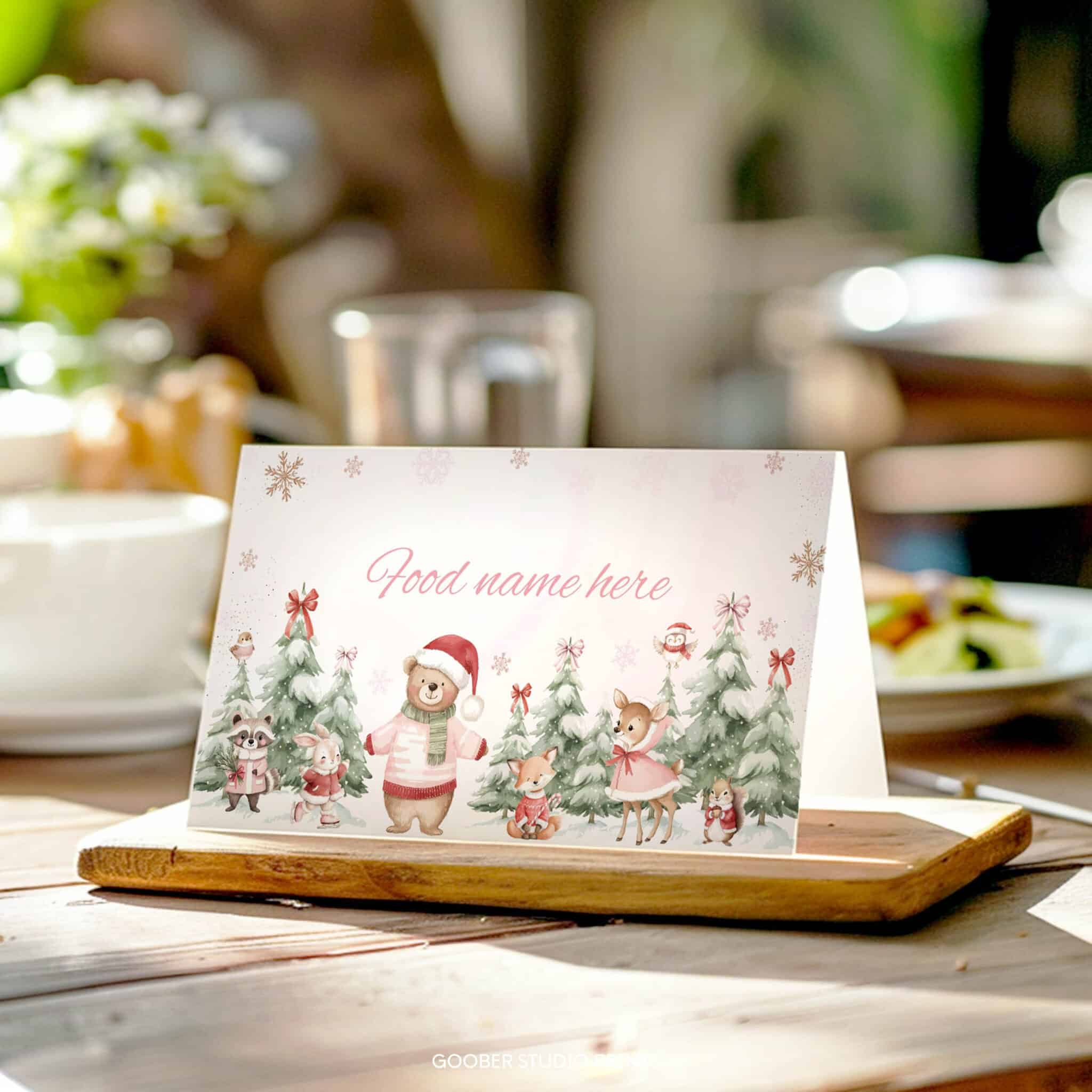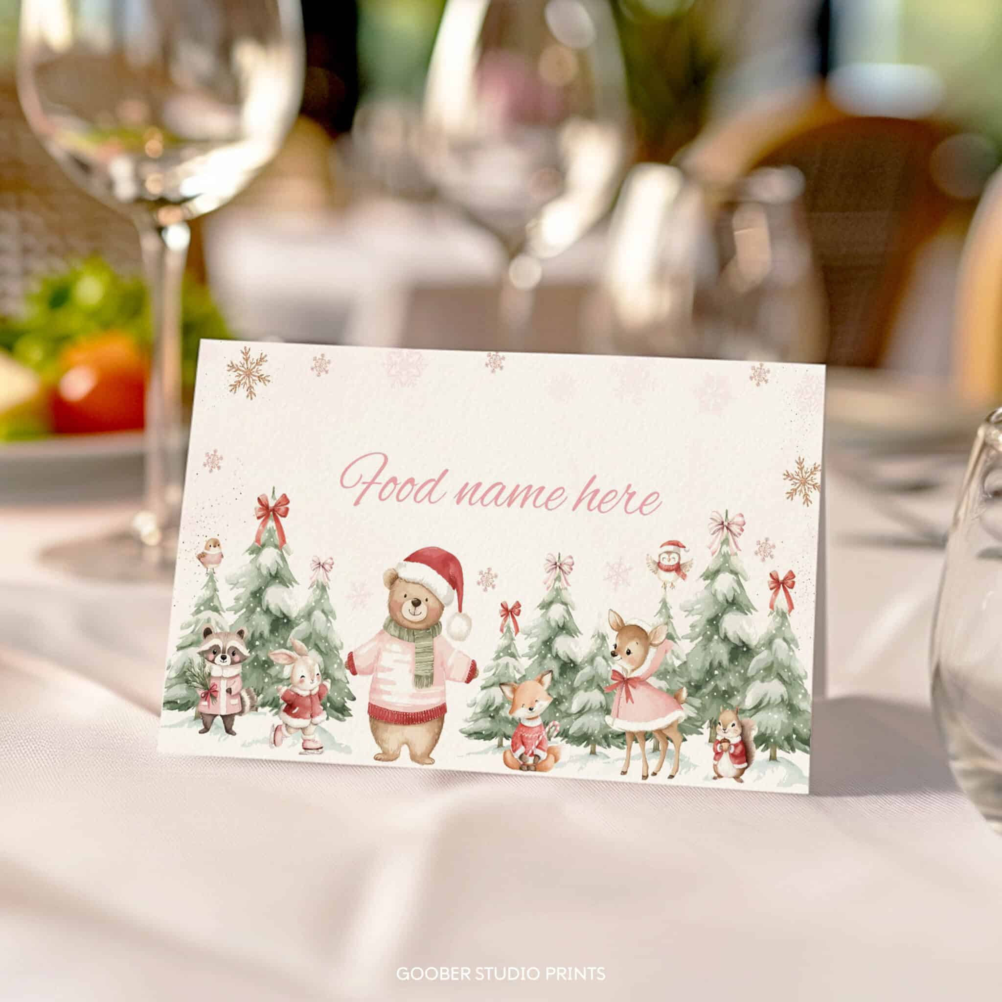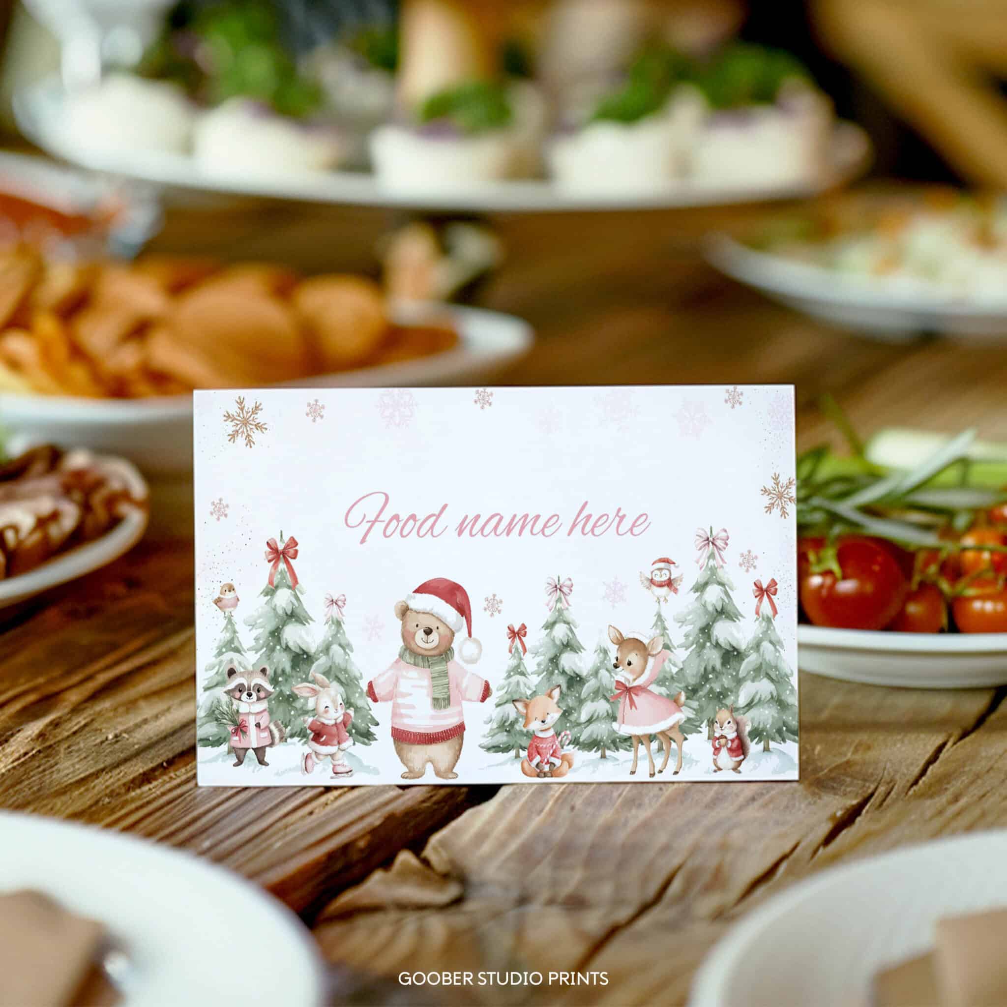 Bring cozy charm to your party table with our winter onederland food tent cards! Featuring adorable woodland animals, shimmering snowflakes, festive Christmas accents, and peaceful snowy forest details, these cards add a delightful touch to your little girl’s winter birthday celebration. Perfect for labeling dishes, drinks, or desserts, they’re easy to customize and print at home on standard cardstock. A practical, festive, and budget-friendly way to elevate your winter onederland party décor!