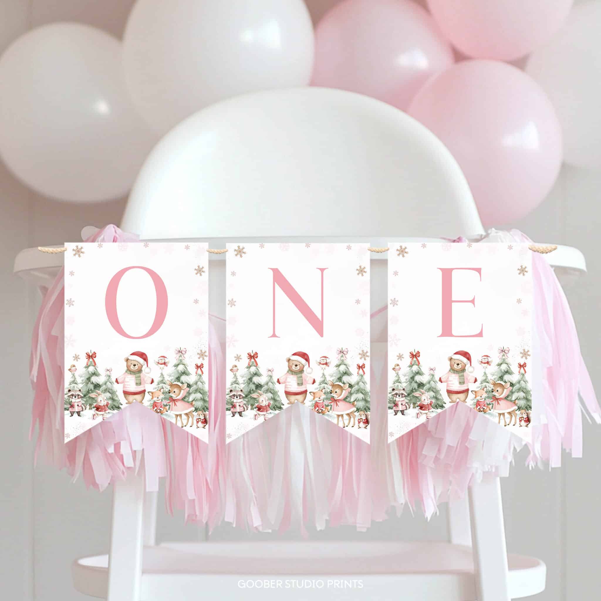 Make your little girl’s winter birthday extra special with our adorable winter onederland highchair banner! Featuring playful woodland animals, sparkling snowflakes, festive Christmas accents, and cozy snowy forest details, this charming banner spells out “one” in soft, whimsical lettering. Perfect for highlighting your baby’s milestone moment, it turns the highchair into a magical party centerpiece. Easy to print at home, it’s a sweet and budget-friendly addition to your winter onederland celebration!