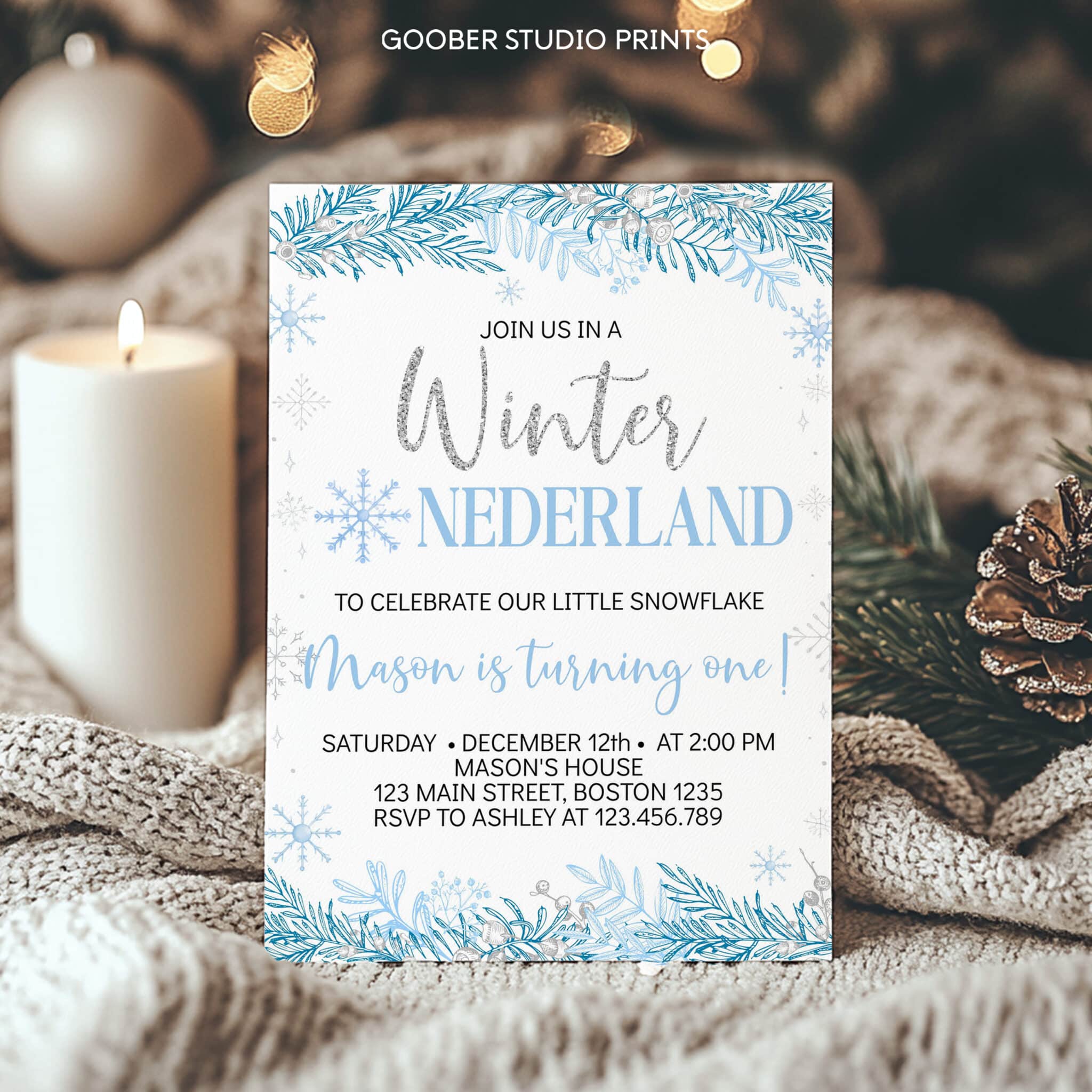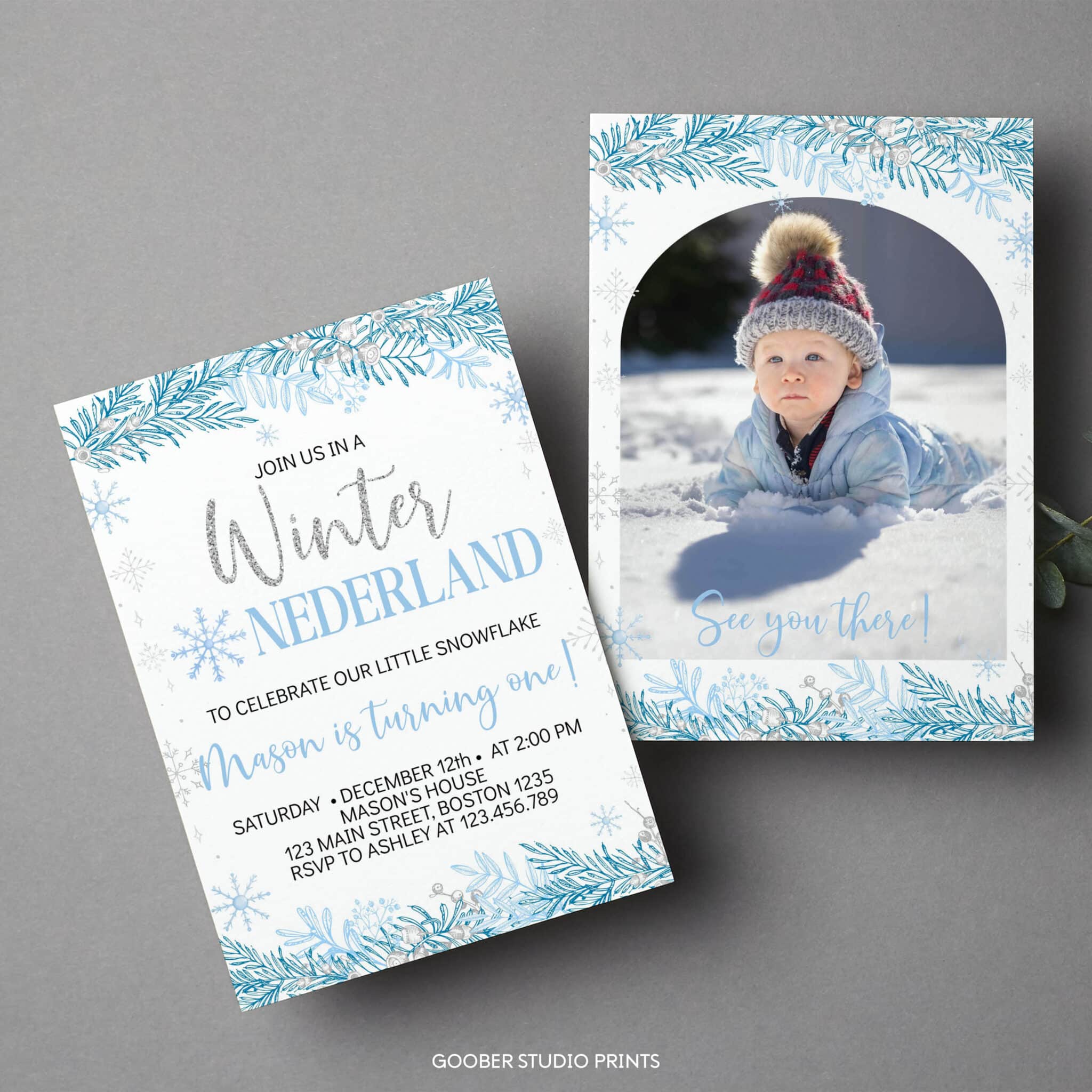 Bring the sparkle of the season to your celebration with our winter onederland birthday invitation! Adorned with shimmering silver accents and delicate snowflakes, this enchanting design sets the perfect tone for your little boy’s winter birthday in a magical winter wonderland theme. Easily customizable with your child’s name, age, and event details, this printable invitation adds a touch of seasonal sparkle to your celebration.