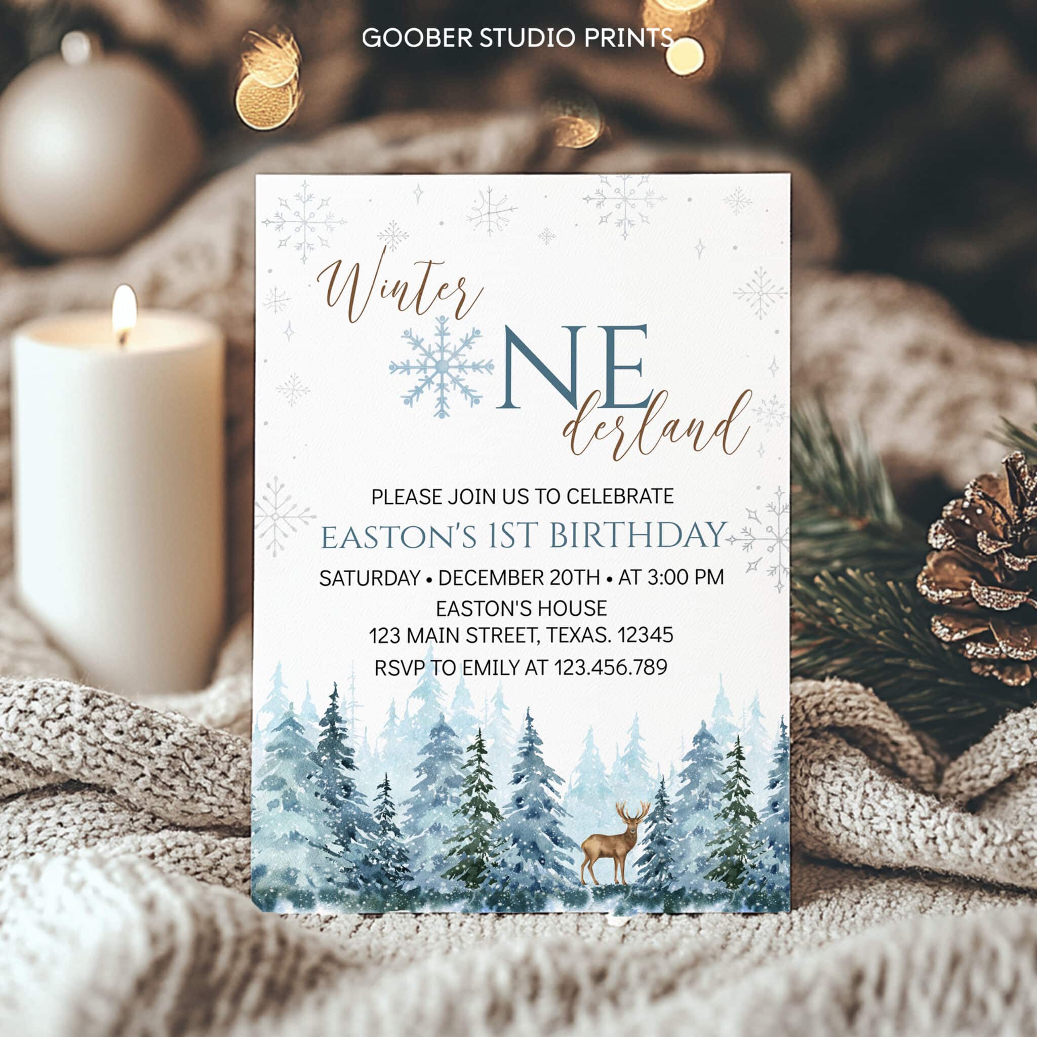 Celebrate your little boy’s special day with our winter onederland birthday party invitation! This charming design features playful reindeer, snowy trees, and frosty details, capturing the magic of a winter wonderland. Perfect for a boy birthday celebration, this invitation sets the tone for a fun-filled winter onederland theme. With plenty of space to customize all your party details, it’s easy to personalize and print at home, making it a convenient and budget-friendly choice for your child’s unforgettable winter birthday.