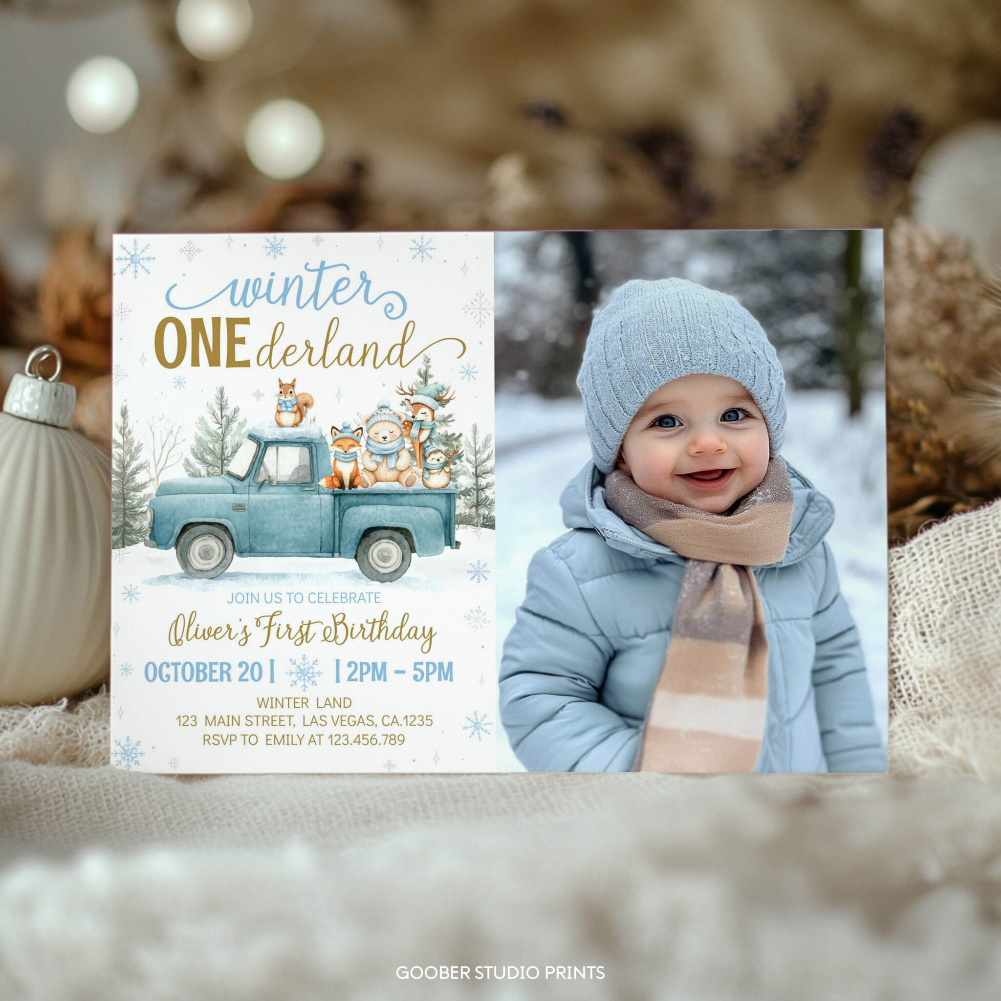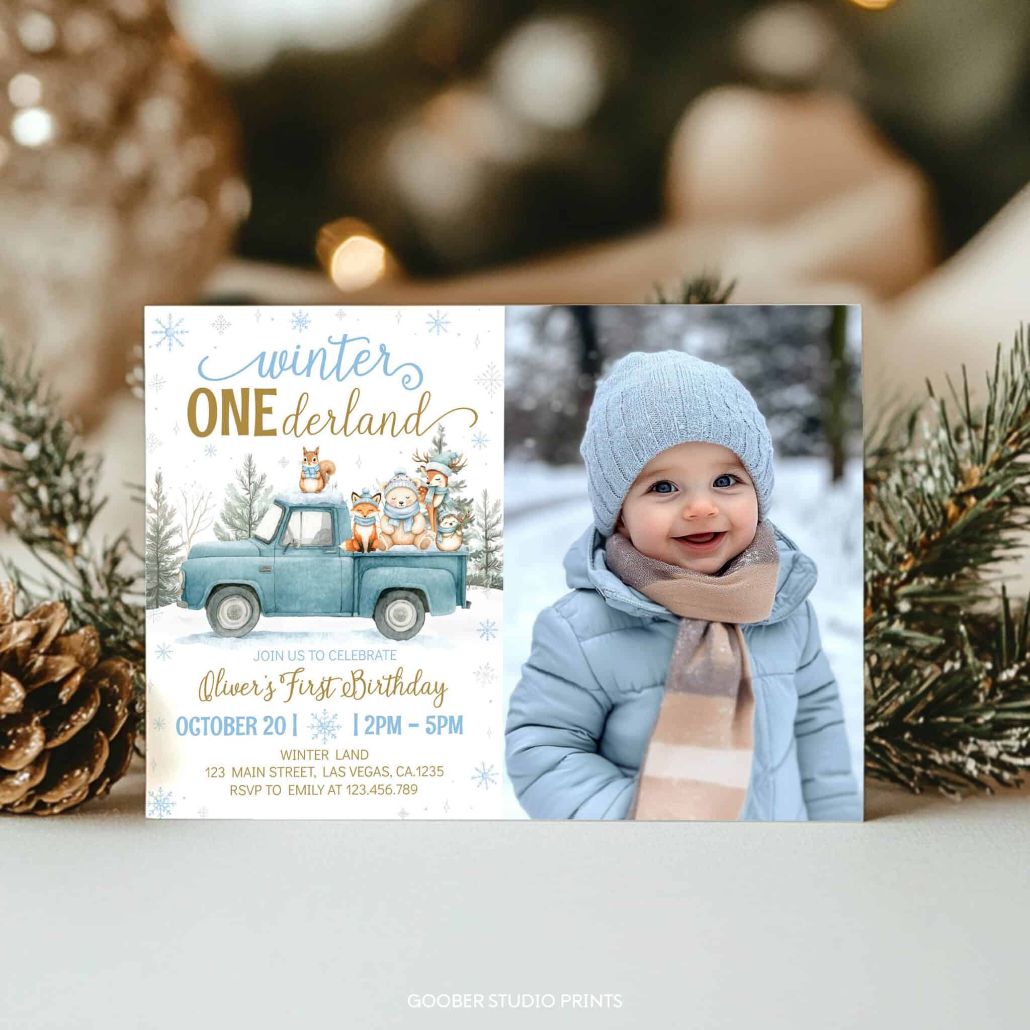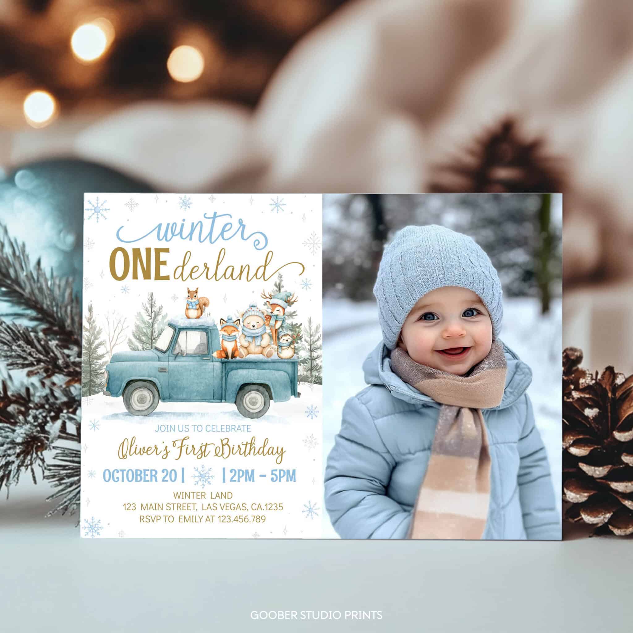 Share the joy of your little one’s special day with our winter onederland photo invitation! Designed with a cute blue truck, playful woodland animals, sparkling snowflakes, and peaceful winter forest accents, this charming design beautifully captures the magic of a snowy winter birthday. Easily personalize with your child’s name, age, date, time, and location to create a one-of-a-kind invite. Perfect for printing at home, it’s an affordable and heartwarming way to set the tone for a cozy and unforgettable winter onederland celebration.